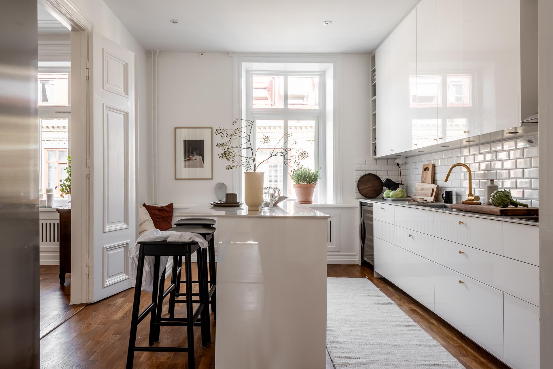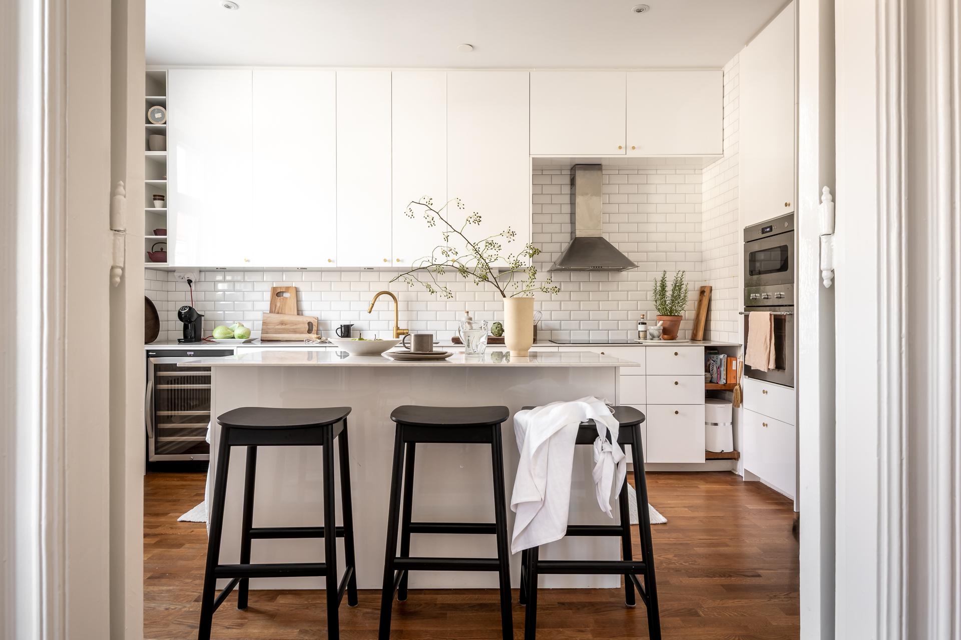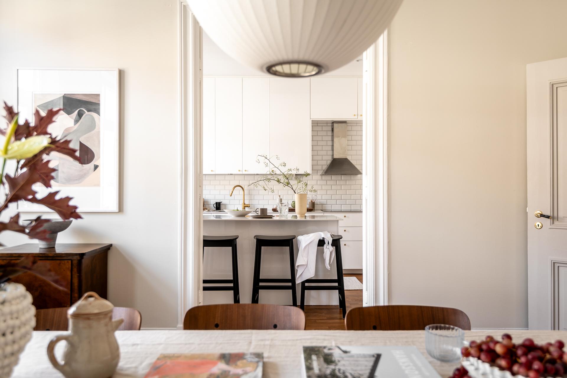 Moderna och rena linjer skapar en stilmässig övergång som rimmar fint med takhöjden och de vackra siktlinjerna. I köket är det rejält tilltaget med arbetsyta och det finns inget att klaga på när det gäller förvaringsmöjligheterna, skåpen sträcker sig hela vägen upp mot tak samt köket erbjuder en generöst tilltagen, praktiskt likaså elegant köksö. Bänkskivan i ljusgrå Silestone (kvartskomposit) går fint ihop med de vita skåpen.