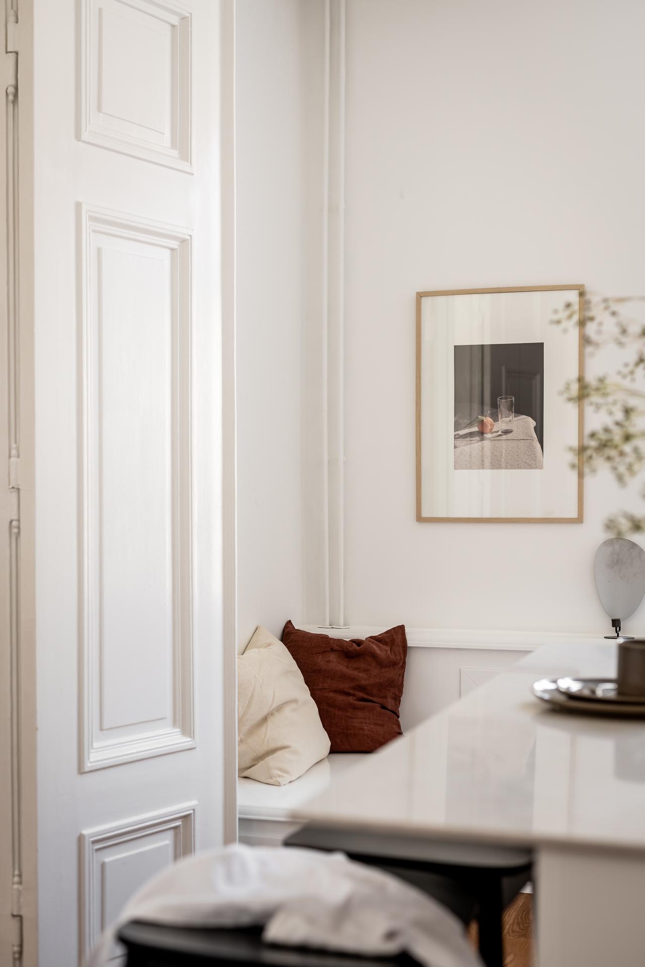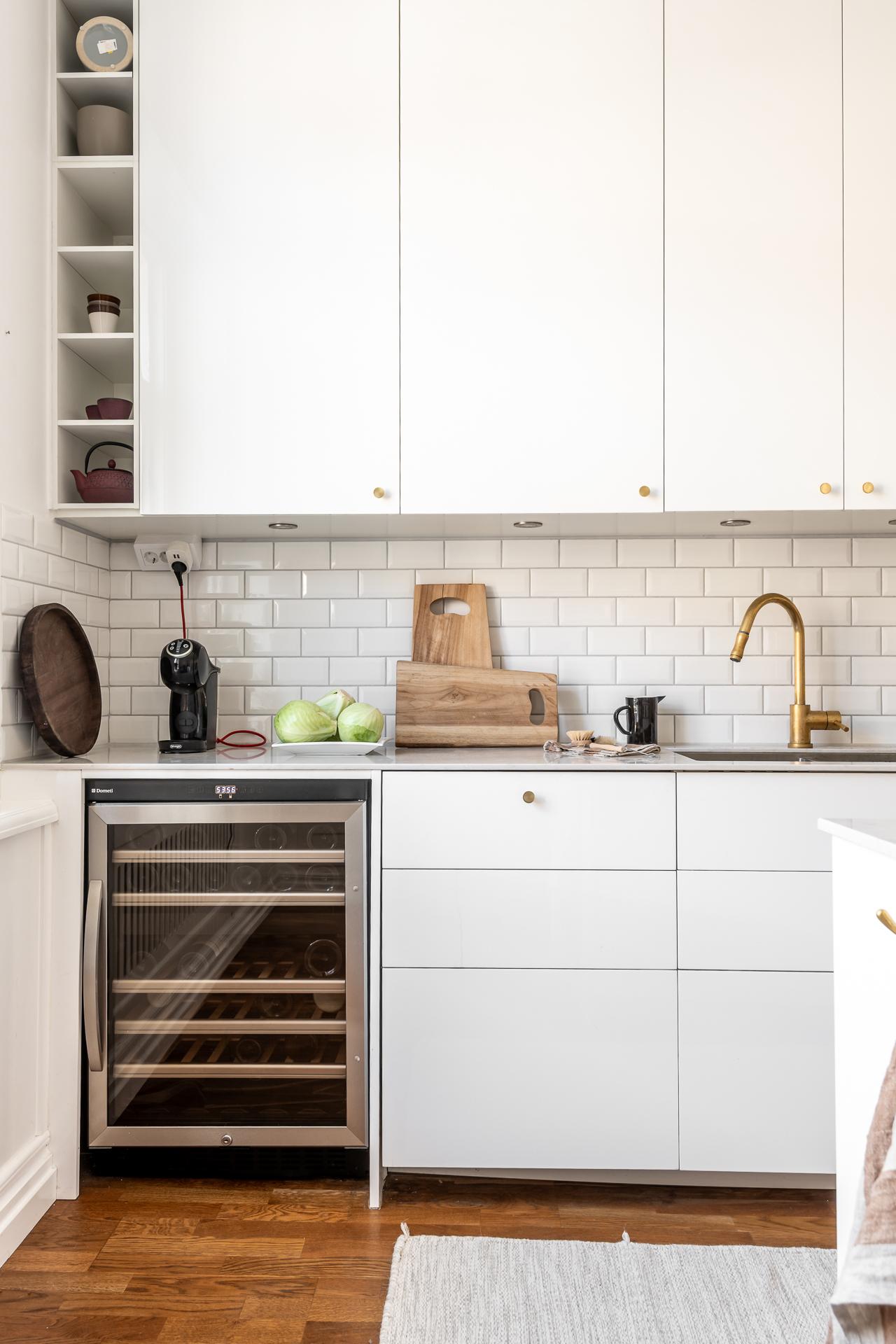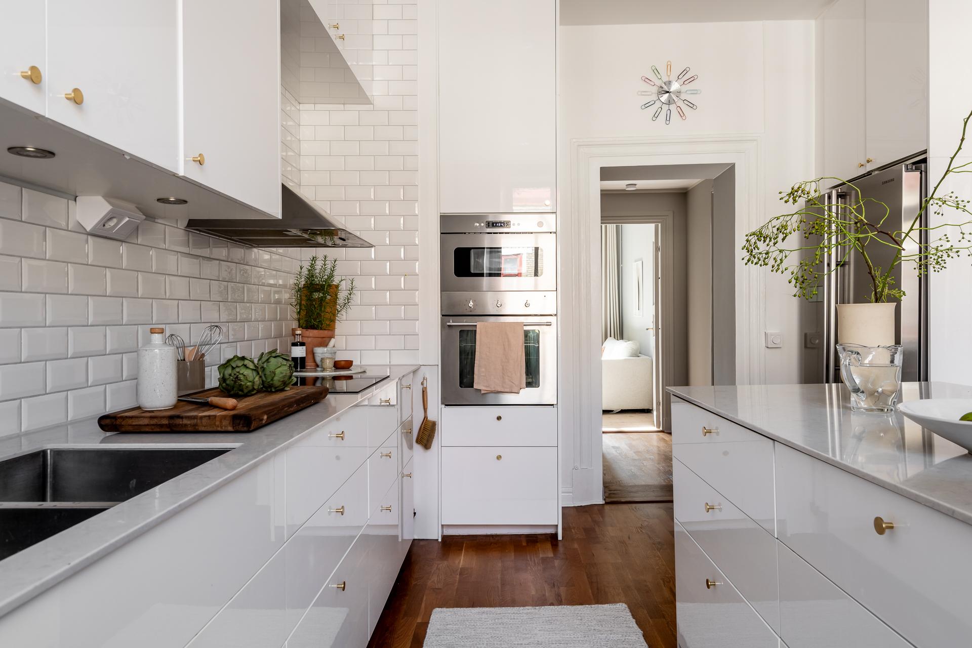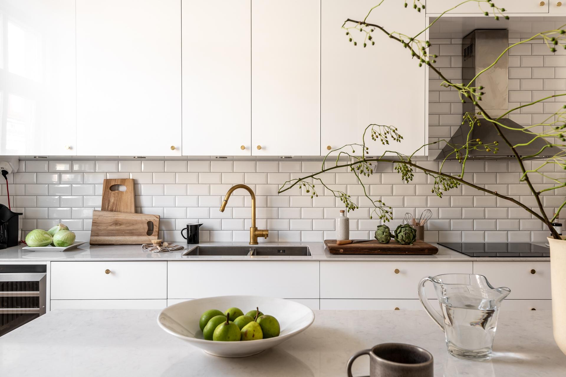 Moderna och rena linjer skapar en stilmässig övergång som rimmar fint med takhöjden och de vackra siktlinjerna. I köket är det rejält tilltaget med arbetsyta och det finns inget att klaga på när det gäller förvaringsmöjligheterna, skåpen sträcker sig hela vägen upp mot tak samt köket erbjuder en generöst tilltagen, praktiskt likaså elegant köksö. Bänkskivan i ljusgrå Silestone (kvartskomposit) går fint ihop med de vita skåpen.