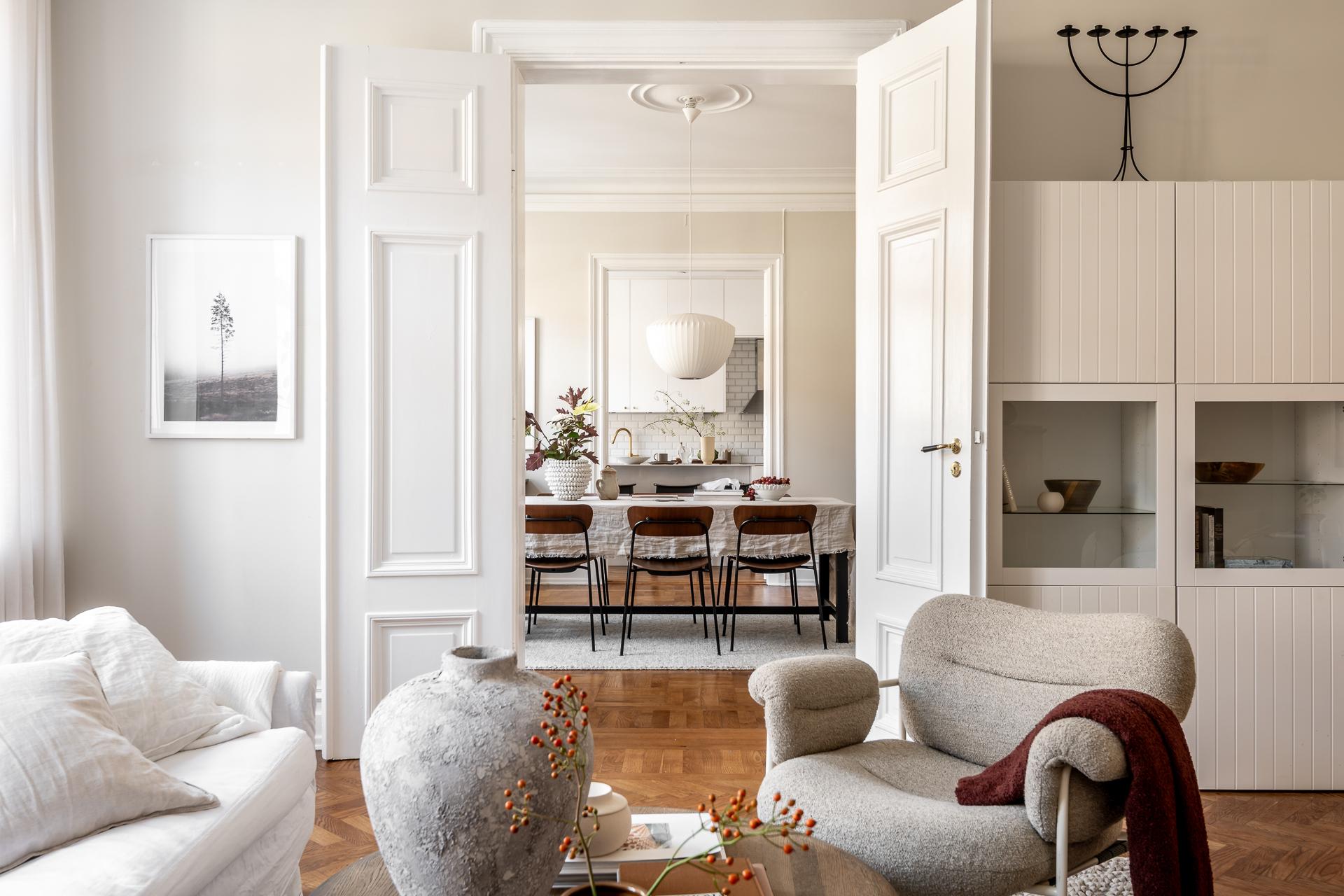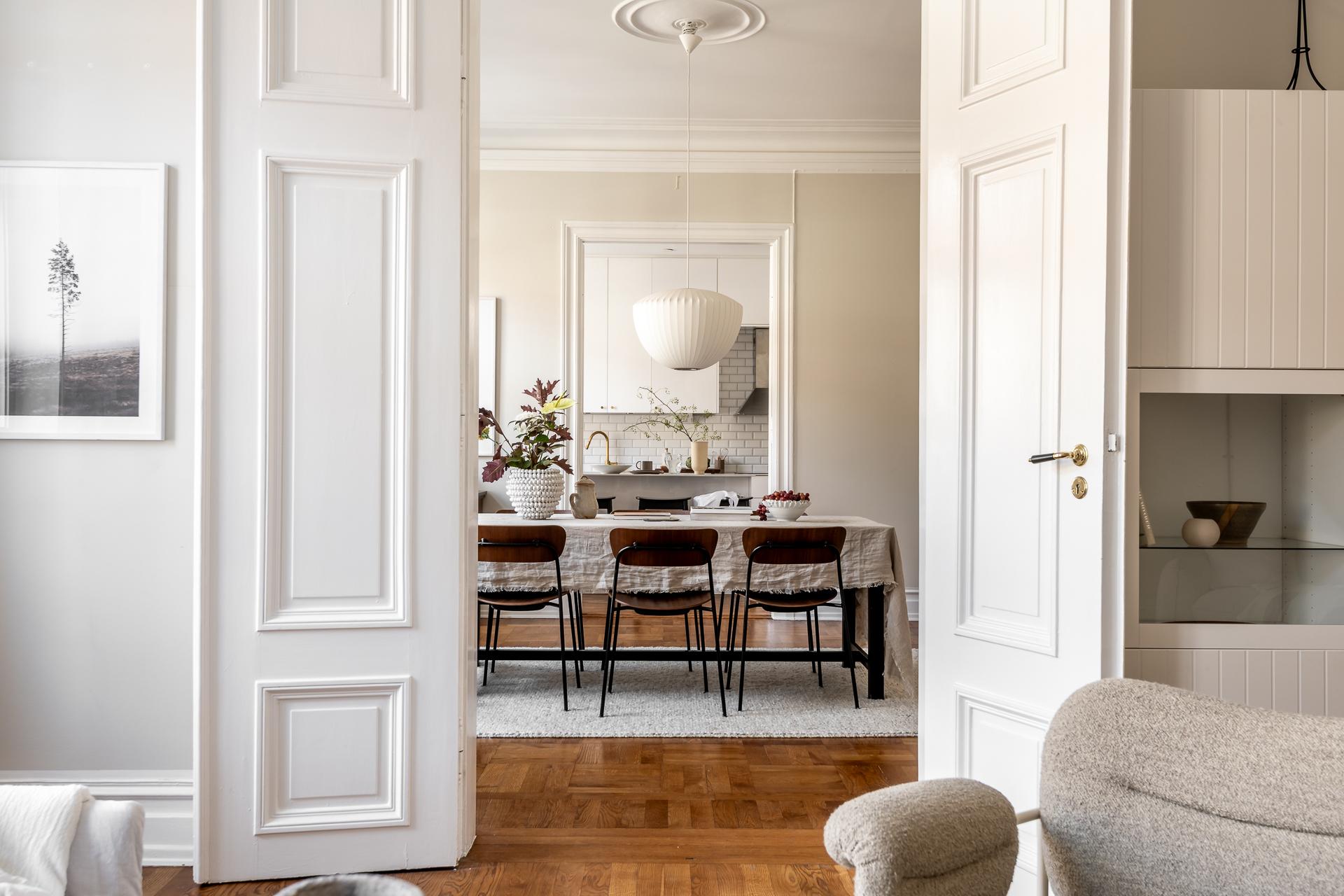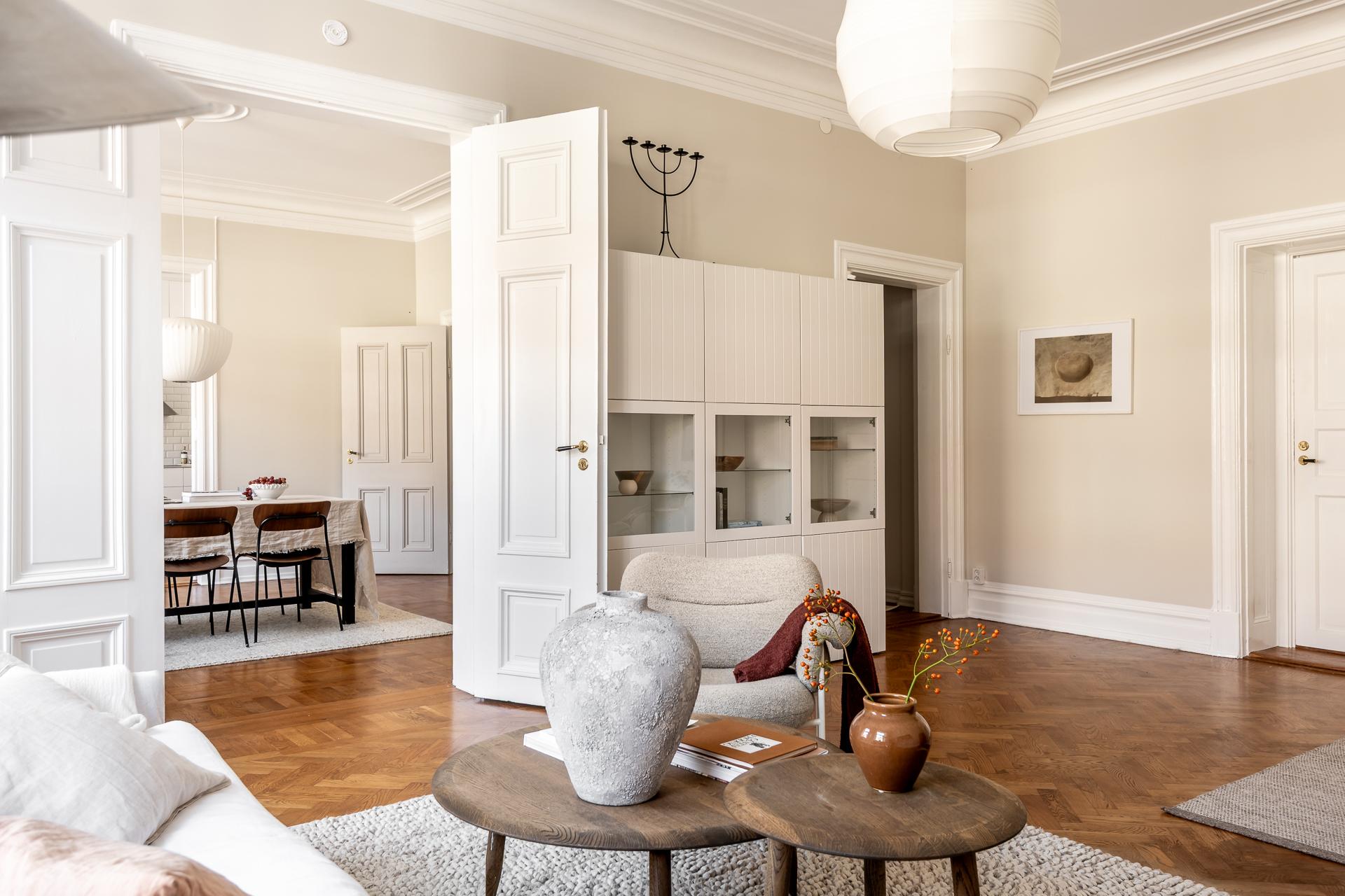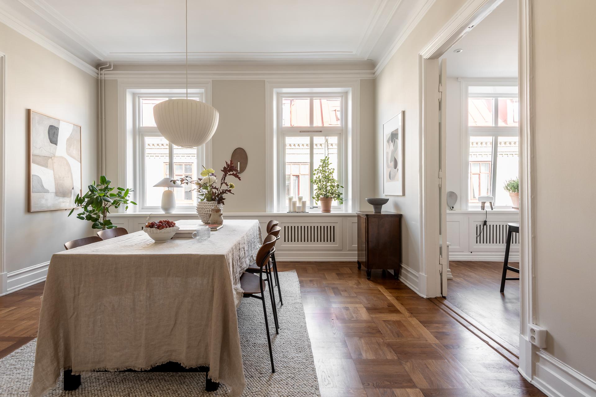Klassisk fiskbensparkett i oljad ek löper tröskelfritt mellan rummen.