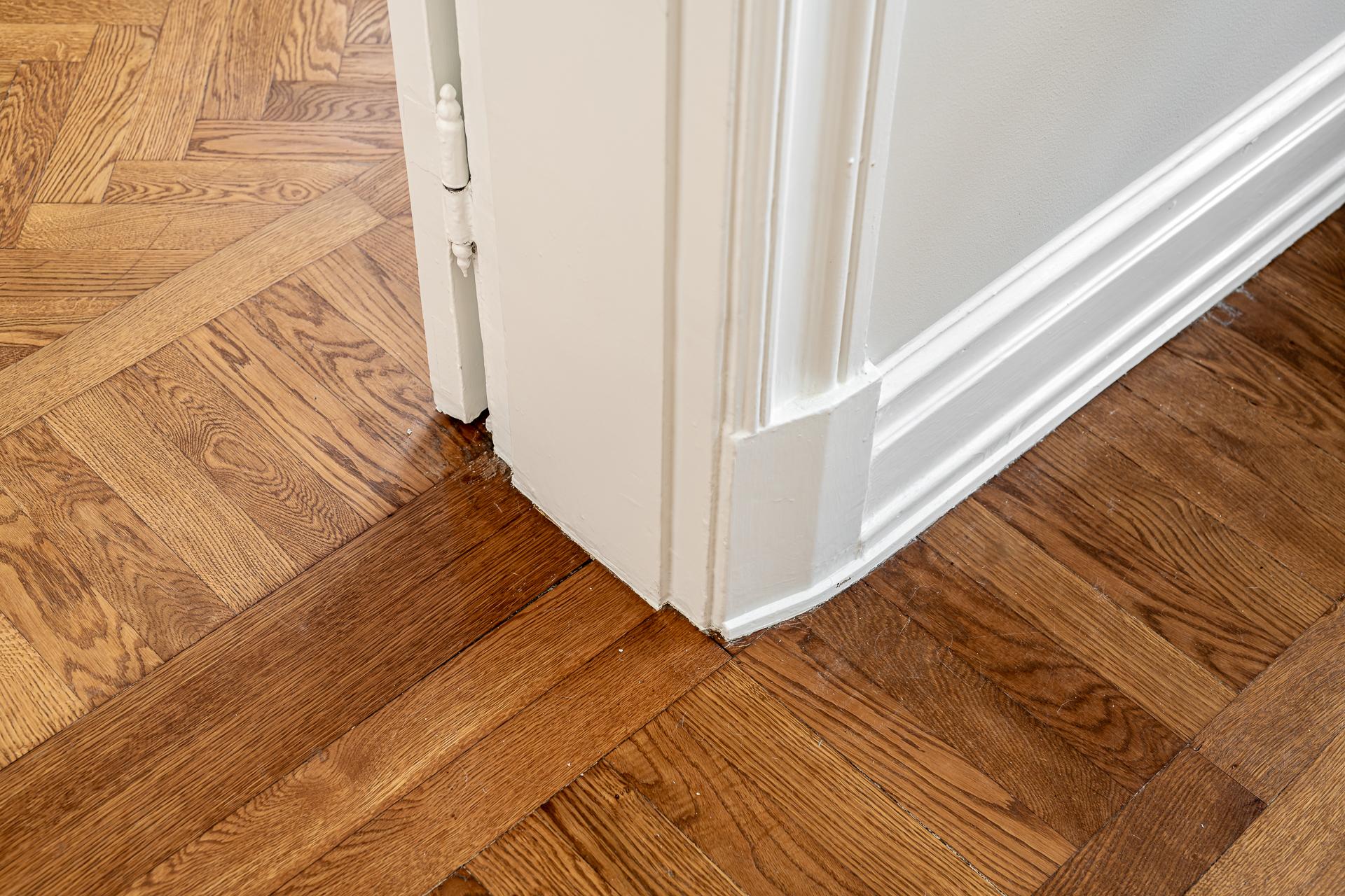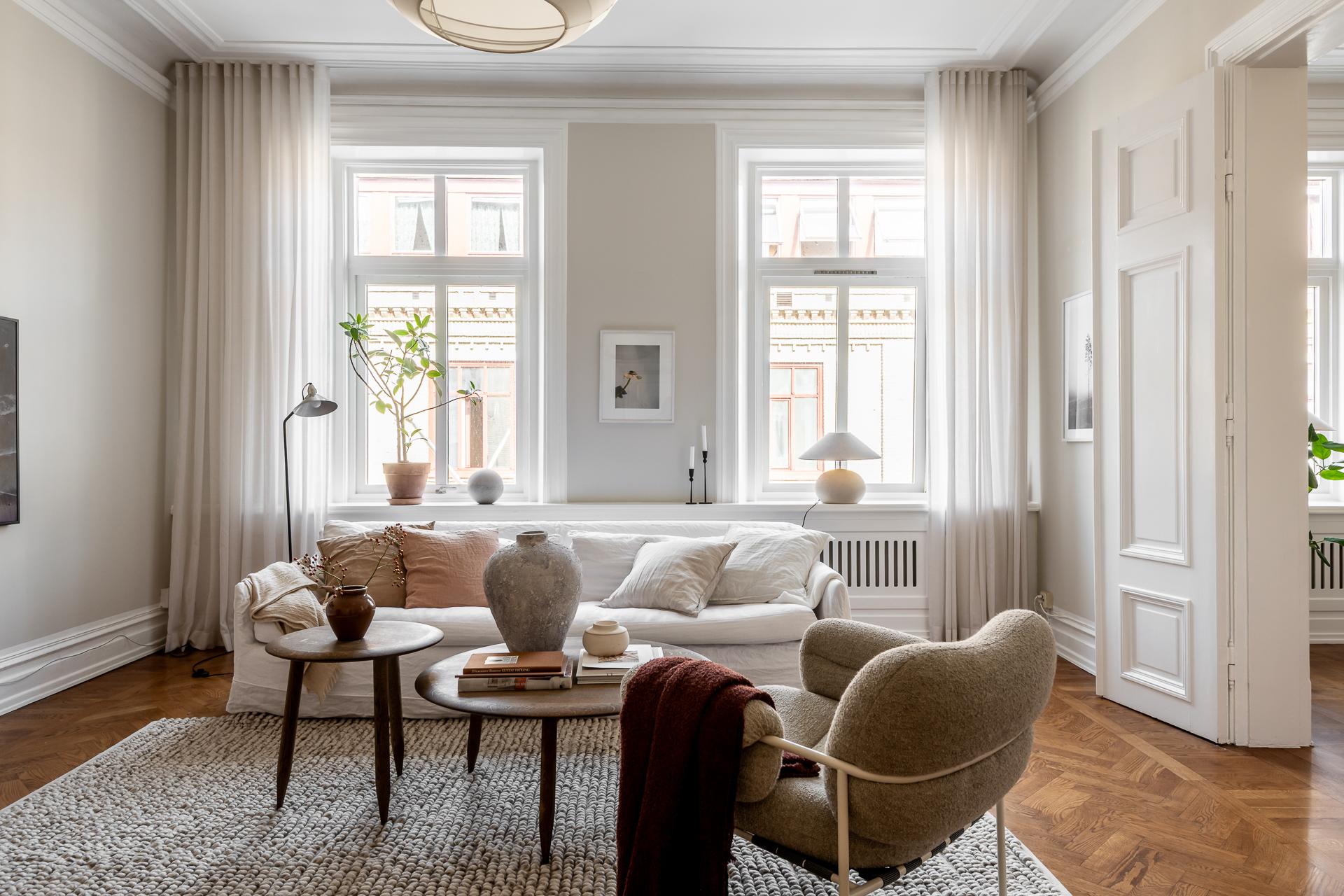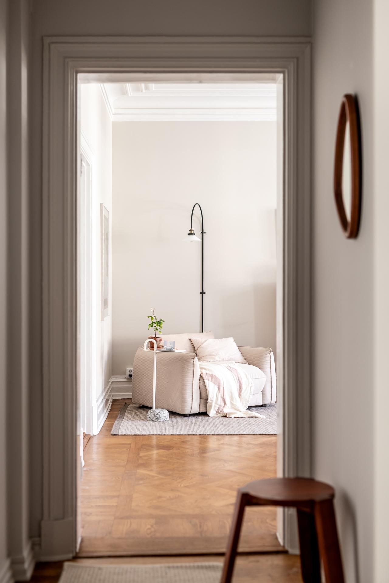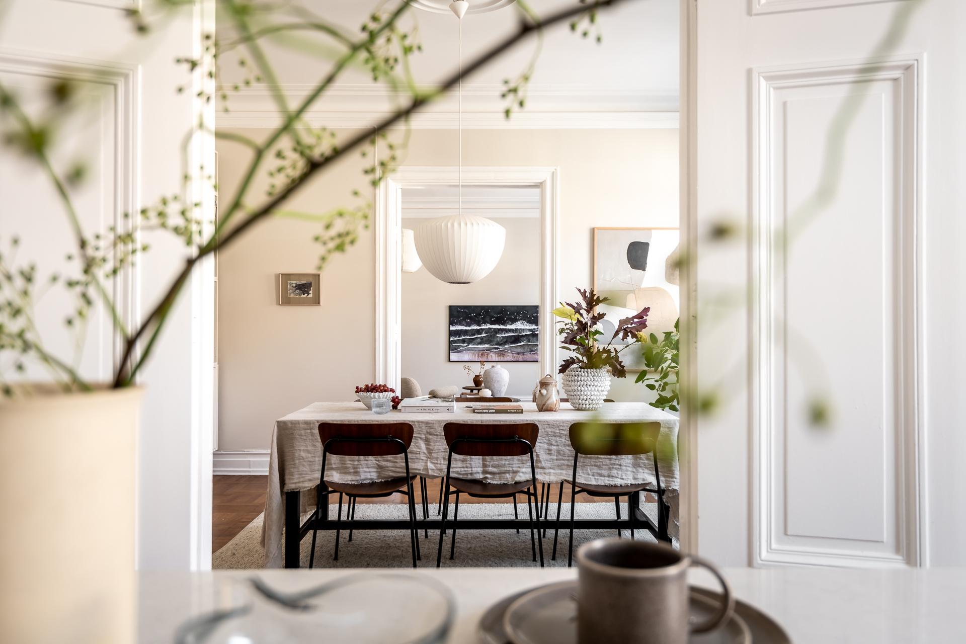 Klassisk fiskbensparkett i oljad ek löper tröskelfritt mellan rummen.