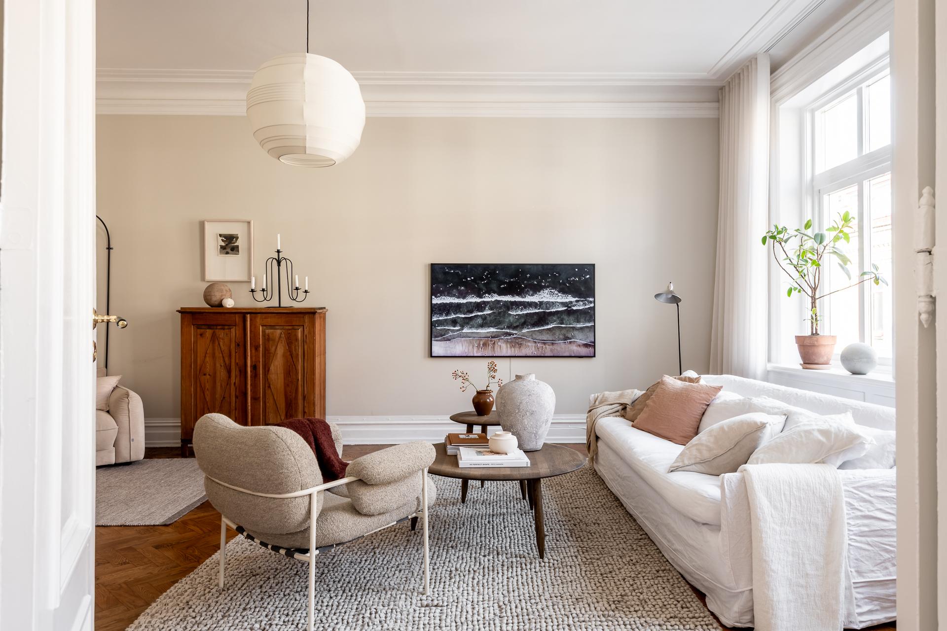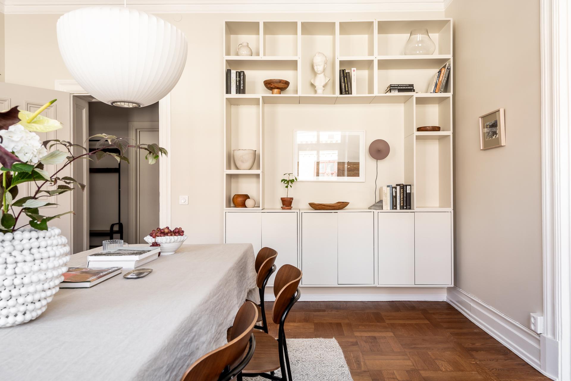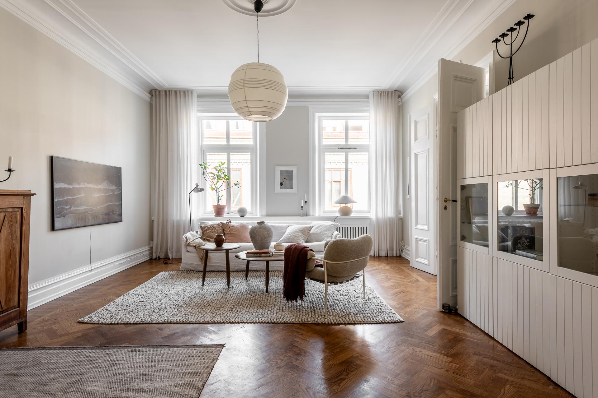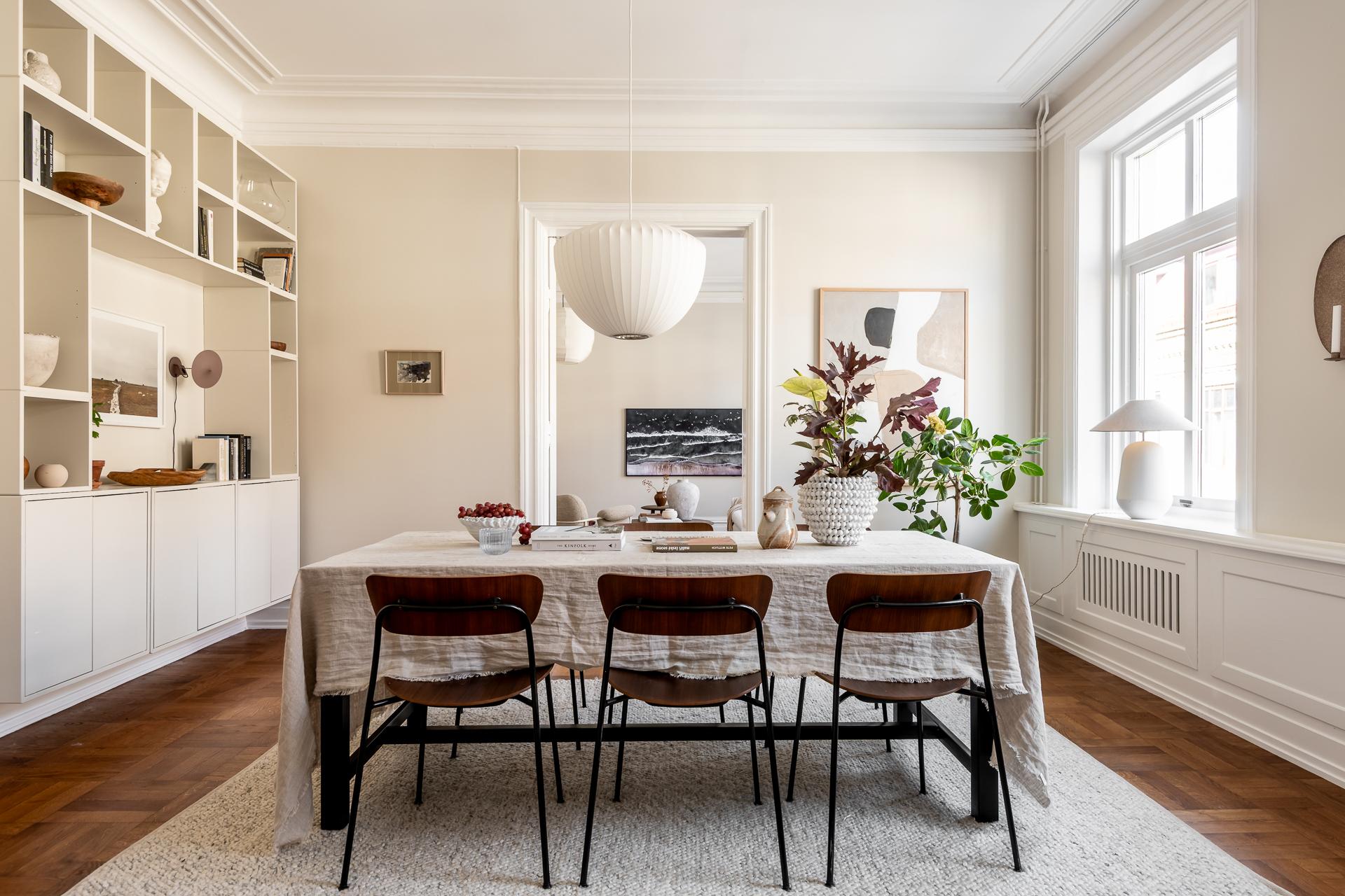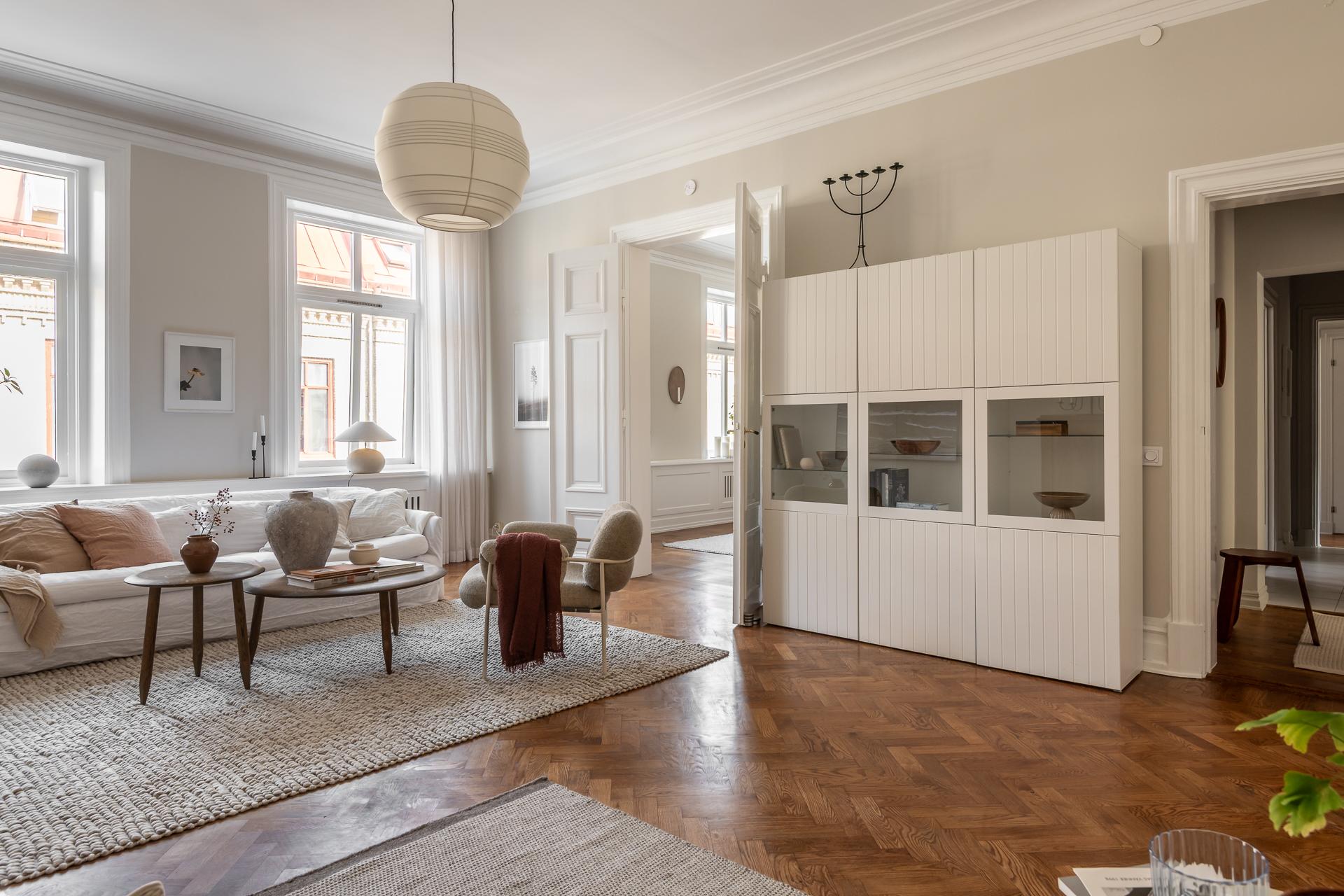 Rakt fram öppnar sig en av de tre sekelskiftessalongerna i fil. Våningen har en representativ och mycket social planlösning med vardagsrum, matsal och kök ut mot den enkelriktade Bellmansgatan. Interiören verkligen överraskar med ett oslagbart ljusinsläpp och kryllar bokstavligt talat med detaljer från vårt förra sekelskifte.