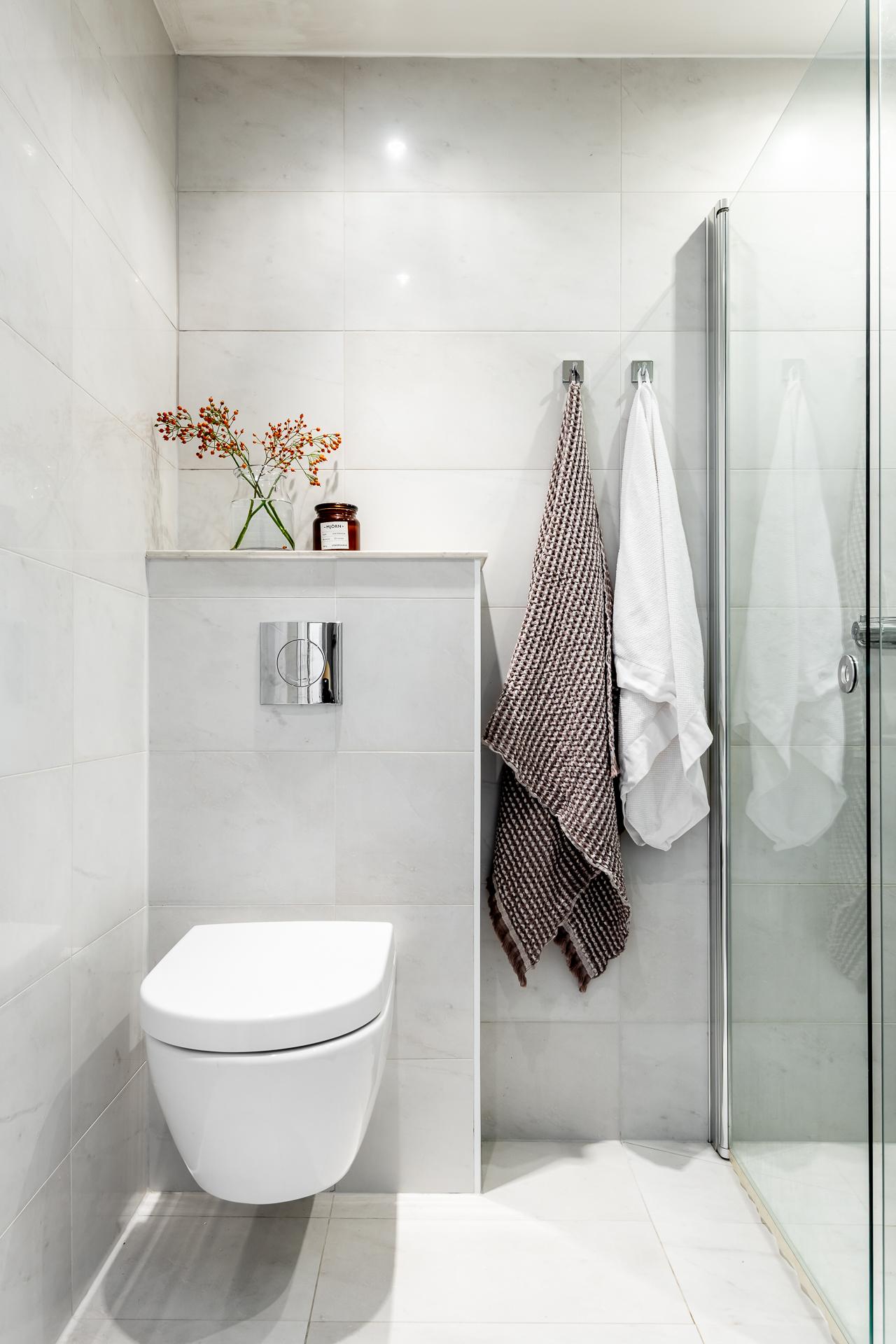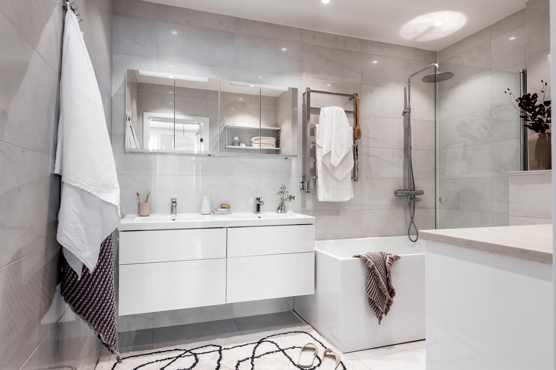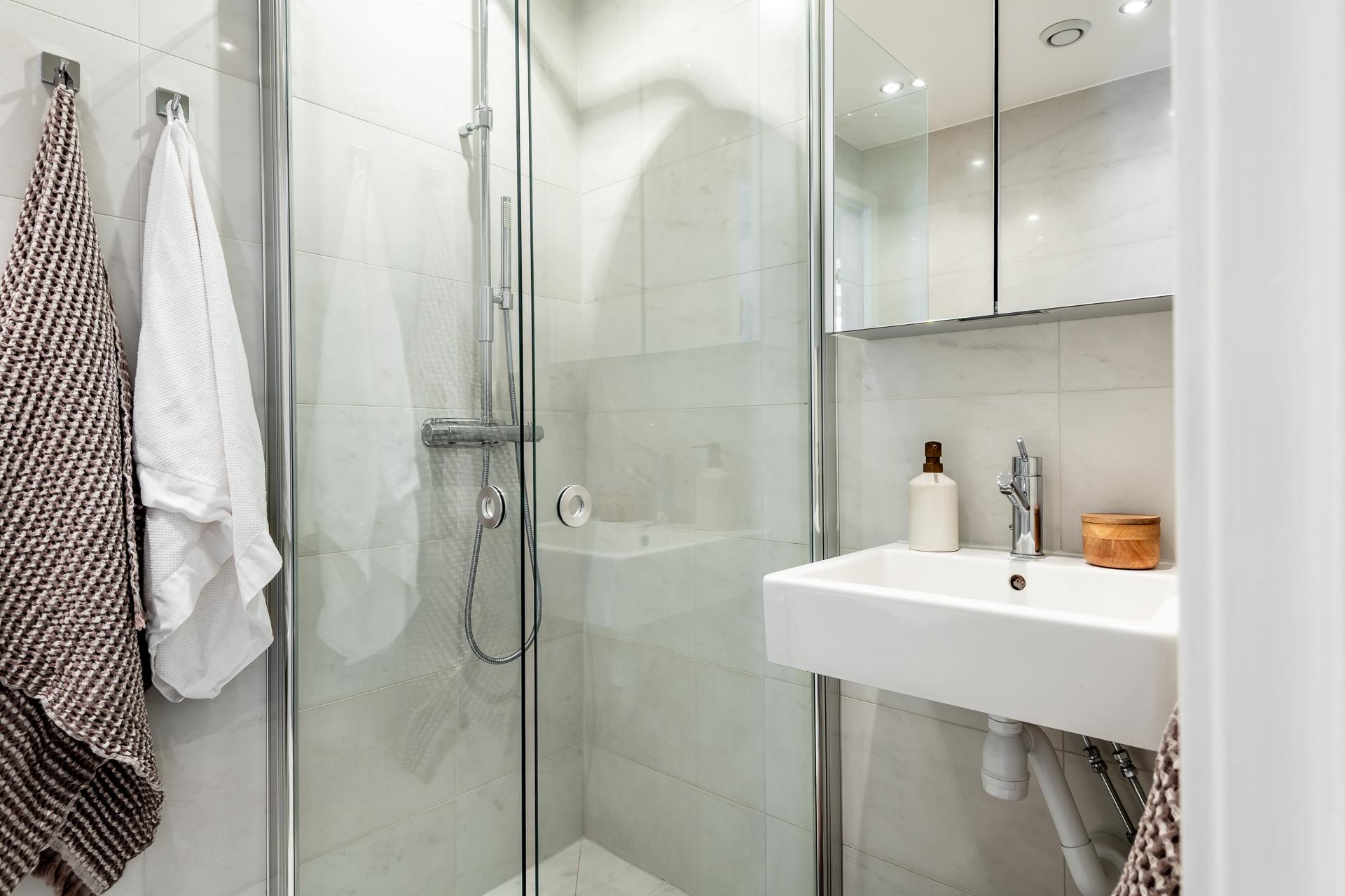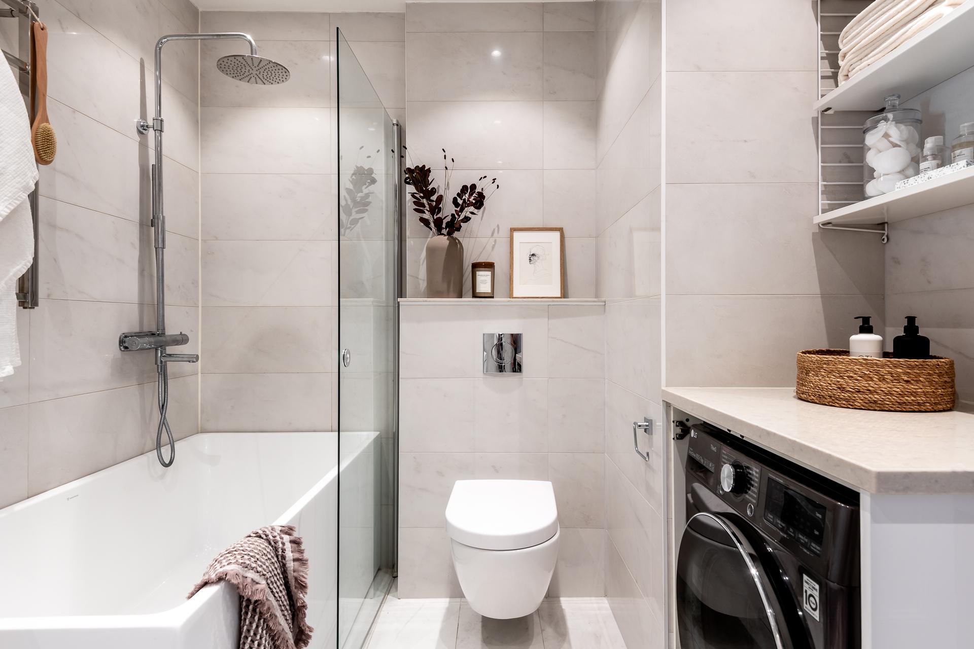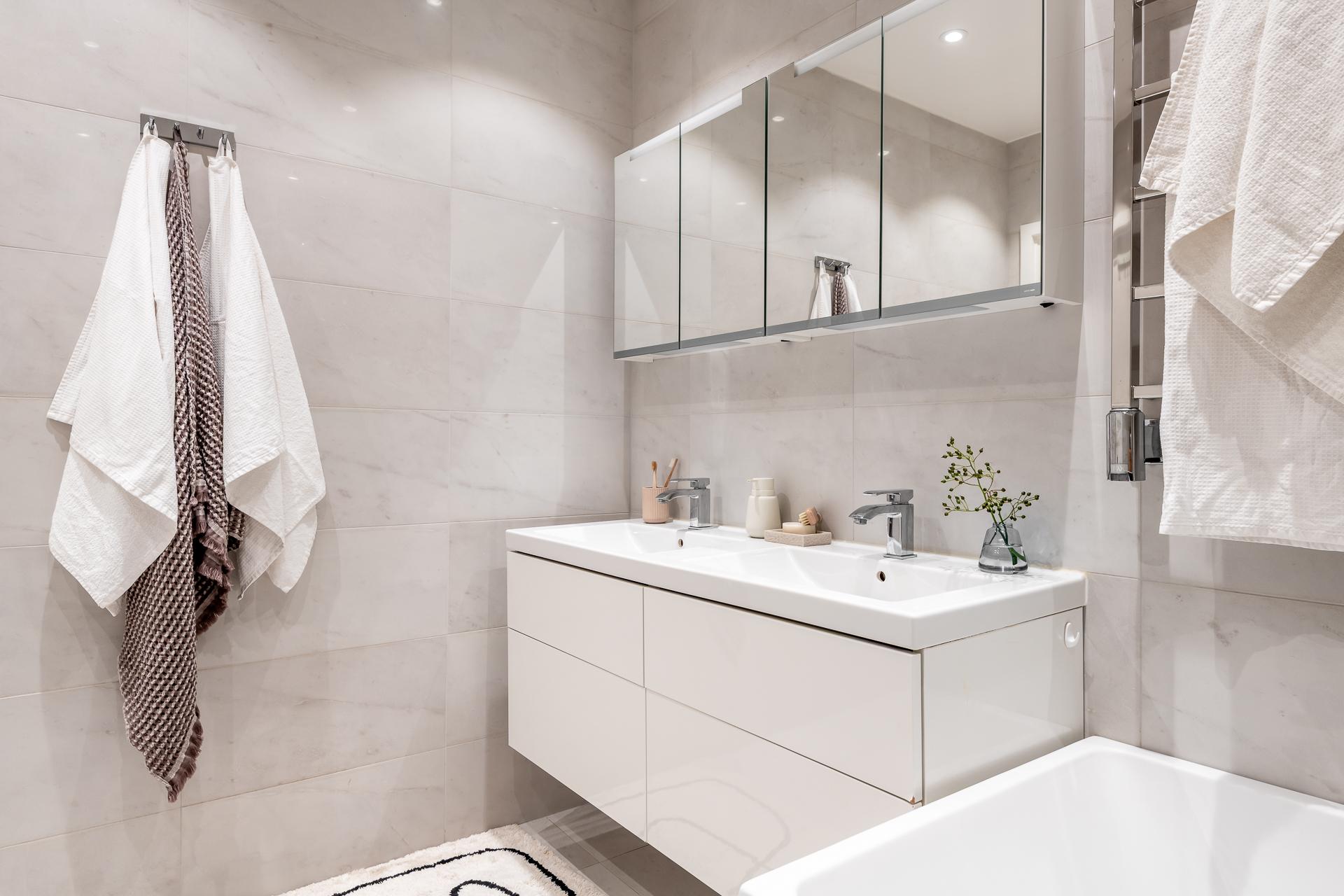 Totalrenoverades under cirka år 2021 och nås via vardagsrummet. Här finns en vägghängd WC, dubbla handfat med kommod och spegelskåp samt en kombinerad tvätt- och torktumlare. Öppen förvaring erbjuds i form av en stringhylla. Härligt badkar. Duschhörna, som skärmas av med infällda glasdörrar, är lyxigt utrustat med både takdusch och handmunstycke. Handdukstork finns. Badrummet är helkaklat med ljusgrå marmorerad klinker och blank yta på väggarna och matt yta på det uppvärmda golvet. Taket sitter infällda spotlights.