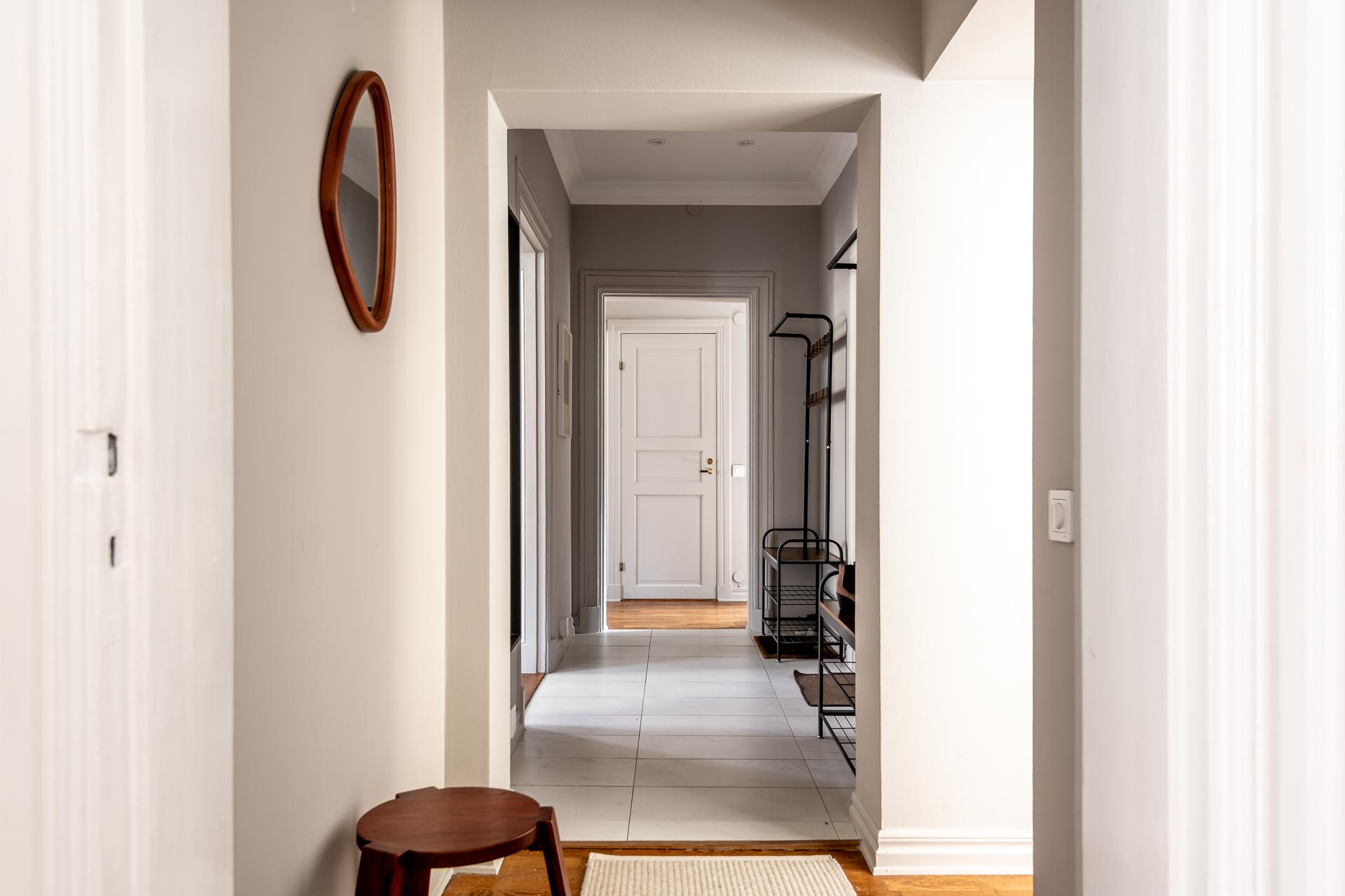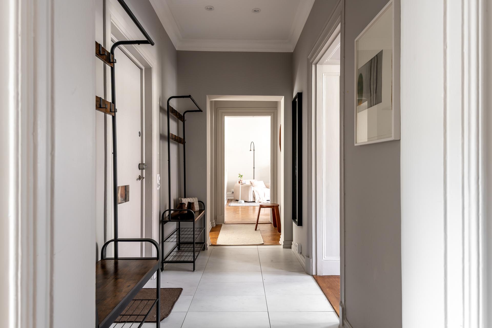 Känslan av sekelskiftets vackra interiör och ansenliga rumsvolymer infinner sig redan här. Goda möjligheter för avhänging finns och golvet pryds av stilren klinker med underliggande golvvärme. I den inre delen av hallen, till höger är golvet belagt med oljad parkett. Hela våningen är ommålad i sobra, eleganta färgval.