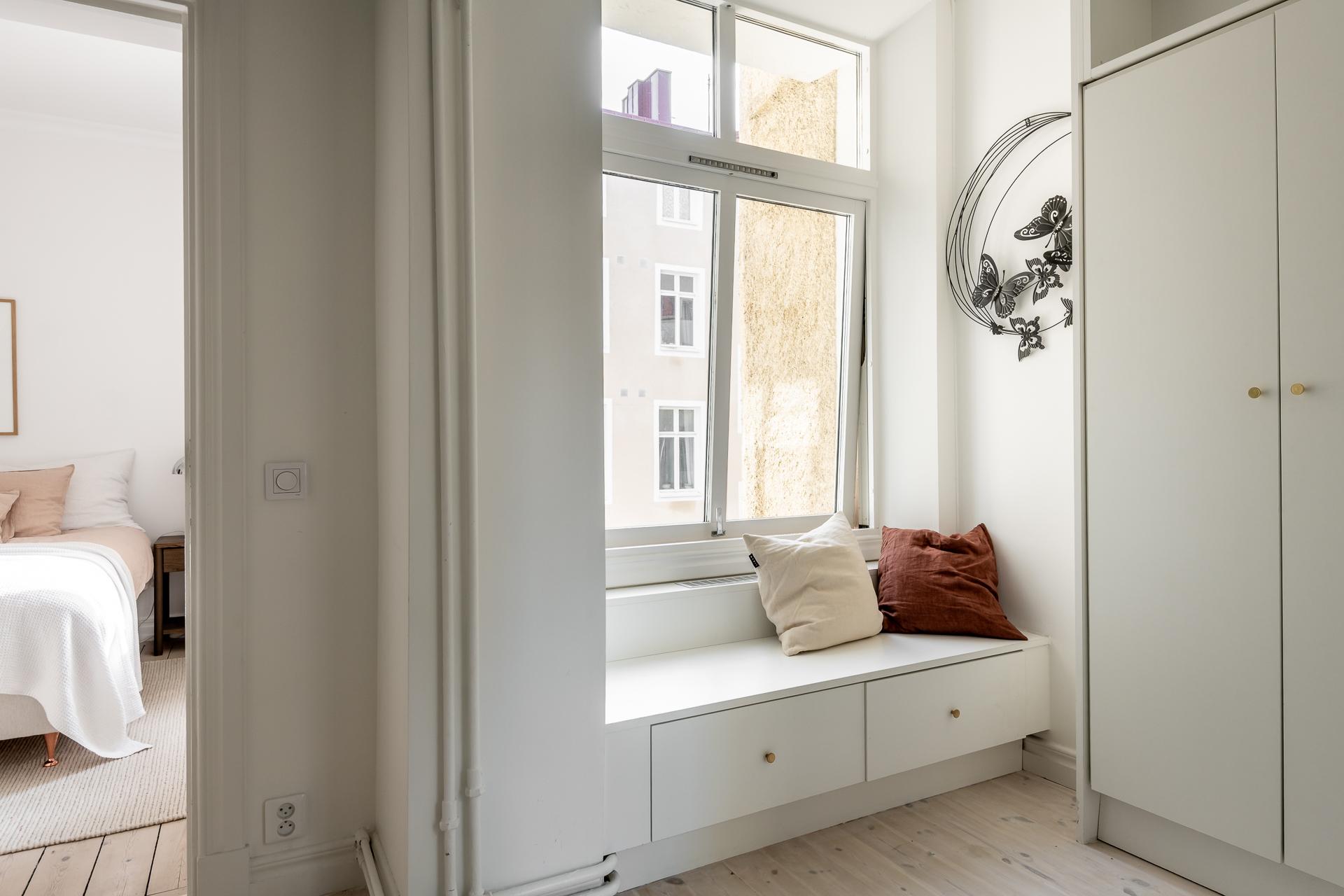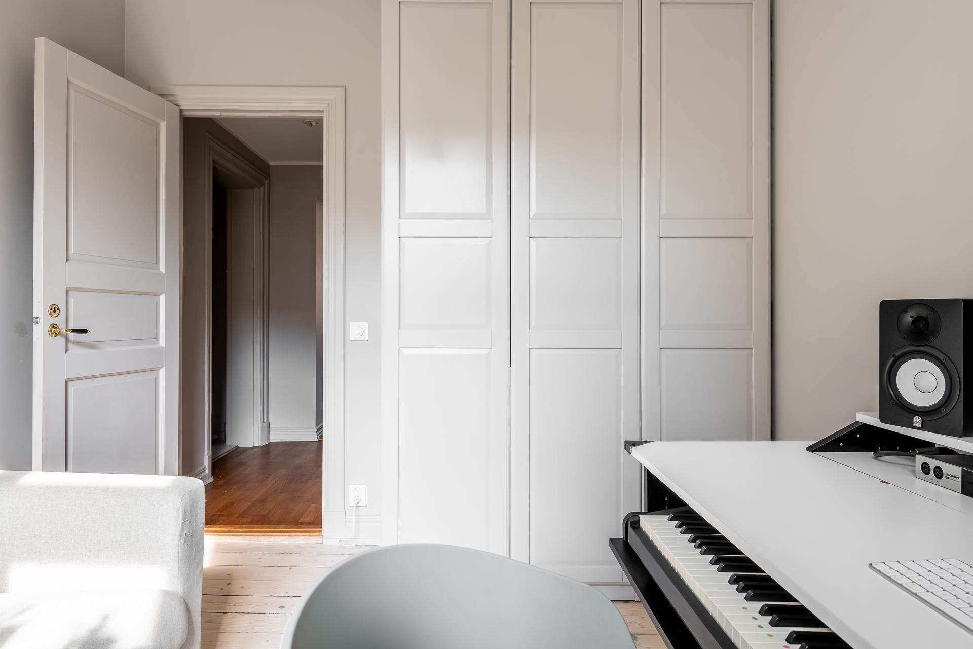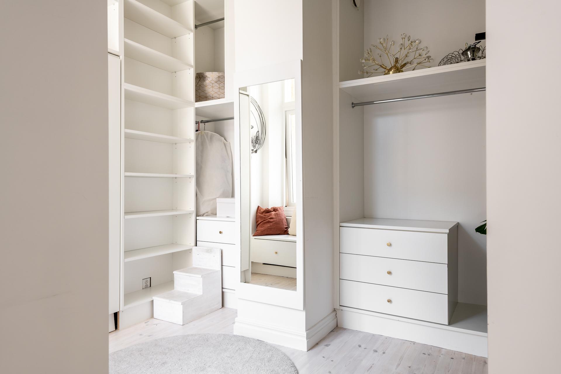 Vetter med sina fönster mot den tysta innergården. Så här har ni ett tyst och lugnt gårdsläge i hjärtat av myllrande Vasastaden. Här kan ni möblera med dubbelsängar med tillhörande nattduksbord. Det vackra brädgolvet är framtaget och vitbetsat och taket pryds av stuckatur. Flertalet garderober ger all önskvärd förvaring. För att inte nämna klädkammaren med platsbyggd inredning från golv till takt vilket ger utmärkt förvaring, möjligt arbetsrum och/eller en bra barnkammare.
