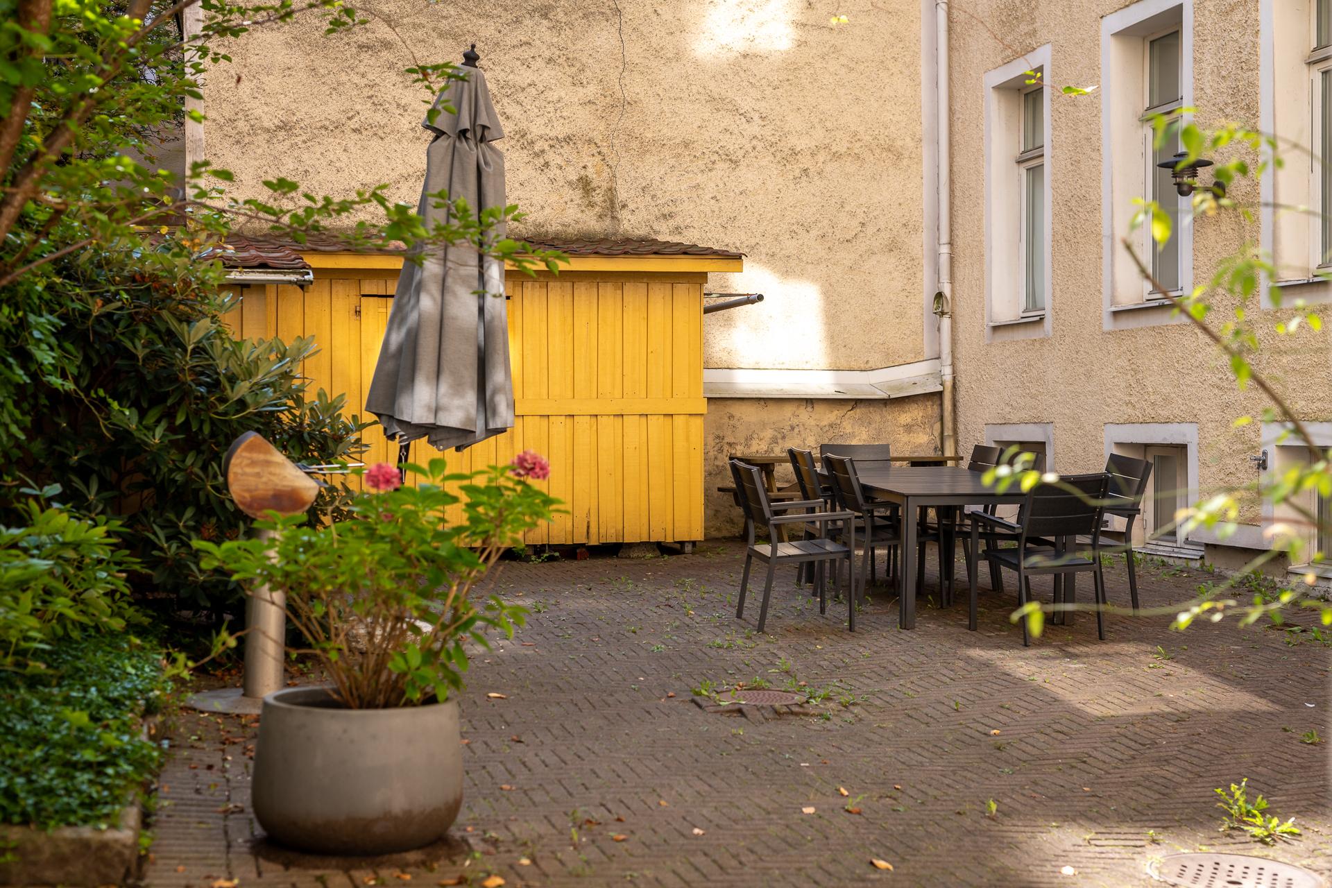 Föreningens innergård är snygg stenlagd och är sommartid en lugn oas med trädgårdsmöbler och plats för umgänge. Här finns även odlingslådor och grillmöjligheter. Cykelrum och återvinningsstation finns också.