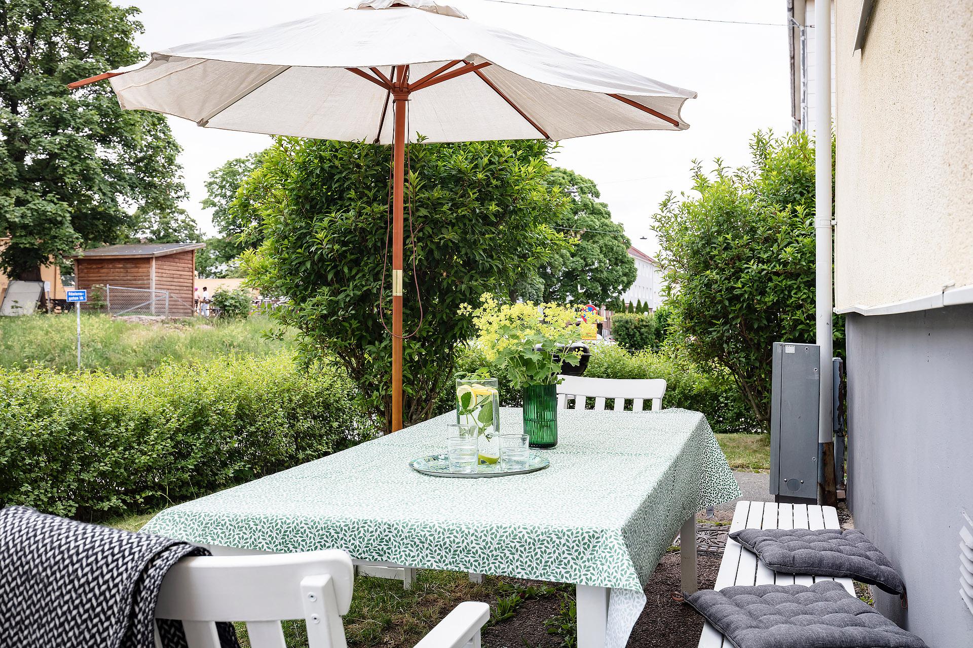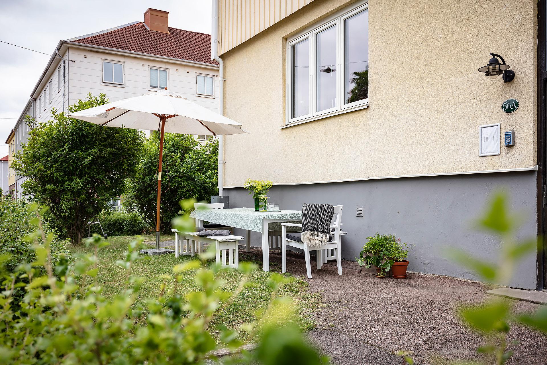 - Balkong/Uteplats: Nej. Förträdgård med utemöbler, soligt läge mot Björcksgatan. Innergård.