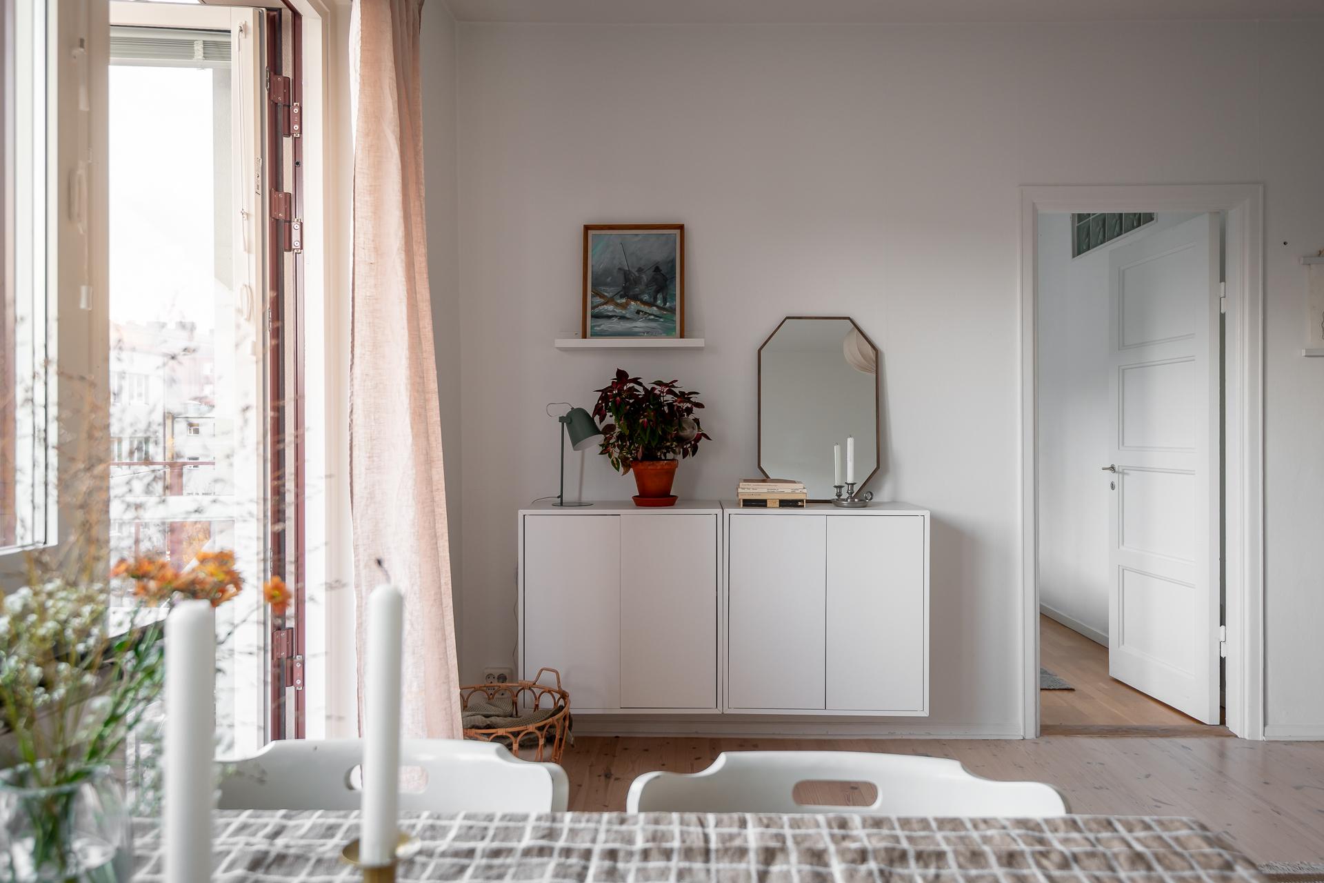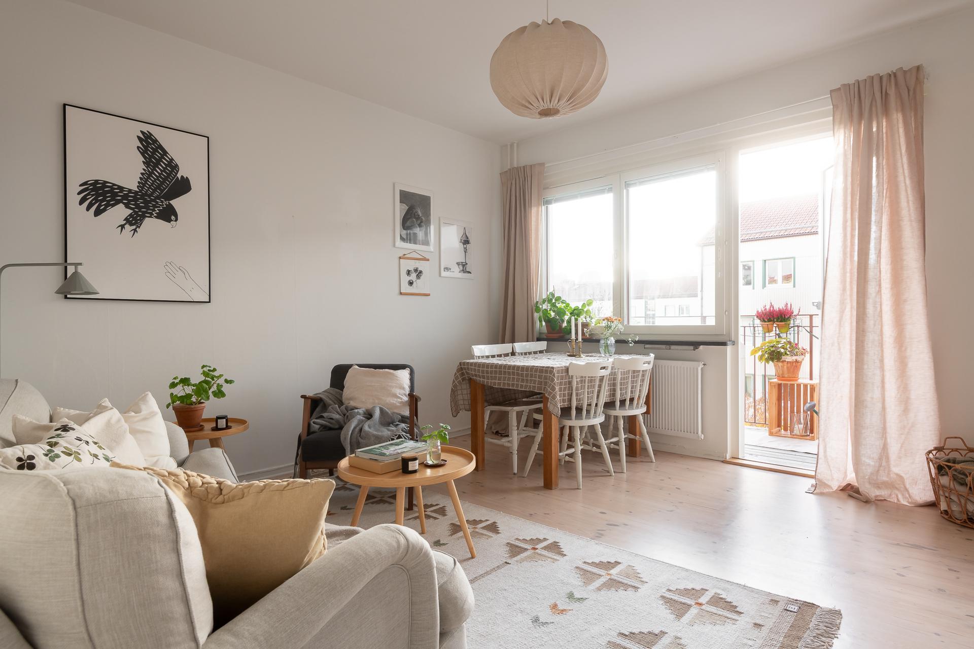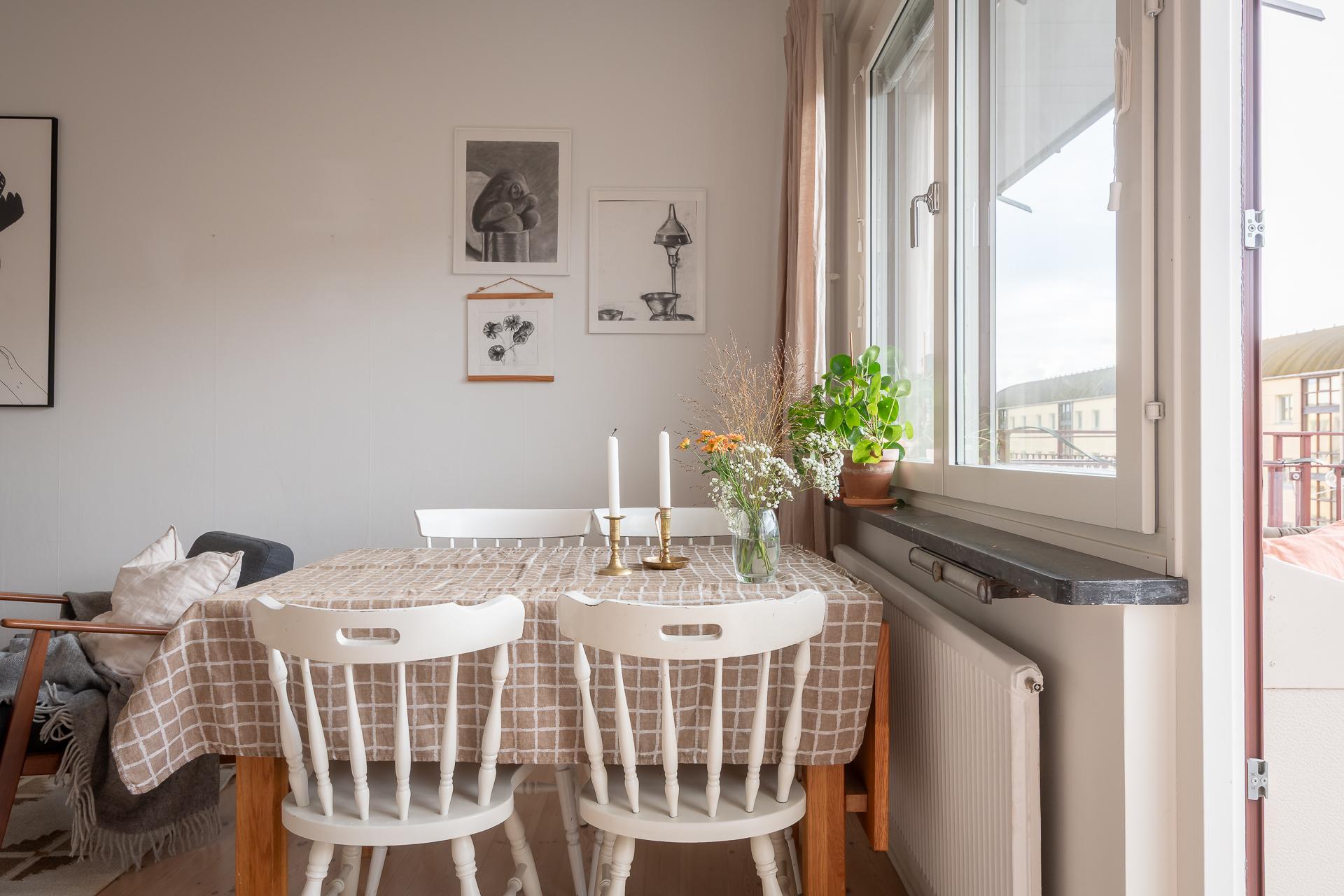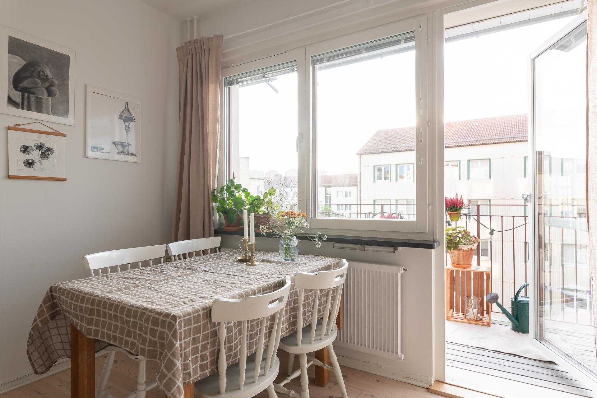 Ett stort och inbjudande rum som har plats för både soffgrupp och matbord. Det breda fönstret med vacker kalkstensbänk släpper in gott om ljus och tillsammans med takhöjden upplevs rummet mycket rymligt. Detta rummet är den naturliga samlingspunkten och som gjort för sociala tillställningar. Härifrån når vi balkongen som bjuder på sol från tidig eftermiddag till sen kväll. Balkongen är väl tilltagen och här ryms både möbler och planteringar. Väggarna går i samma nyans som i hall och sovrum och binder fint ihop de olika ytorna.