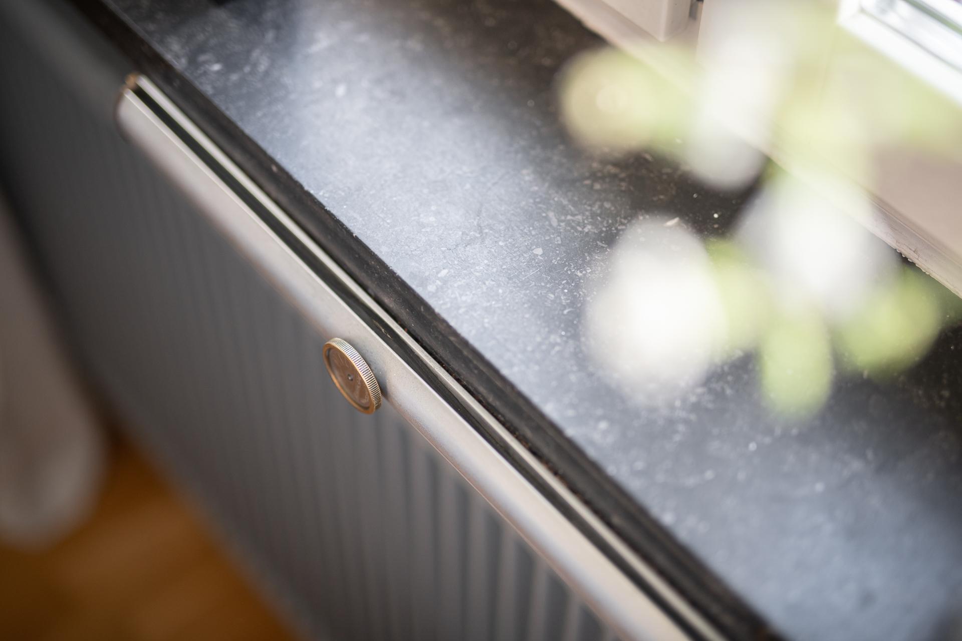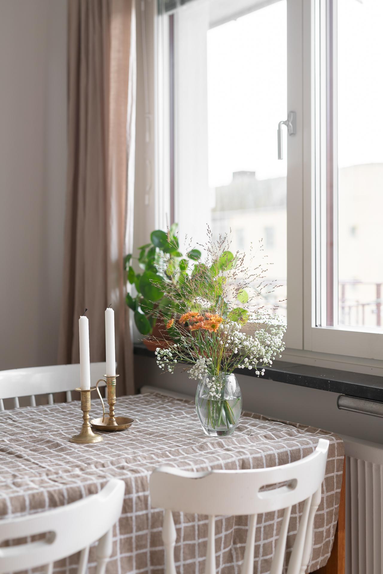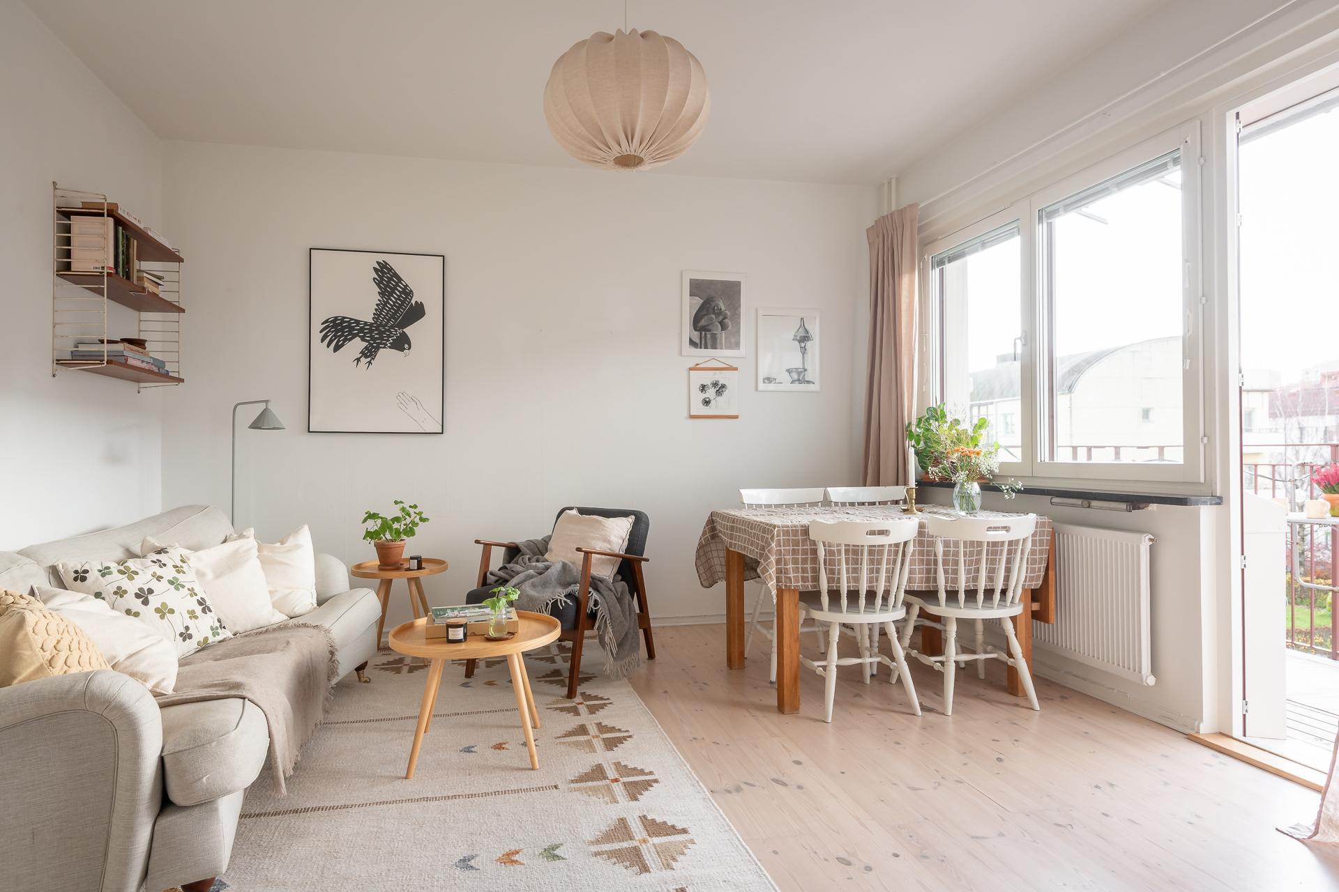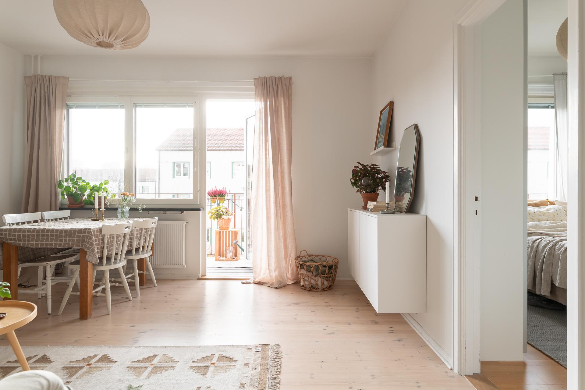 Ett stort och inbjudande rum som har plats för både soffgrupp och matbord. Det breda fönstret med vacker kalkstensbänk släpper in gott om ljus och tillsammans med takhöjden upplevs rummet mycket rymligt. Detta rummet är den naturliga samlingspunkten och som gjort för sociala tillställningar. Härifrån når vi balkongen som bjuder på sol från tidig eftermiddag till sen kväll. Balkongen är väl tilltagen och här ryms både möbler och planteringar. Väggarna går i samma nyans som i hall och sovrum och binder fint ihop de olika ytorna.