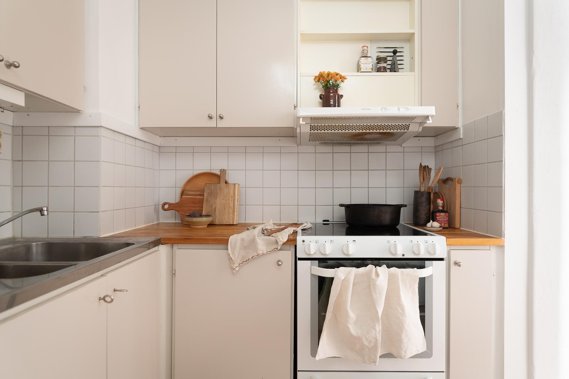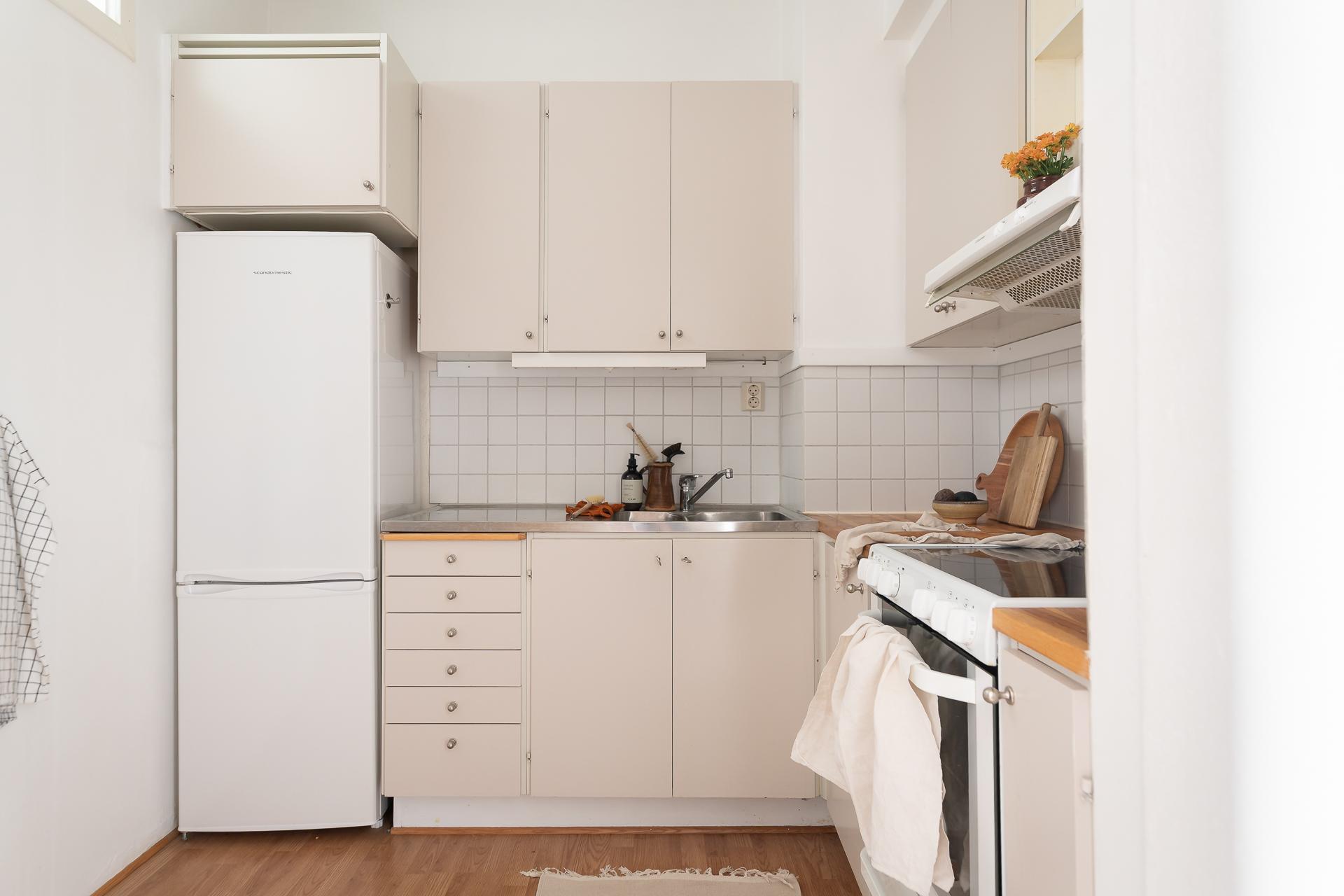 Direkt till höger från hallen når vi lägenhetens kök. Ett stilrent och sparsmakat kök med släta ljusa luckor och diskbänk av rostfritt och trä. Här finns goda förvaringsmöjligheter i både under och överskåp samt bra med arbetsyta. Den maskinella utrustningen består av kyl/frys, spis samt fläkt. För den som önskar så går det att ställa en mindre matplats här.