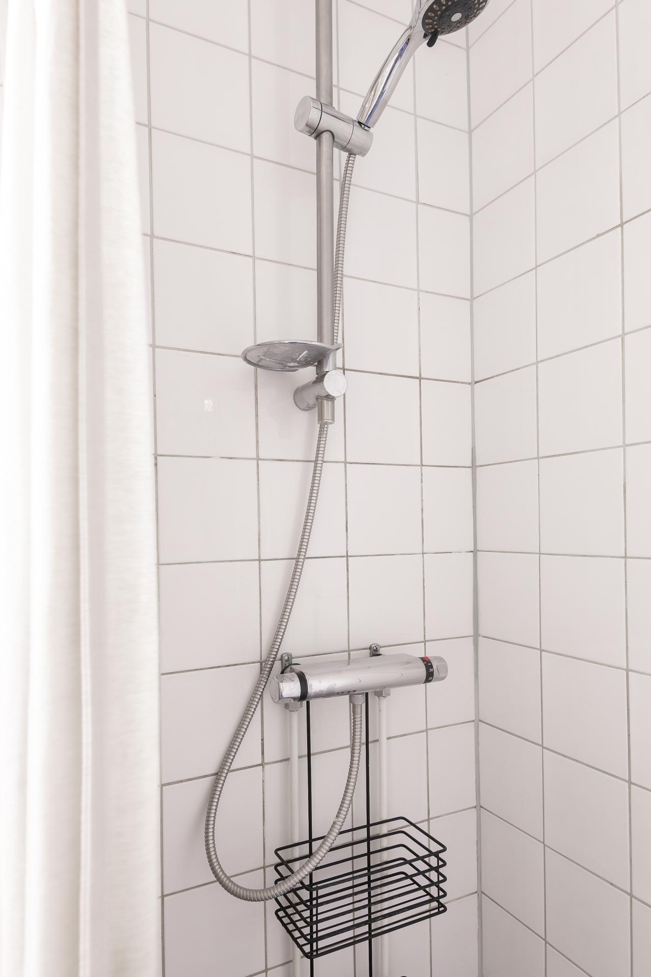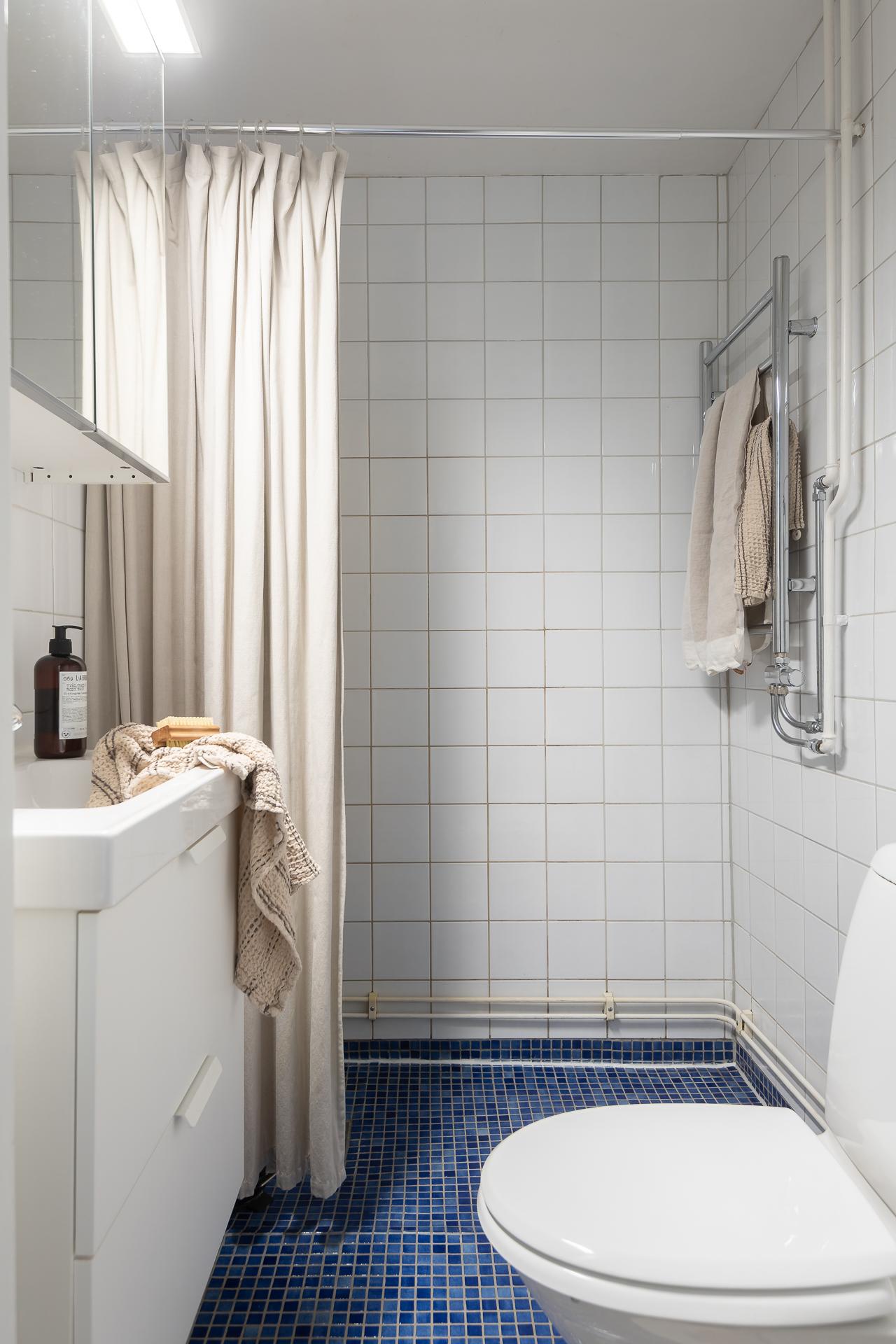 Lägenhetens badrum ligger praktiskt placerat i hallen. Här inryms duschhörna, handfat med kommod, spegel, handdukstork samt wc. Väggarna är helkaklade med ett vitt kakel och golvet belagt med en blå klinker.