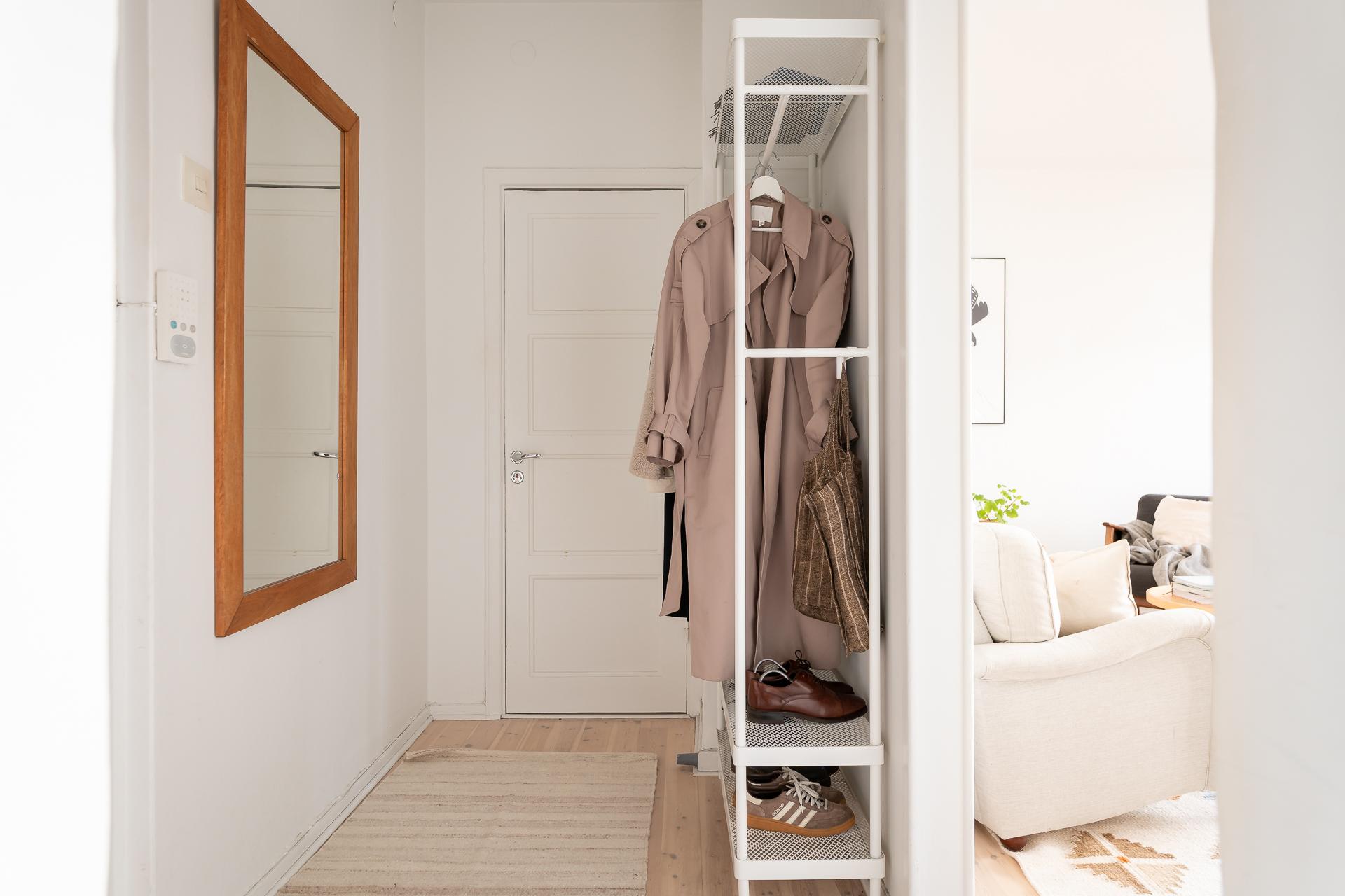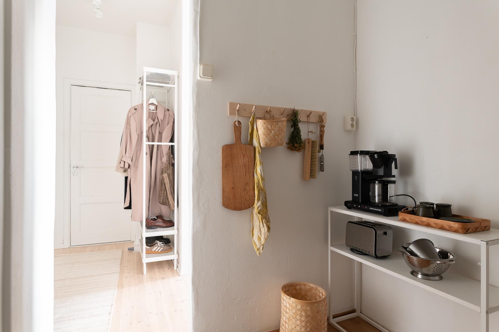 Hallen är välkomnande och rymlig och redan här får vi en god överblick över lägenheten, och ljuset välkomnar oss in! Direkt innanför dörren finns det plats för avhängnng av ytterkläderna. Hallen har ljusa väggar och på golvet ligger ett ljust laminatgolv som tröskelfritt löper vidare in i lägenhetens vardagsrum . Från hallen som fungerar som hemmets nav når man lägenhetens badrum, kök samt vardagsrum.