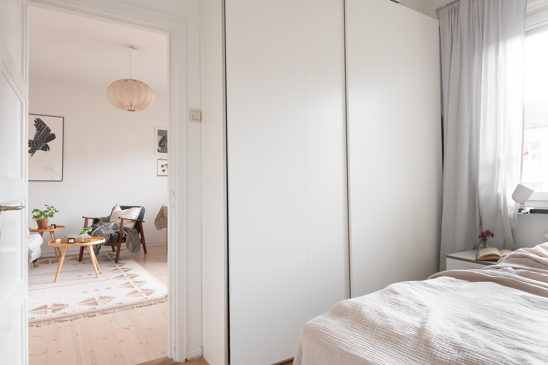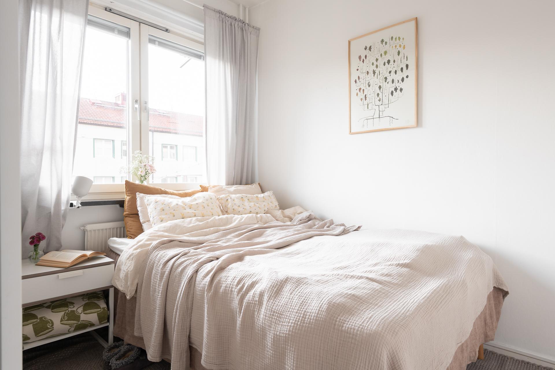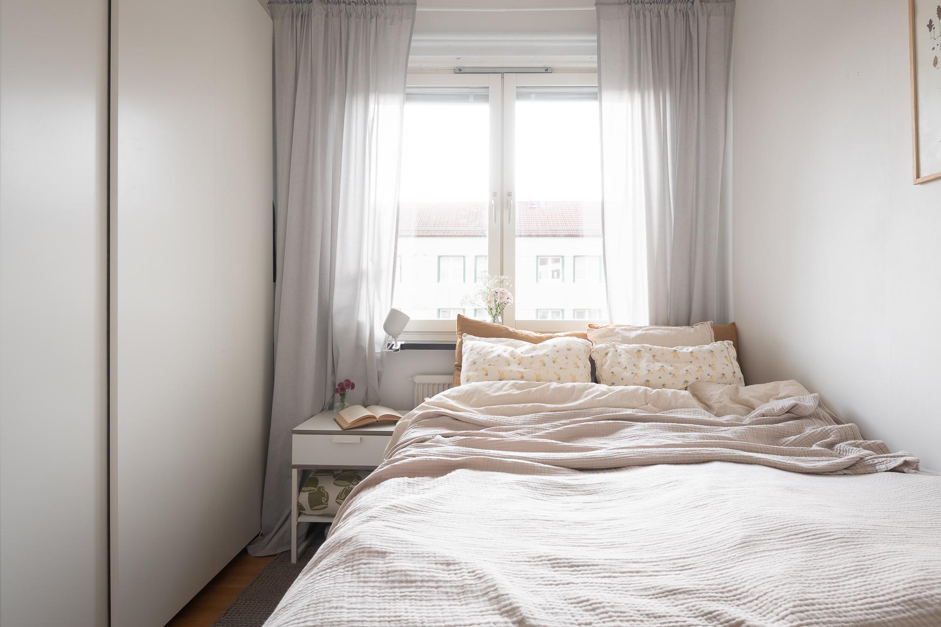 I sovrummet ryms en dubbelsäng med sidobord lätt och ledigt. Ett stort fönster släpper in ljuset och även här finns det vacker fönsterbänk i kalksten. Här finns det gott om förvaringsutrymme i garderob med skjutdörrar.