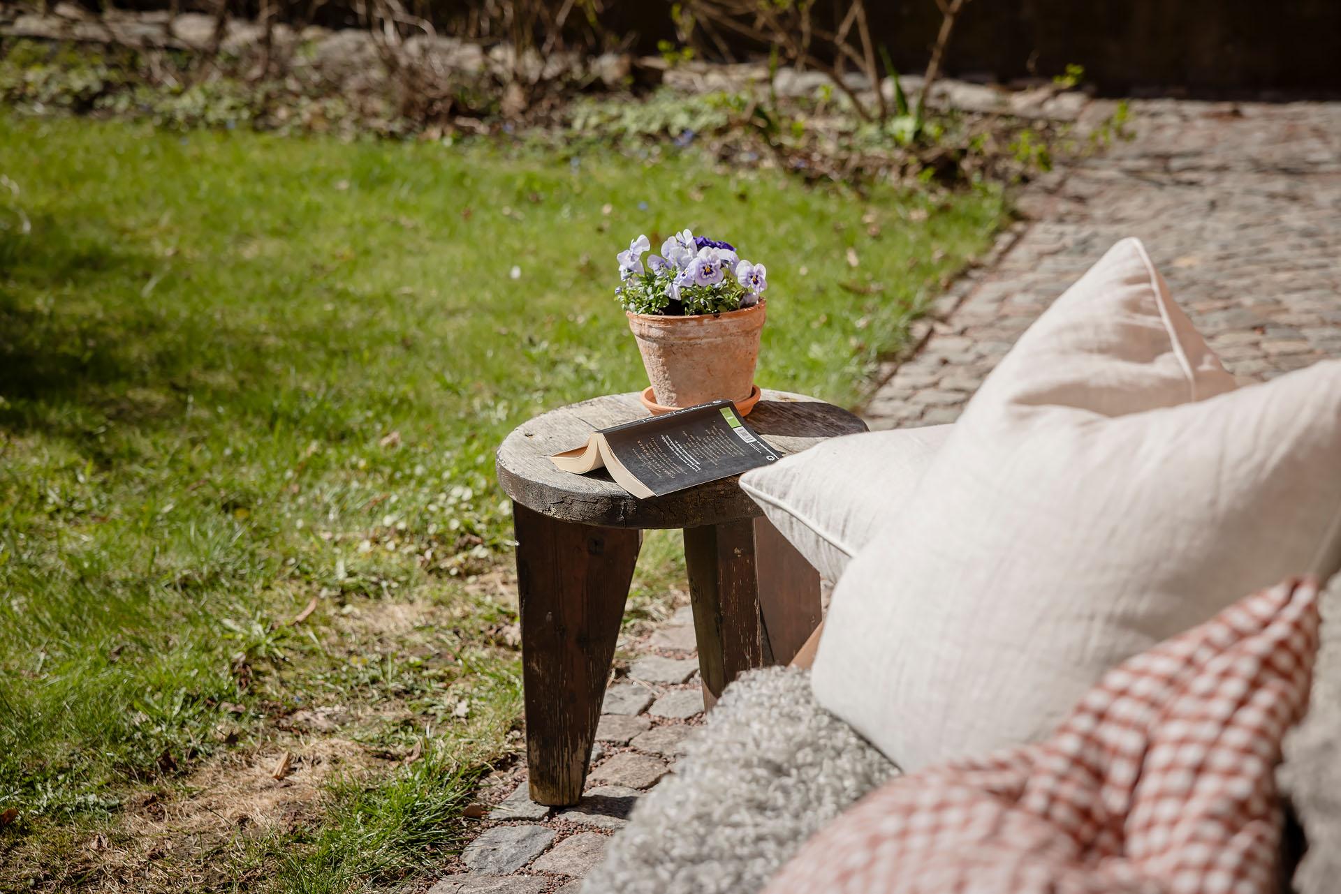 Sovrummet är rofyllt och generöst tilltaget, med gott om plats för dubbelsäng och kompletterande möblering. Även här faller ljuset vackert in genom spröjsade fönster med djupa nischer, och den lugna färgsättningen bidrar till en harmonisk atmosfär. Läget mot gården gör rummet tyst och avskilt, med en grön fond som förändras med årstiderna.