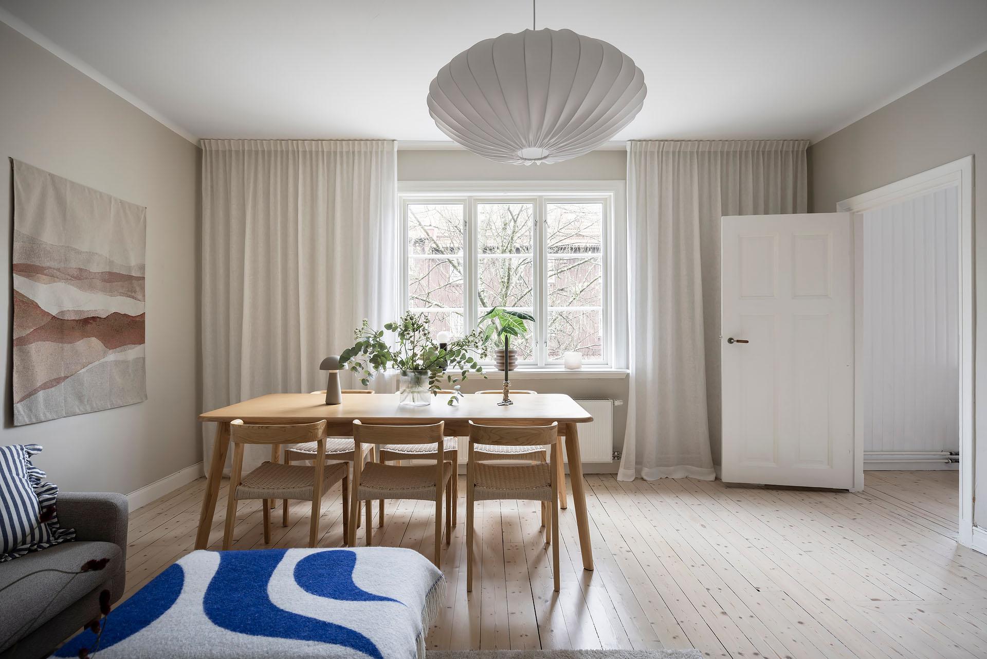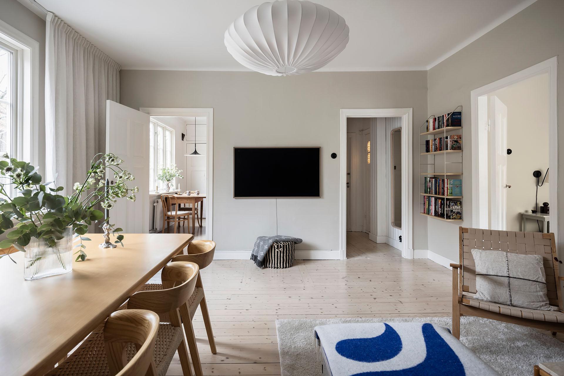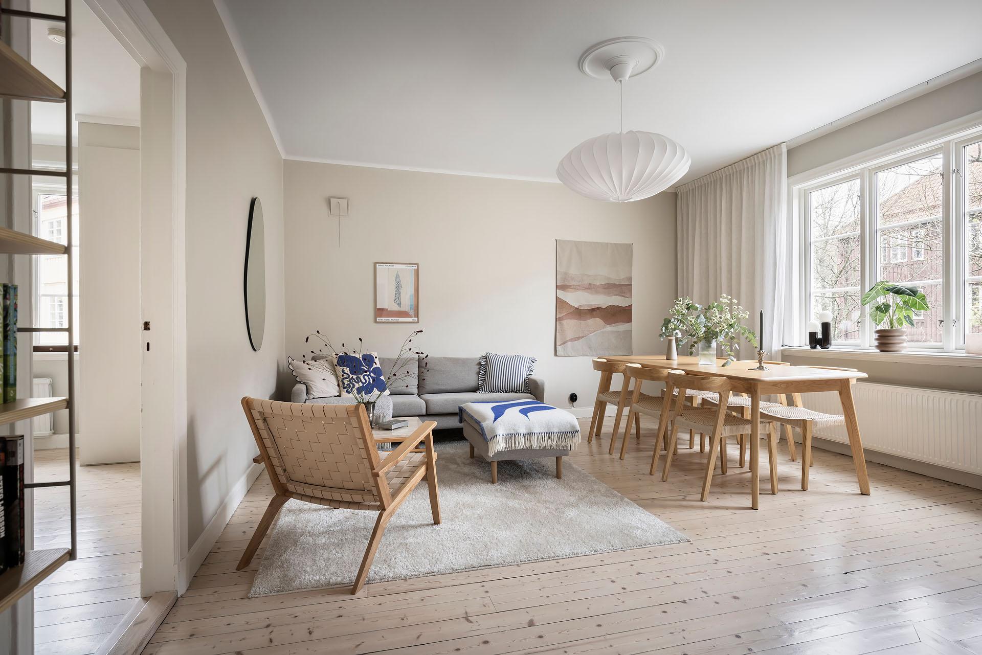 Lägenhetens vardagsrum och kök ligger som nämnts i fil med härligt ljusinsläpp från stora spröjsade fönster i söder. Vardagsrummet är rymligt, och man får enkelt plats med både soffa och matgrupp utan att den luftiga känslan går förlorad. Det framtagna brädgolvet är vitlaserat och väggarna målade i Jotuns varma ljusbeige kulör ”Kalk”. Taket är besmyckat med en takrosett.