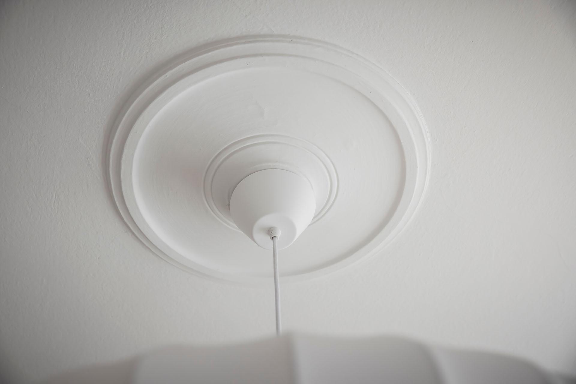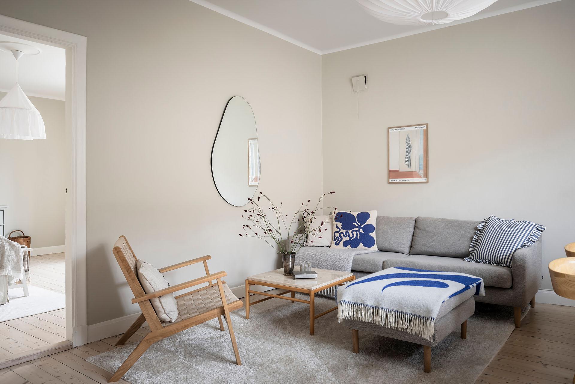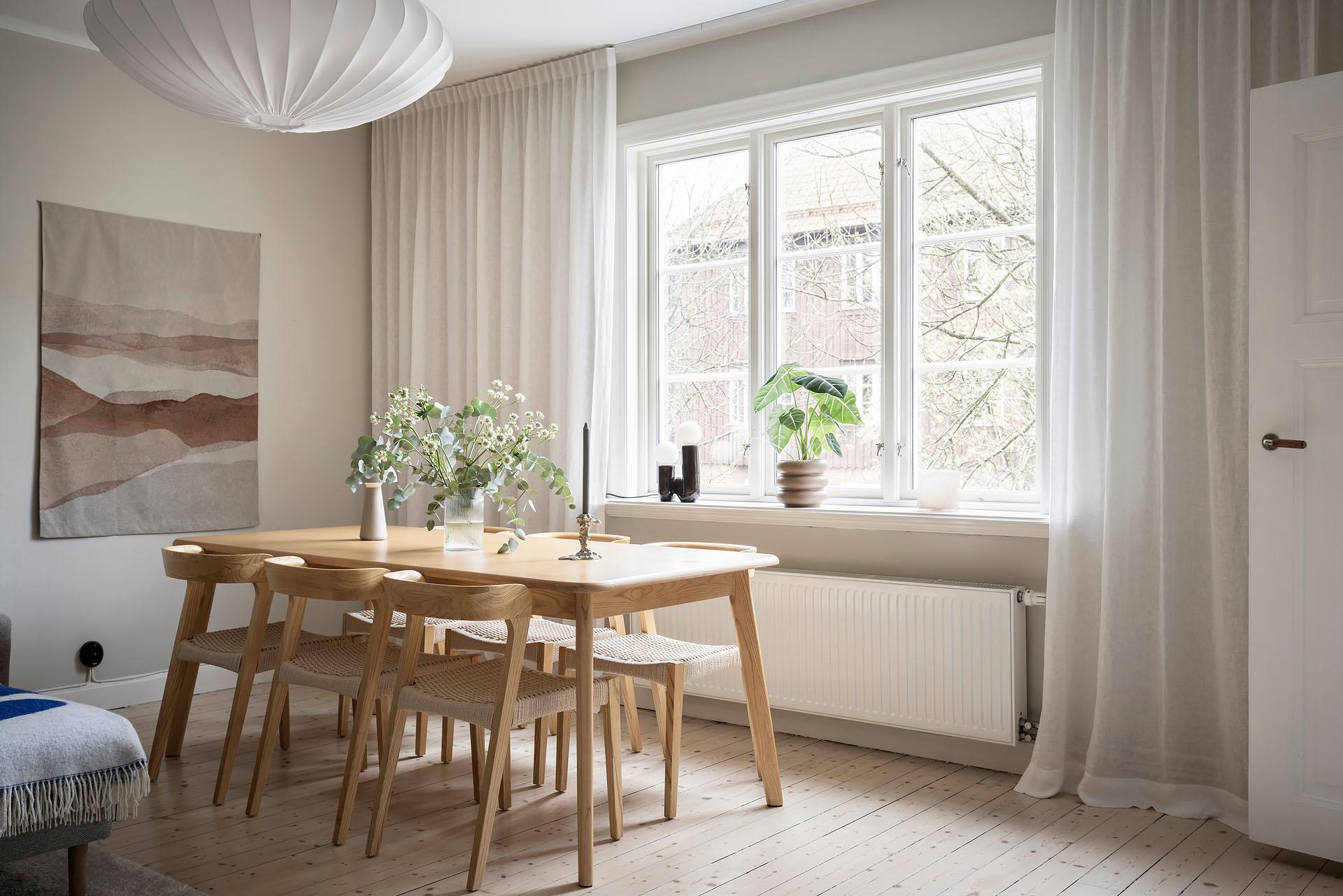 Lägenhetens vardagsrum och kök ligger som nämnts i fil med härligt ljusinsläpp från stora spröjsade fönster i söder. Vardagsrummet är rymligt, och man får enkelt plats med både soffa och matgrupp utan att den luftiga känslan går förlorad. Det framtagna brädgolvet är vitlaserat och väggarna målade i Jotuns varma ljusbeige kulör ”Kalk”. Taket är besmyckat med en takrosett.