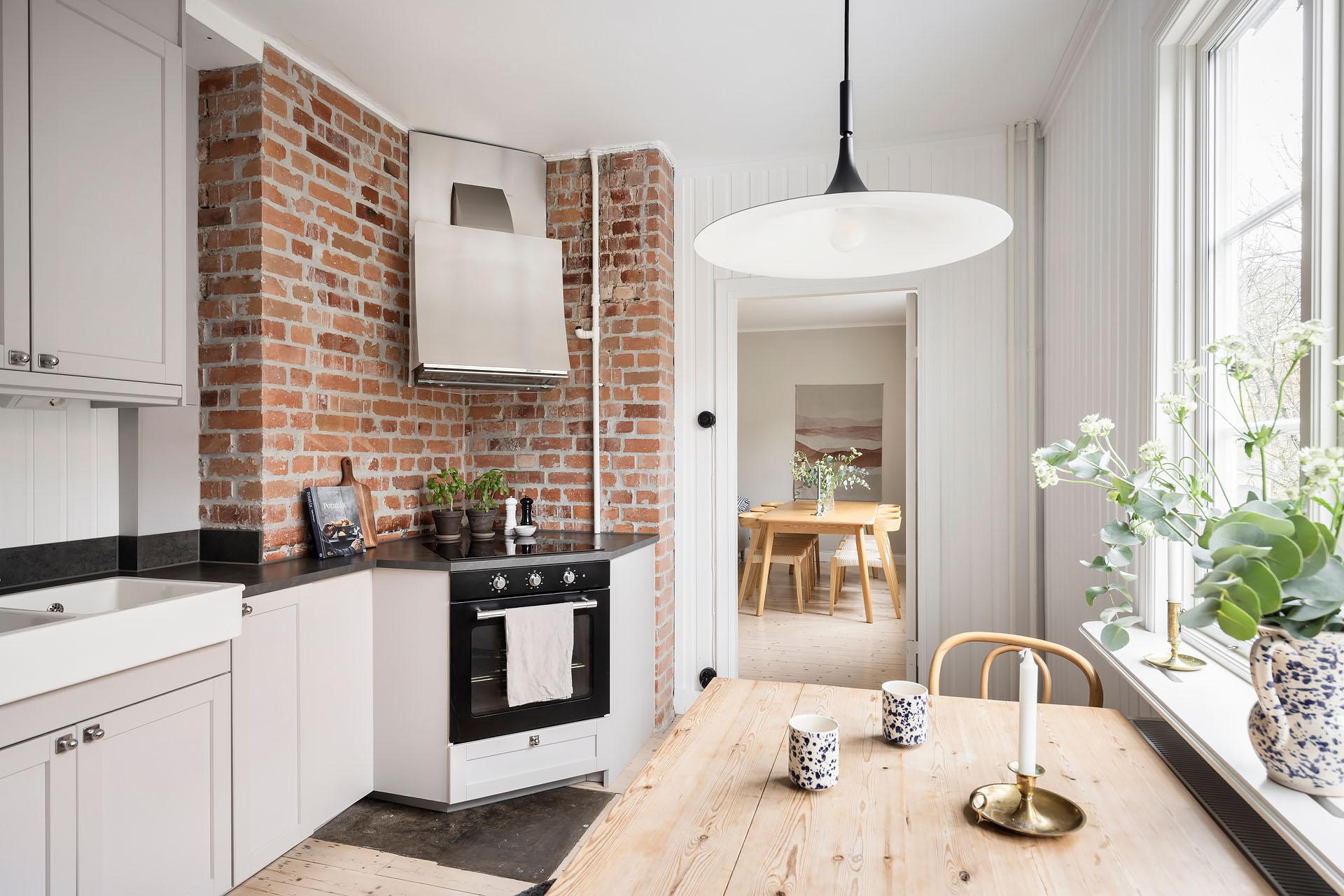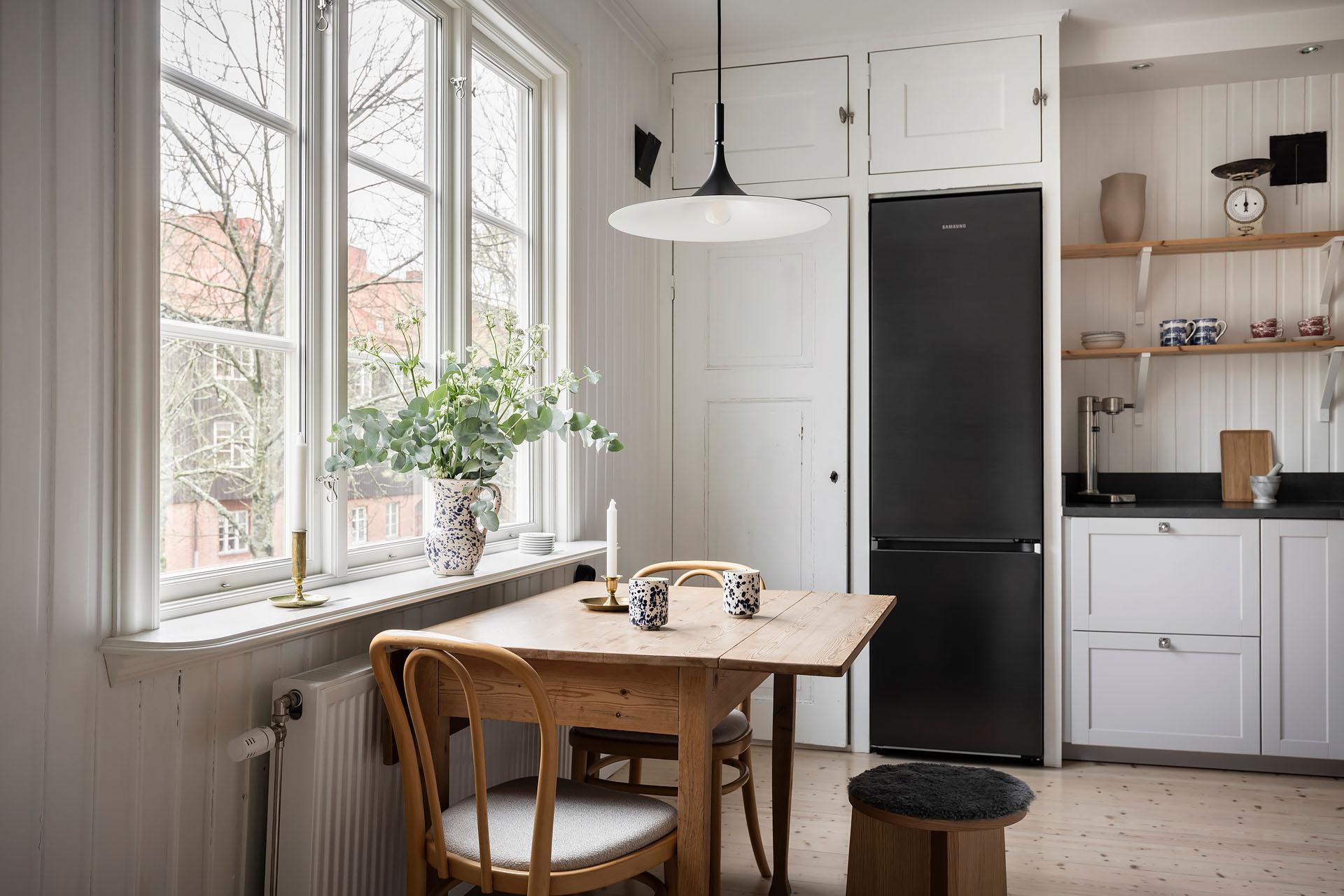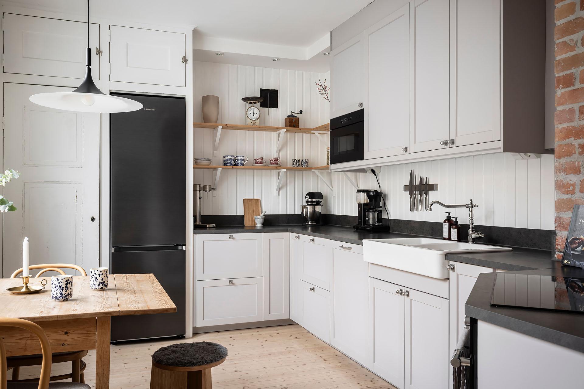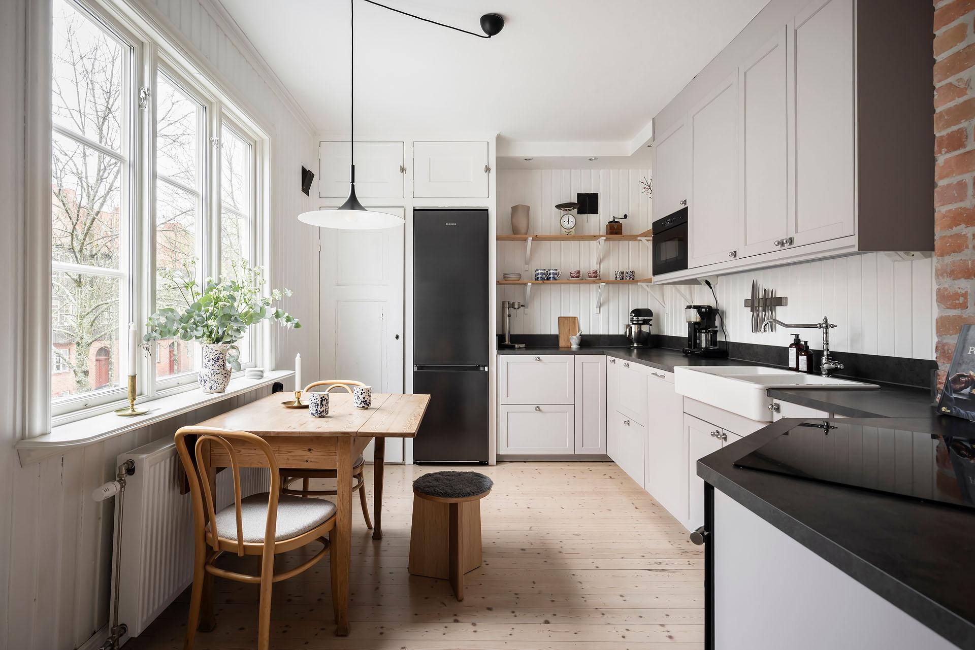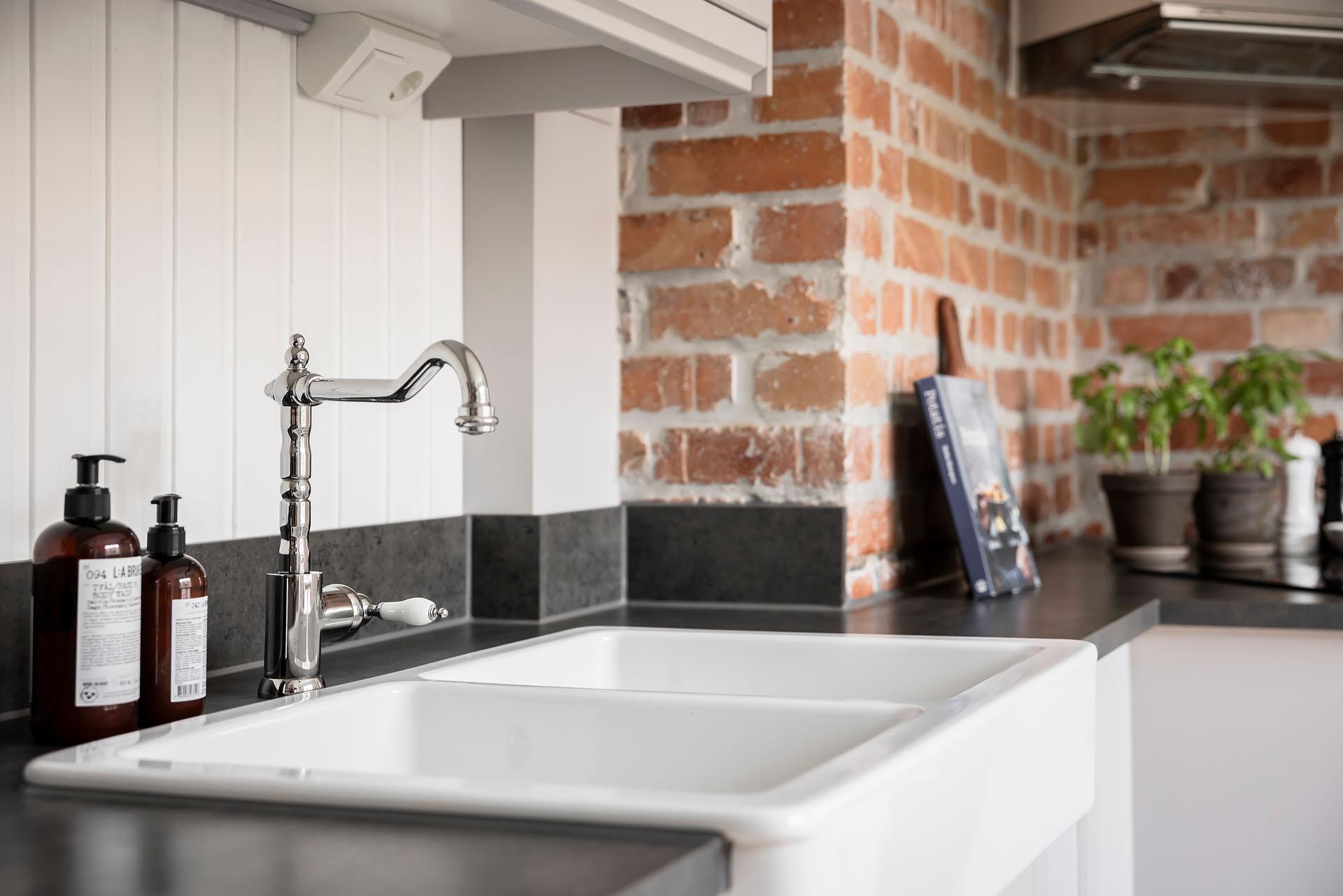 I köket är det väl tilltaget med både arbetsyta och förvaring, och de moderna skåpen kompletteras av ett inbyggt originalskafferi med överskåp. Här finns även öppna hyllplan att fylla med kokböcker, kryddväxter, vinglas och annat fint. Skåpen har ljusa spegelluckor och lådor, och bänkskivorna är mörkgrått laminat. Även ugnen, mikron och kylen/frysen är mörka medan diskmaskinen är integrerad i inredningen. Partiet ovanför den vita diskhon och den ena bänken är klätt med träpanel, och vid den infällda spishällen och den stiliga designfläkten från italienska Smeg är murstockens tegel frilagt. Väggarna är målade i vitt och det framtagna brädgolvet vitlaserat.