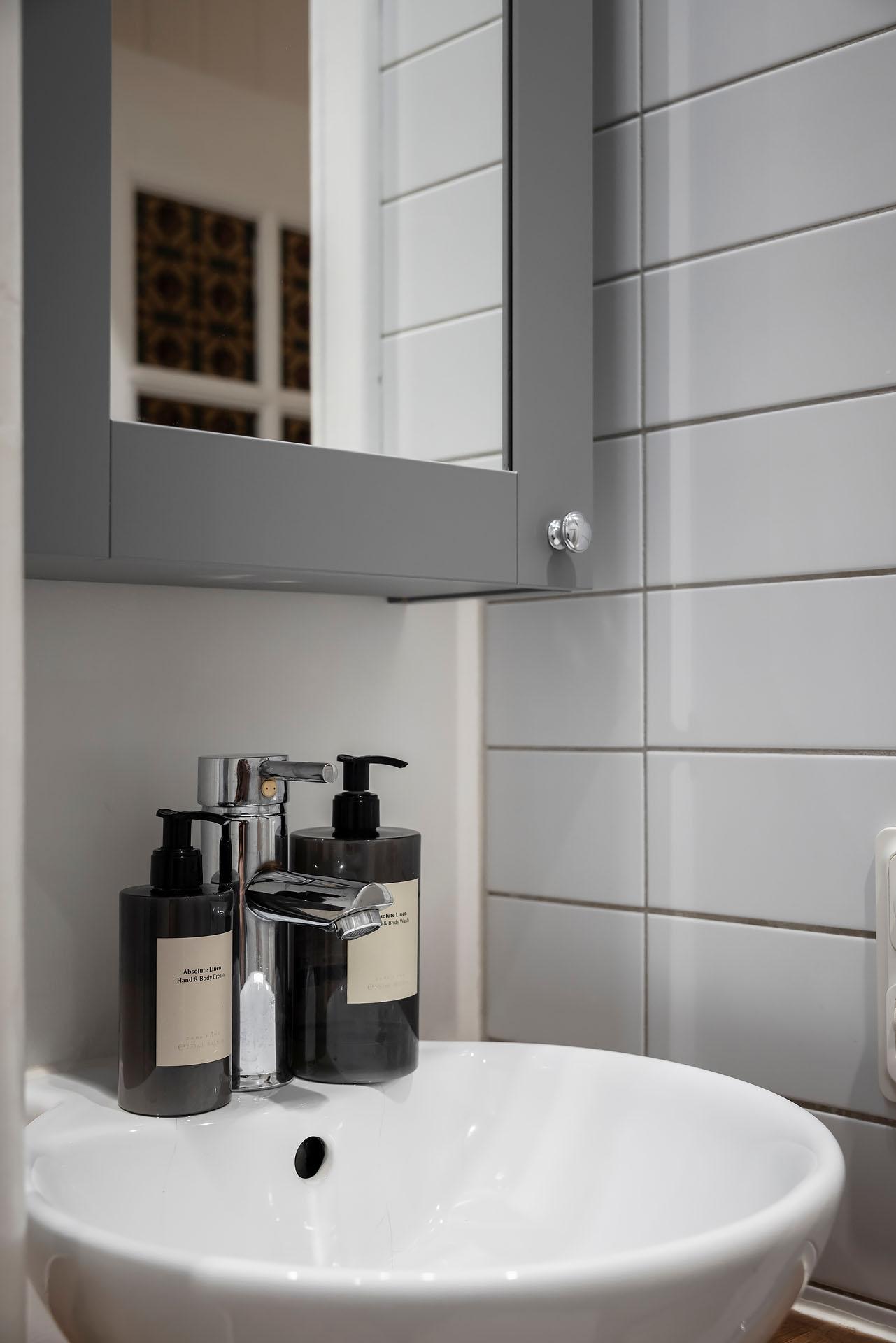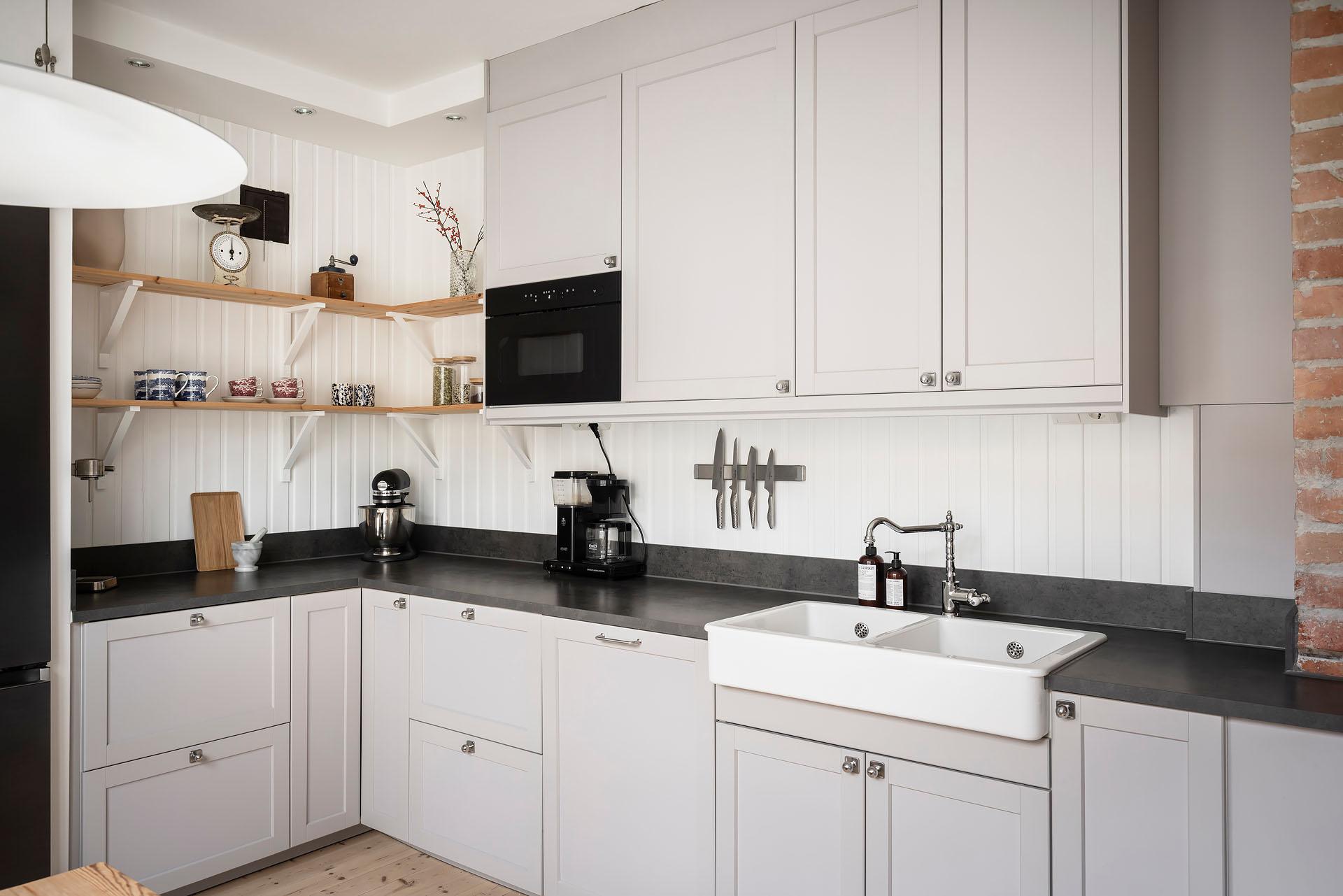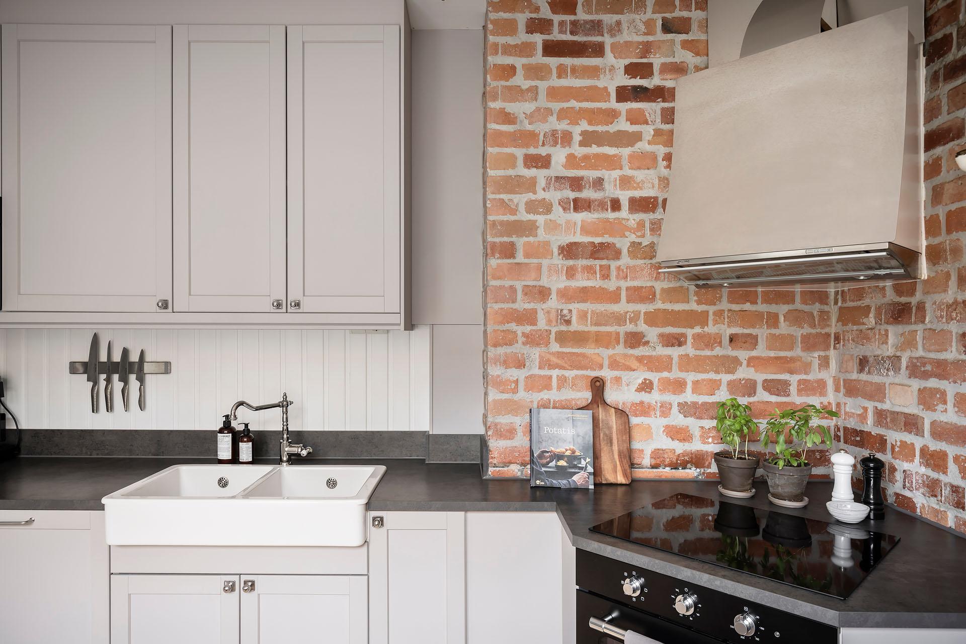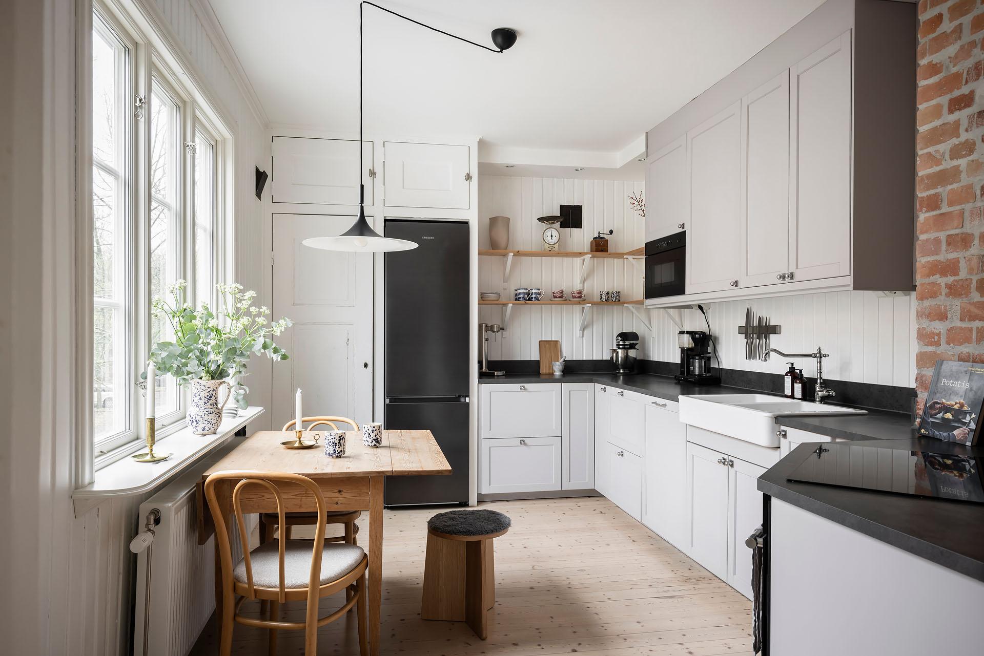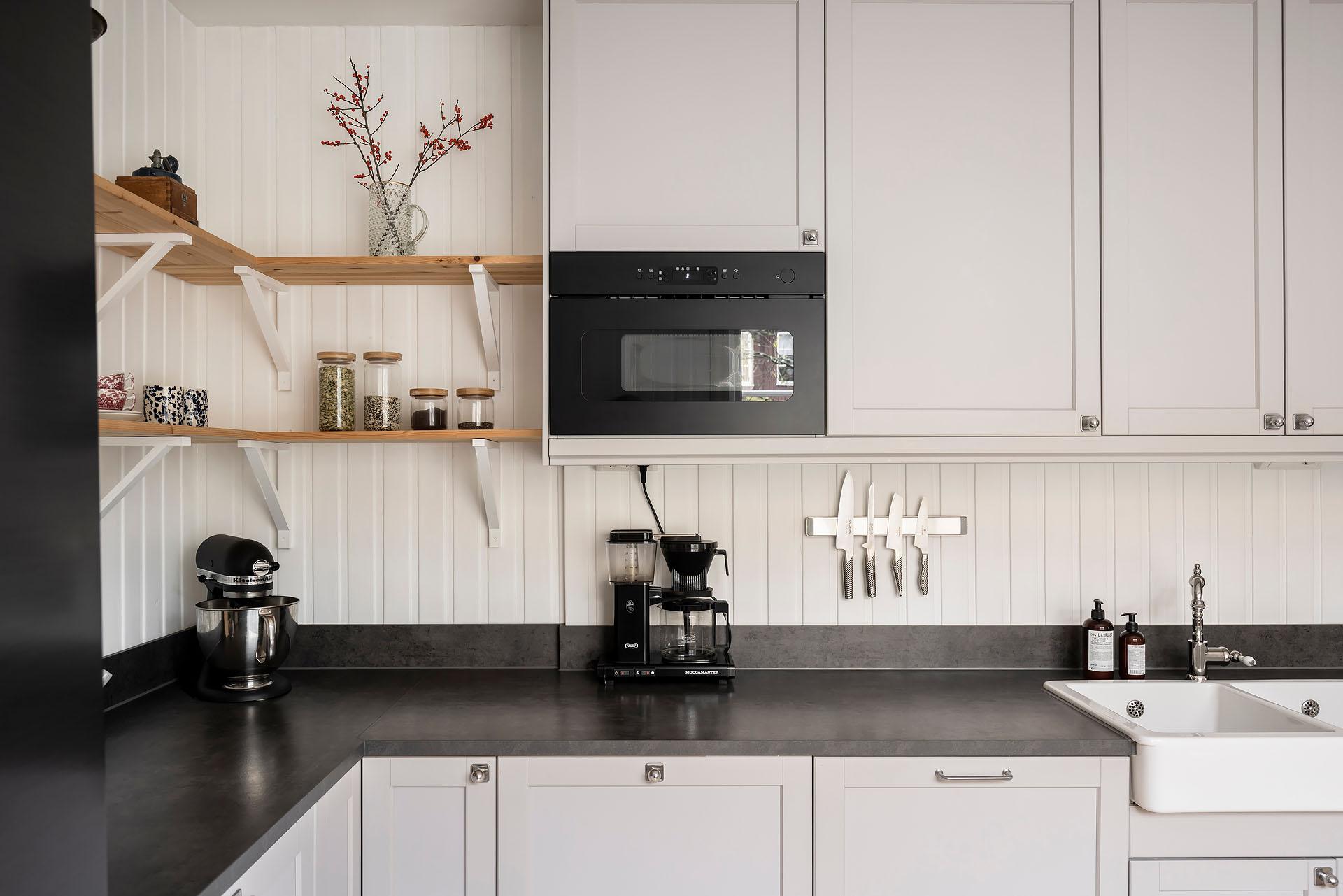 I köket är det väl tilltaget med både arbetsyta och förvaring, och de moderna skåpen kompletteras av ett inbyggt originalskafferi med överskåp. Här finns även öppna hyllplan att fylla med kokböcker, kryddväxter, vinglas och annat fint. Skåpen har ljusa spegelluckor och lådor, och bänkskivorna är mörkgrått laminat. Även ugnen, mikron och kylen/frysen är mörka medan diskmaskinen är integrerad i inredningen. Partiet ovanför den vita diskhon och den ena bänken är klätt med träpanel, och vid den infällda spishällen och den stiliga designfläkten från italienska Smeg är murstockens tegel frilagt. Väggarna är målade i vitt och det framtagna brädgolvet vitlaserat.
