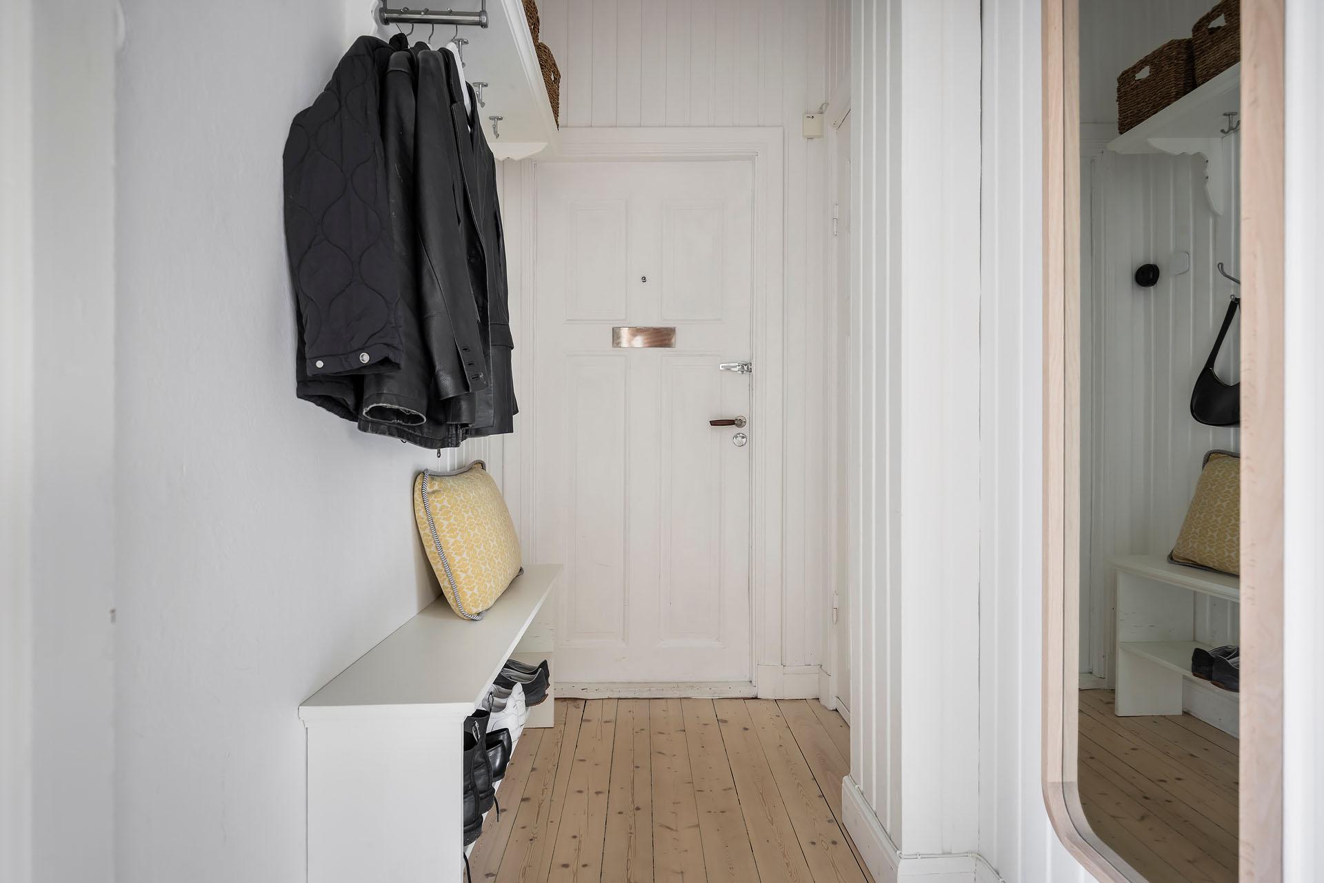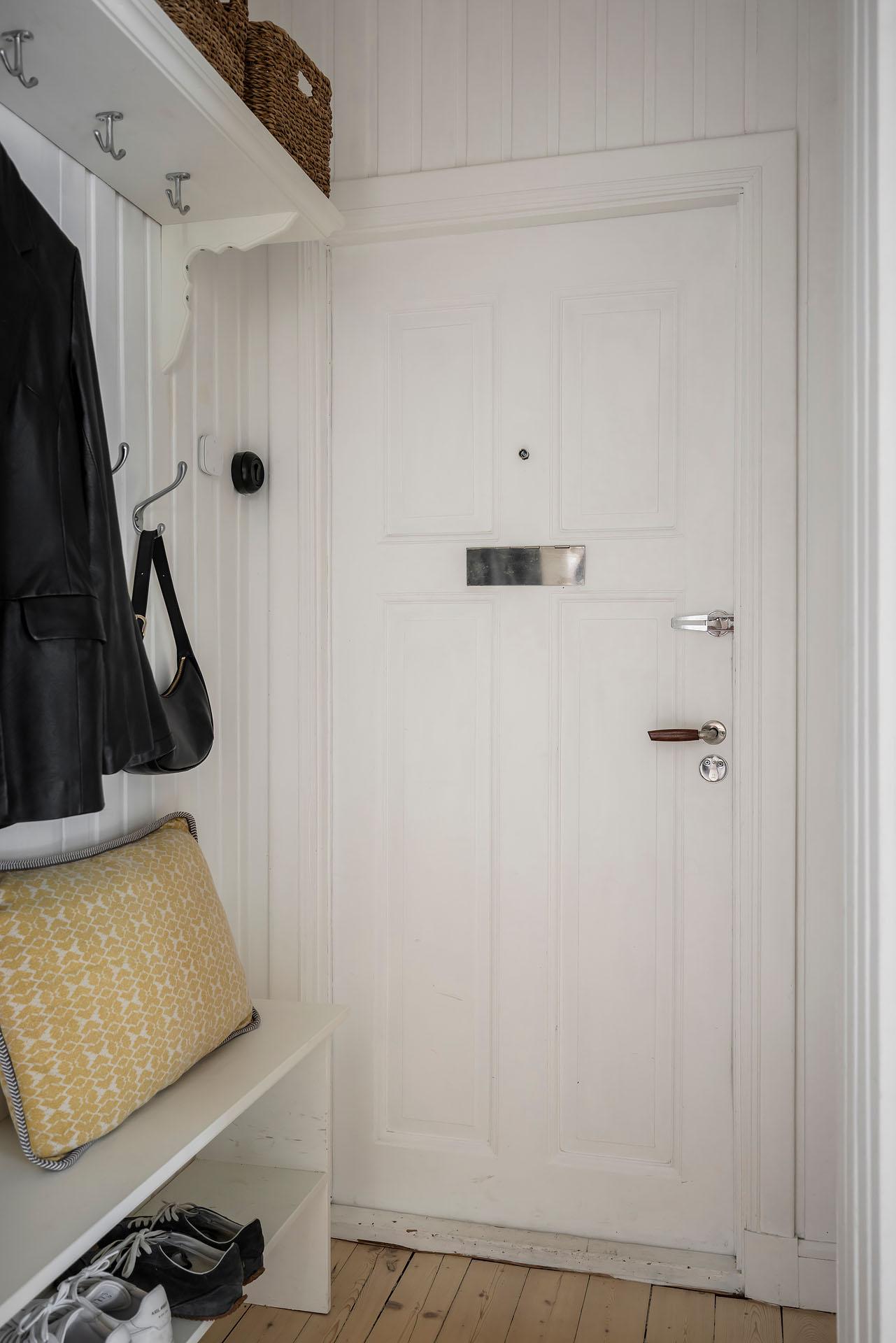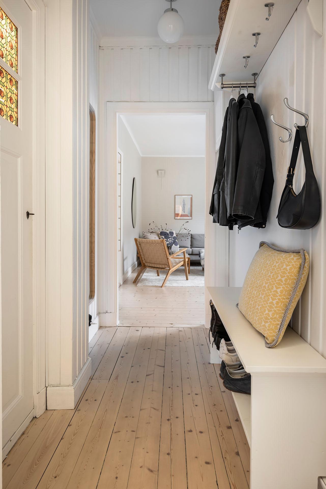 Hallen är välkomnande, och här hänger man av sig ytterkläderna under en fin hatthylla direkt innanför ytterdörren. Både hatthyllan och skohyllan, med en bänk att slå sig ner på, är platsbyggda. Det framtagna brädgolvet är vitlaserat och väggarna, inklusive den fina spontpanelen, målade i vitt.