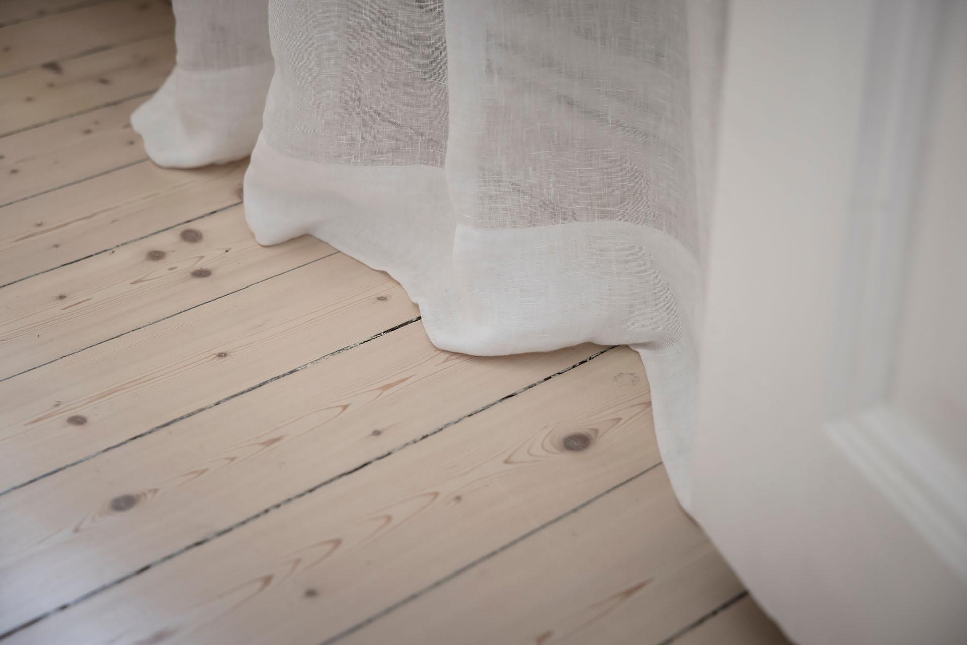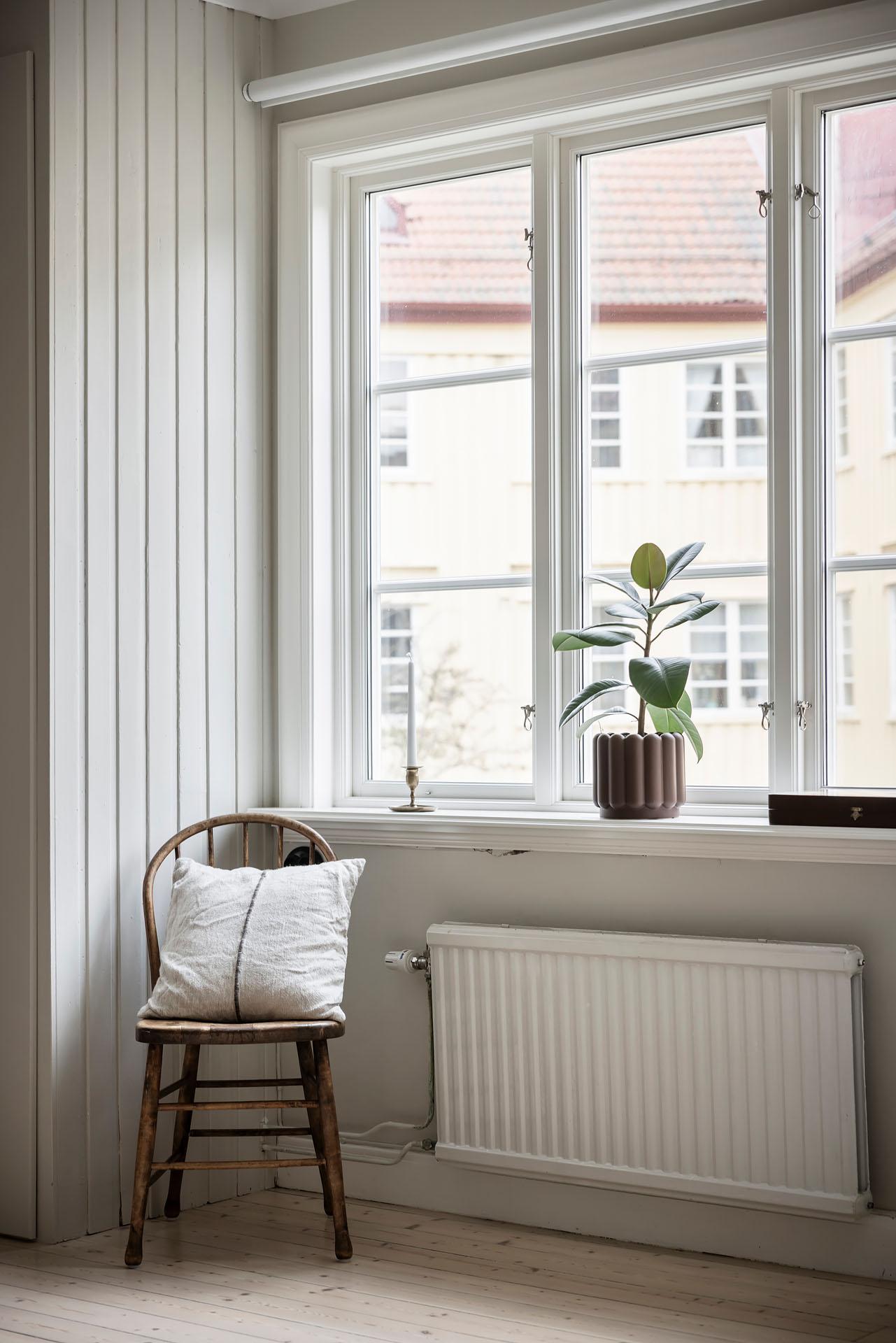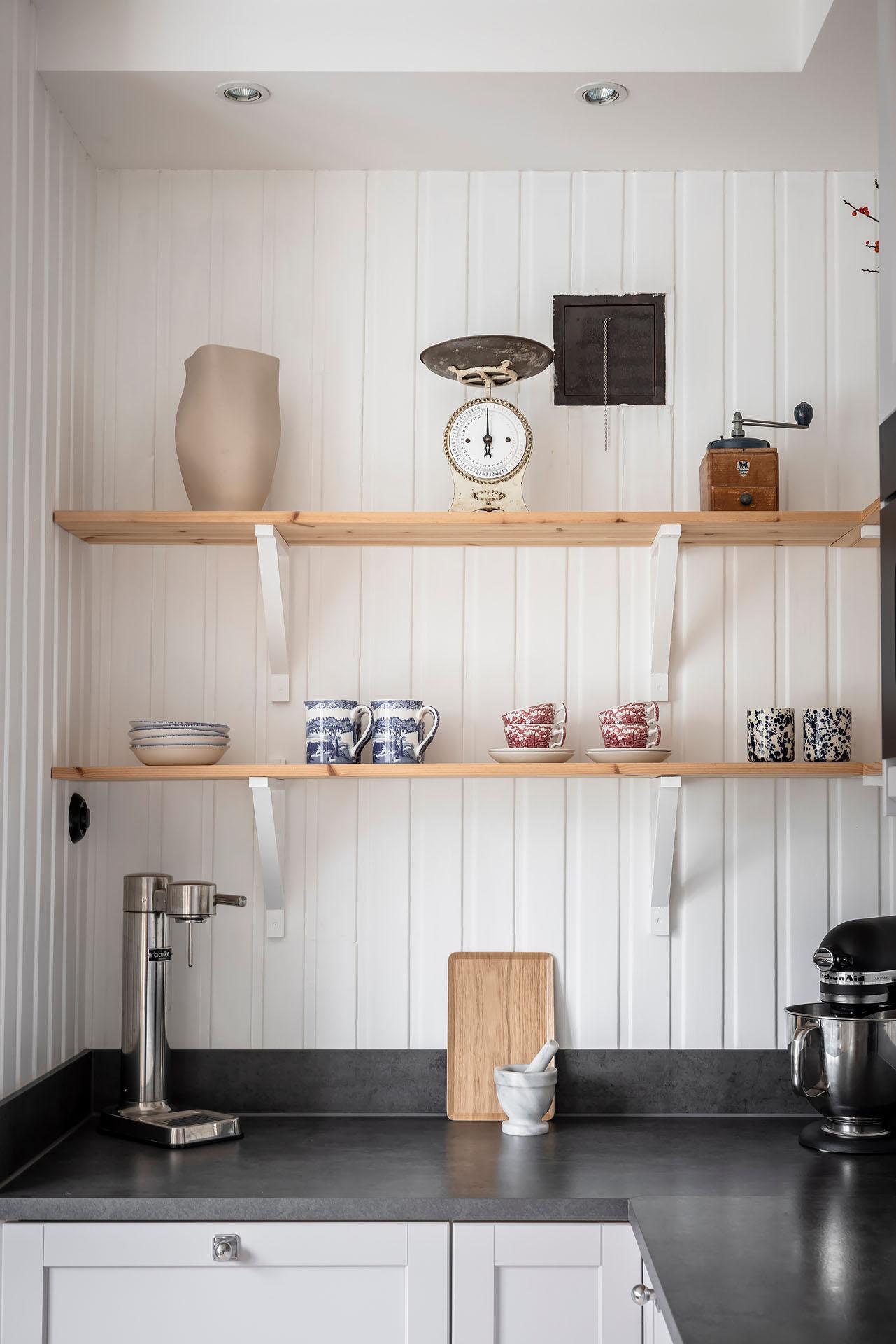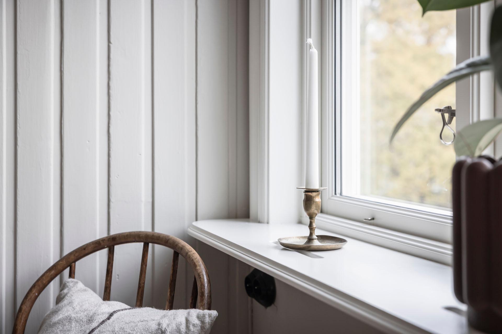 Hallen är välkomnande, och här hänger man av sig ytterkläderna under en fin hatthylla direkt innanför ytterdörren. Både hatthyllan och skohyllan, med en bänk att slå sig ner på, är platsbyggda. Det framtagna brädgolvet är vitlaserat och väggarna, inklusive den fina spontpanelen, målade i vitt.