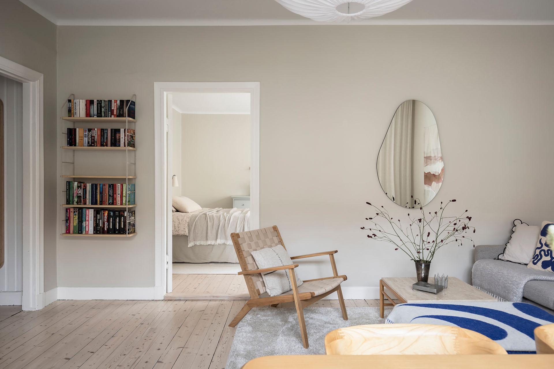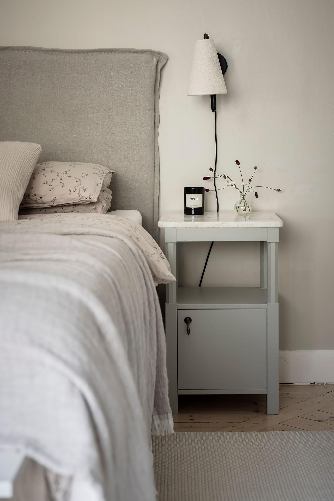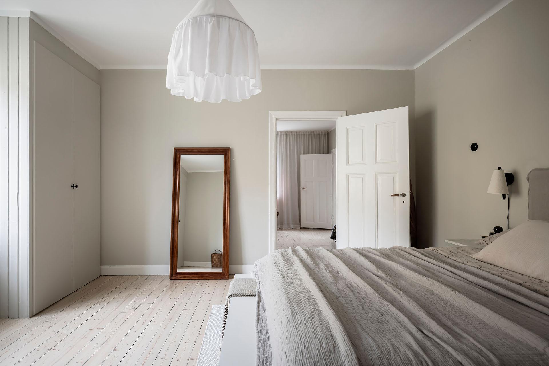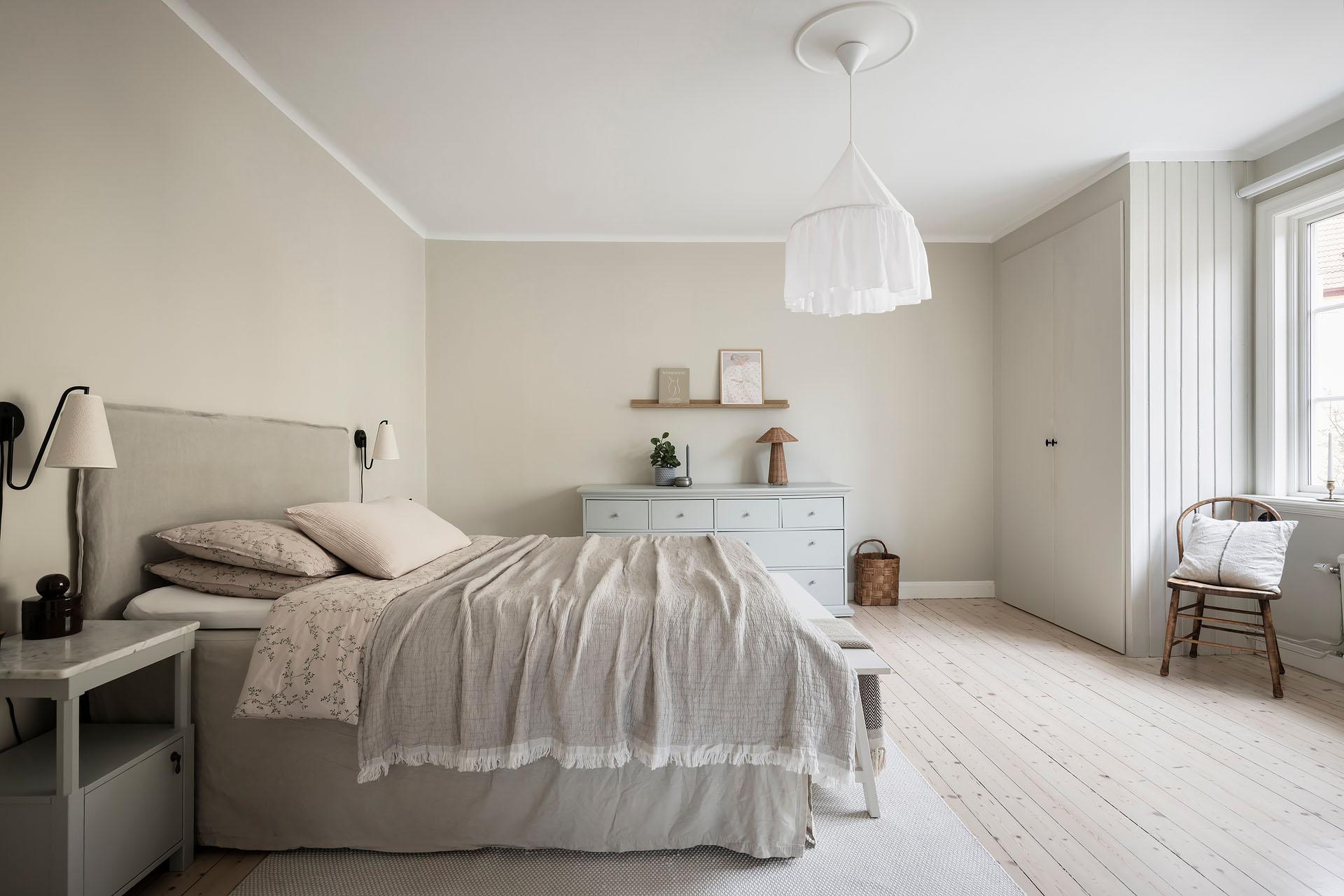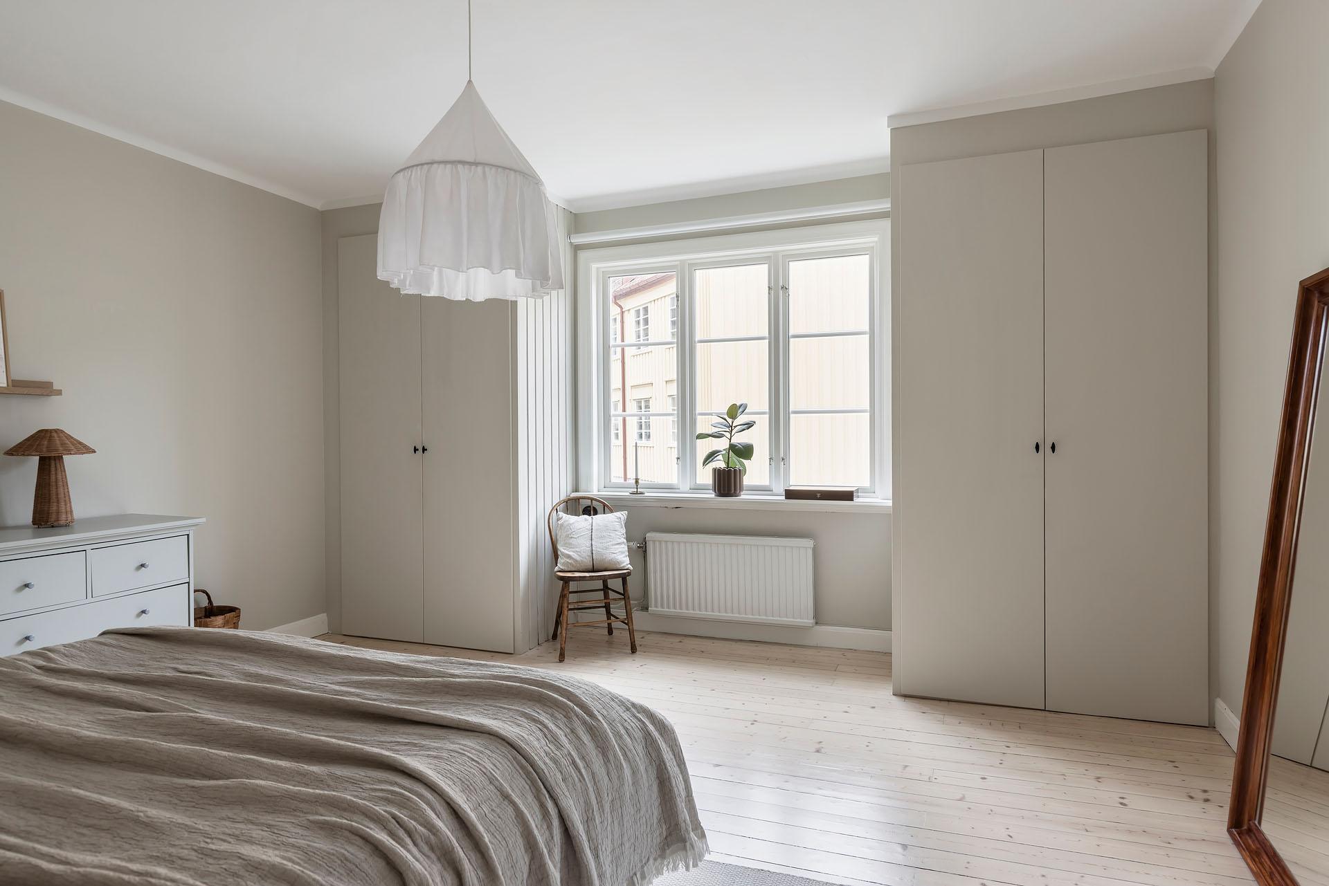 Sovrummet rymmer lätt och ledigt en dubbelsäng med nattduksbord, och tack vare det rofyllda gårdsläget sover man gott om natten. Det finns även gott om utrymme för ett skrivbord och för att komplettera de två platsbyggda dubbelgarderoberna med ytterligare förvaring. Det framtagna brädgolvet är vitlaserat och väggarna målade i samma ljusbeige kulör som i vardagsrummet. Taket pryds av en takrosett.