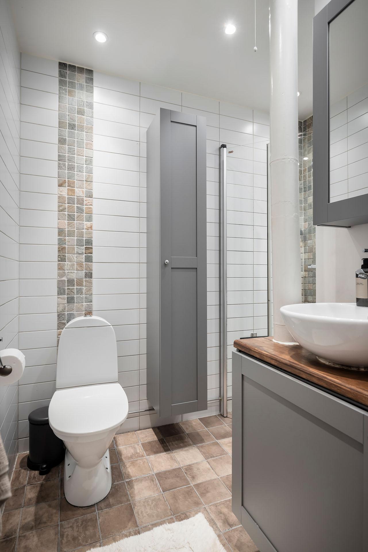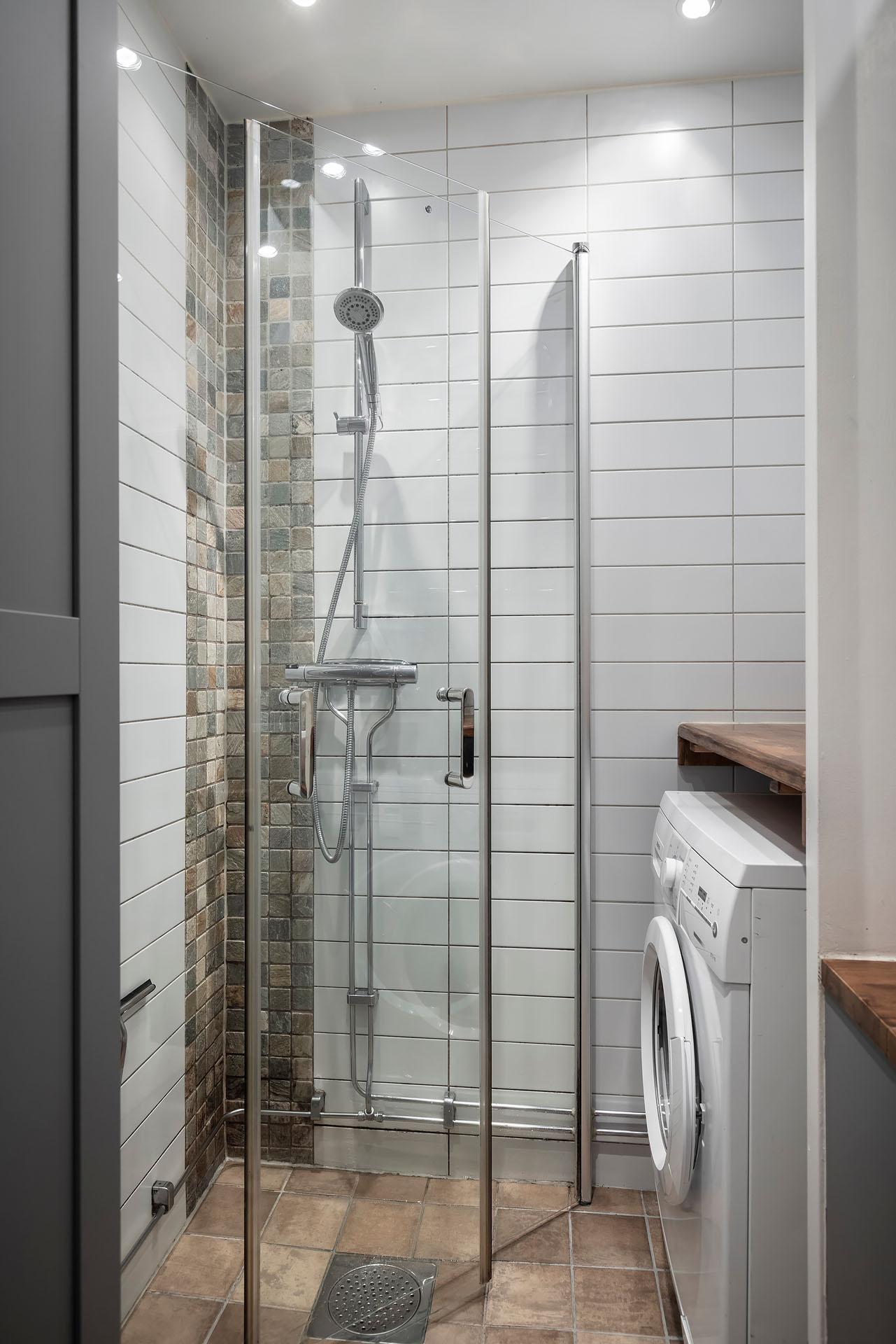 Från hallen leder en spegeldörr med vackert dekorglas in till ett fräscht badrum med duschhörna, handdukstork, handfat, kommod, spegelskåp, högskåp, toalett, tvättmaskin och arbetsbänk. Väggarna är klädda med vitt kakel och golvet belagt med brun stenklinker med golvvärme.