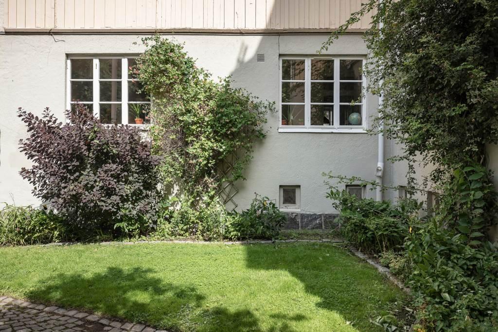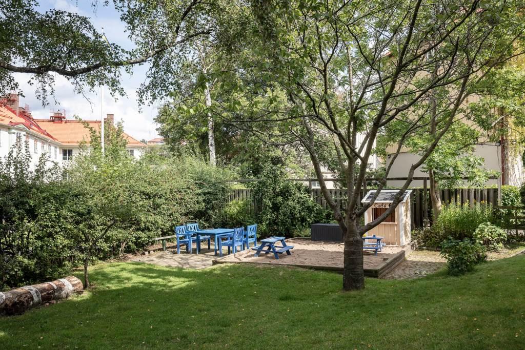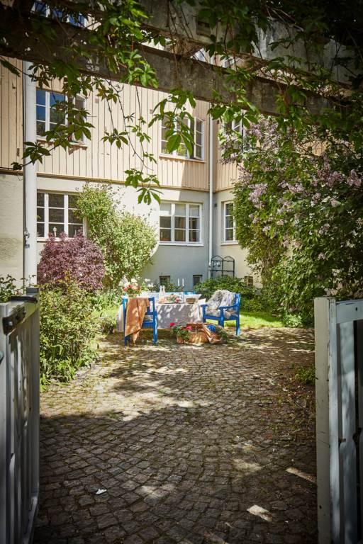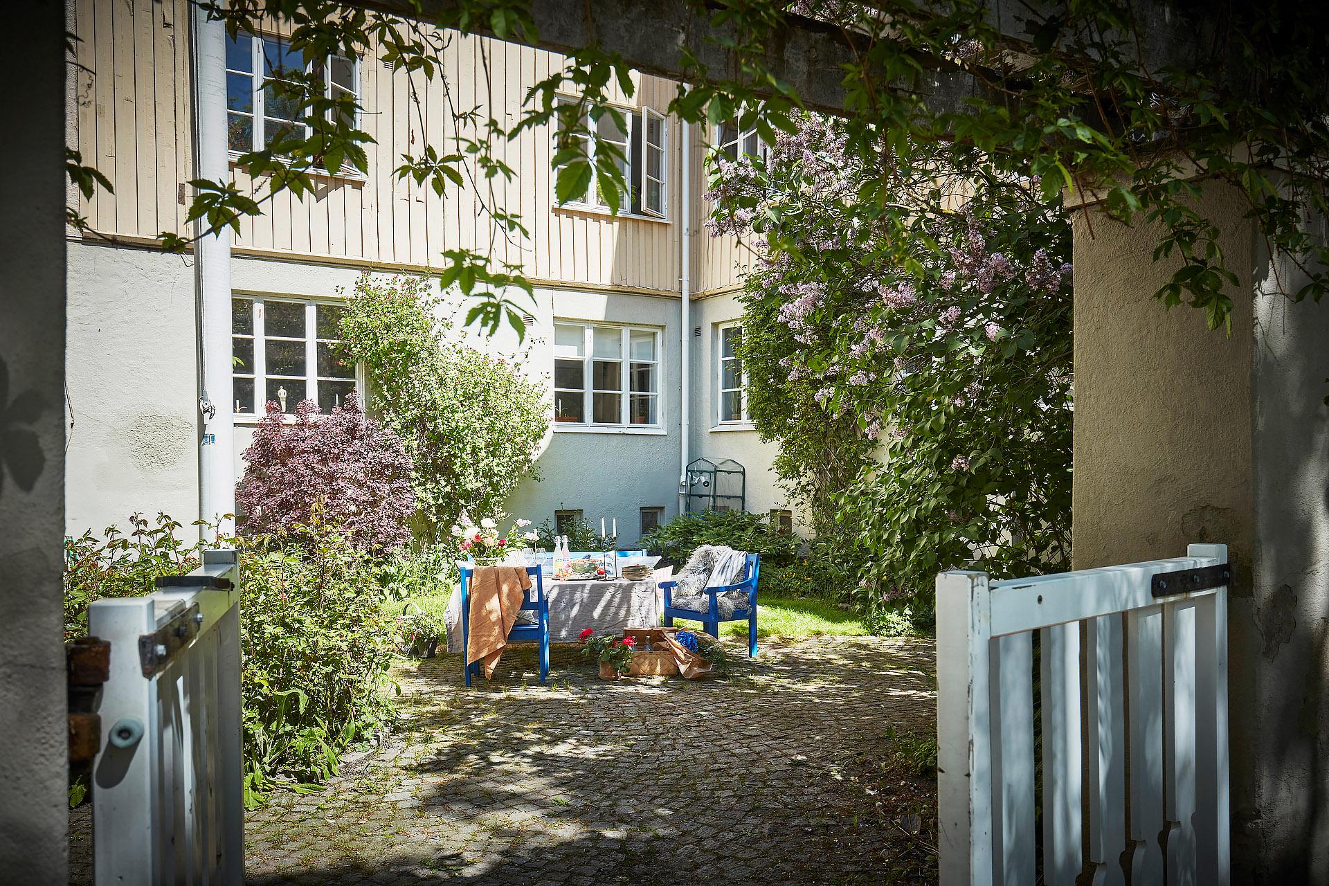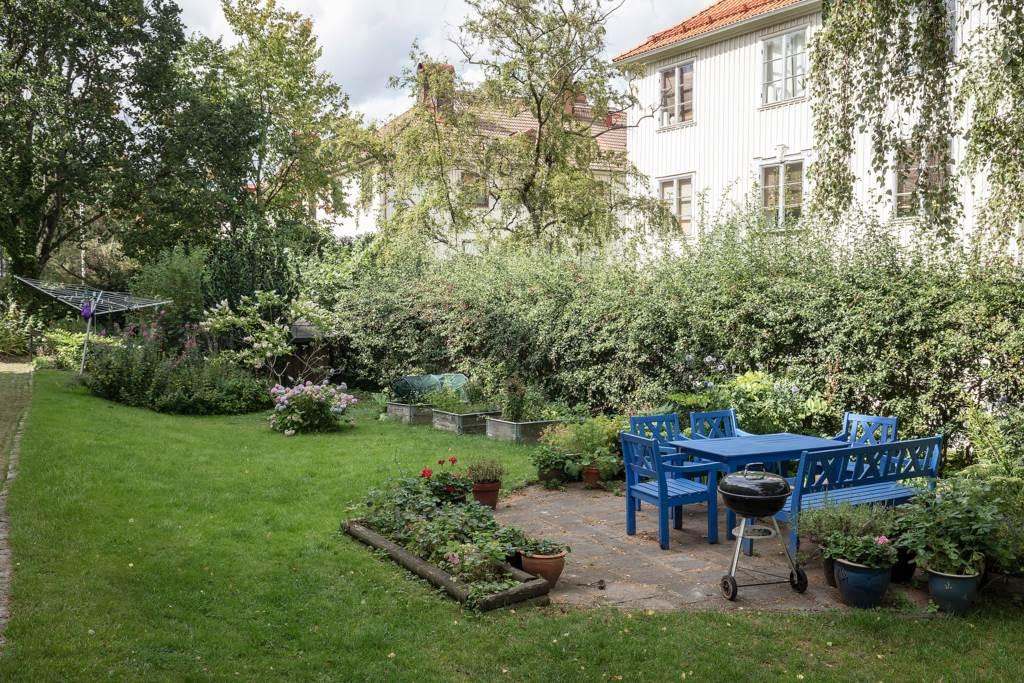 Ljusinsläppet är magiskt och träden utanför fönstren i söder låter solens strålar skimra. Bevarade originalsnickerier såsom lister, takrosetter, spegeldörrar, skafferi och spontpanel ger en charmig inramning, och de viltlaserade brädgolven är lika vackra som sköna att gå på. Lägenheten ligger i ett av de tre landshövdingehus – två i Bagaregården och ett i Kungsladugård – som uppfördes under åren 1917 och 1918 som bostadshus för spårvagnsförare. Föreningen bildades redan i samband med att husen stod klara och är därmed en av stadens äldsta. Dessutom är det en förening som tar väl hand om sina fastigheter, och sommartid badar de välskötta gårdsmiljöerna i lummig grönska. Här i Bagaregården växer stockros, violer, syren, rosor med mera, och i odlingslådor odlas bär, grönsaker och kryddor. Det finns även trädgårdsmöbler, flaggstänger och gammaldags gatsten, och hela gården omsluts av ett vitt staket med grindar. Familjär stämning råder grannar emellan, och titt som tätt träffas man spontant och fikar eller grillar tillsammans.