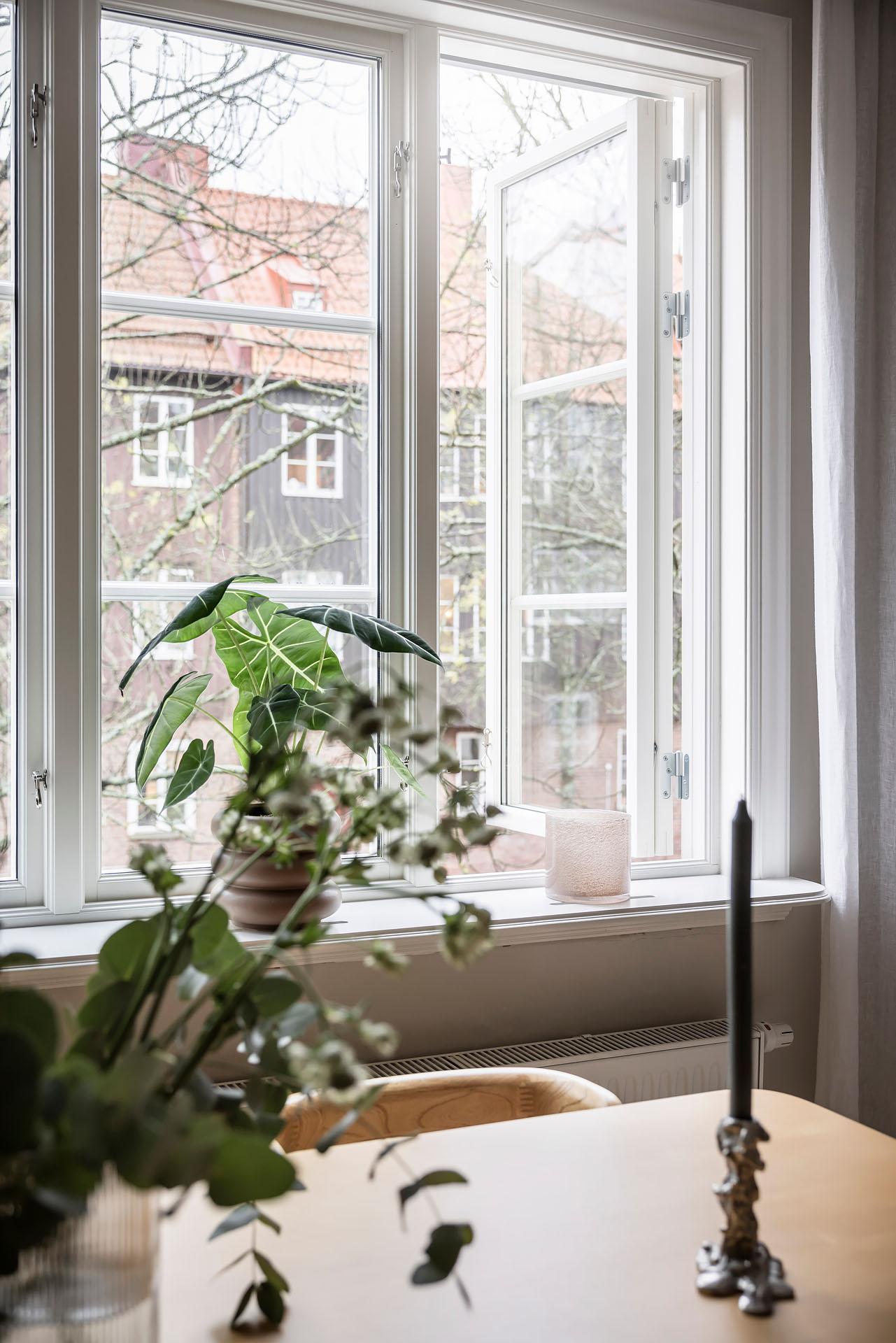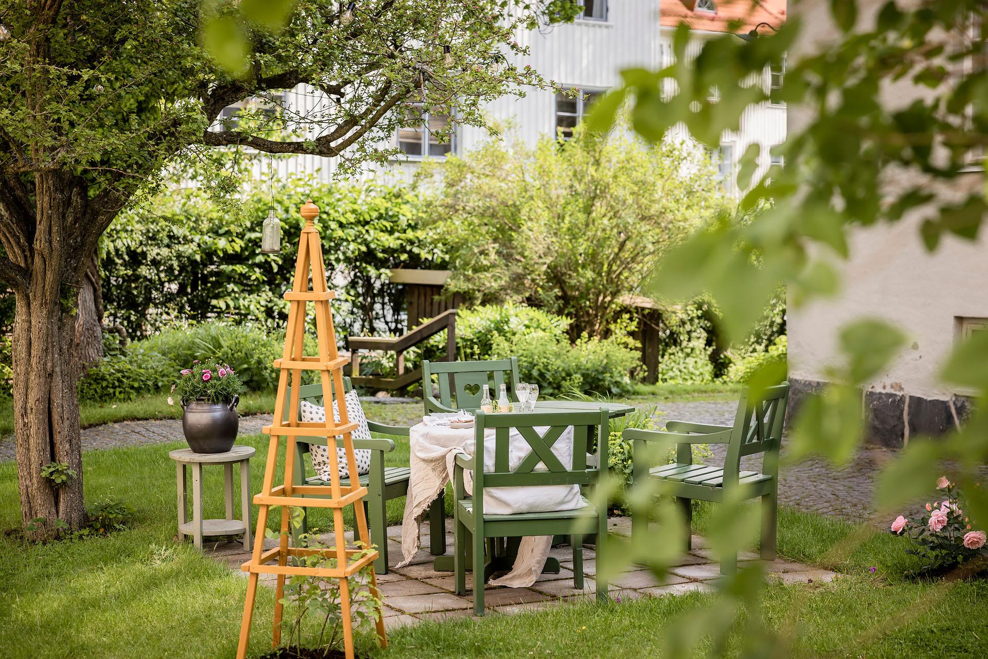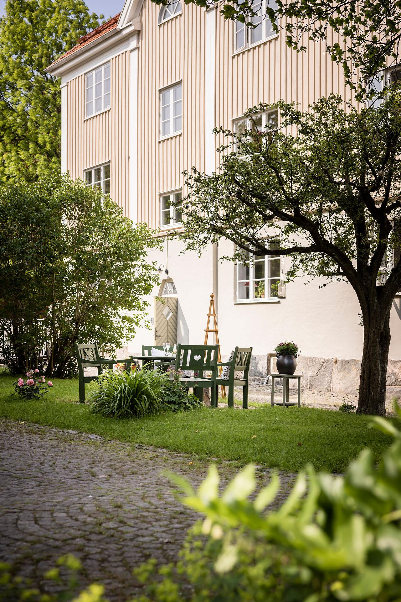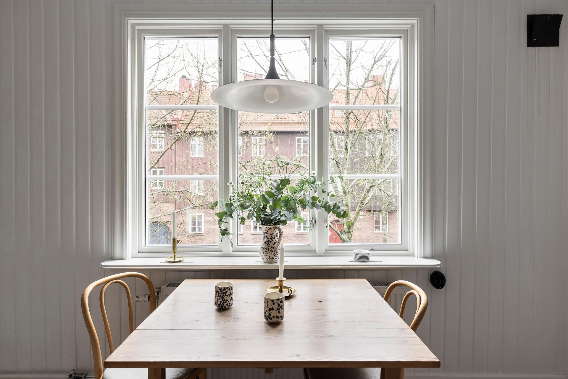 Ljusinsläppet är magiskt och träden utanför fönstren i söder låter solens strålar skimra. Bevarade originalsnickerier såsom lister, takrosetter, spegeldörrar, skafferi och spontpanel ger en charmig inramning, och de viltlaserade brädgolven är lika vackra som sköna att gå på. Lägenheten ligger i ett av de tre landshövdingehus – två i Bagaregården och ett i Kungsladugård – som uppfördes under åren 1917 och 1918 som bostadshus för spårvagnsförare. Föreningen bildades redan i samband med att husen stod klara och är därmed en av stadens äldsta. Dessutom är det en förening som tar väl hand om sina fastigheter, och sommartid badar de välskötta gårdsmiljöerna i lummig grönska. Här i Bagaregården växer stockros, violer, syren, rosor med mera, och i odlingslådor odlas bär, grönsaker och kryddor. Det finns även trädgårdsmöbler, flaggstänger och gammaldags gatsten, och hela gården omsluts av ett vitt staket med grindar. Familjär stämning råder grannar emellan, och titt som tätt träffas man spontant och fikar eller grillar tillsammans.