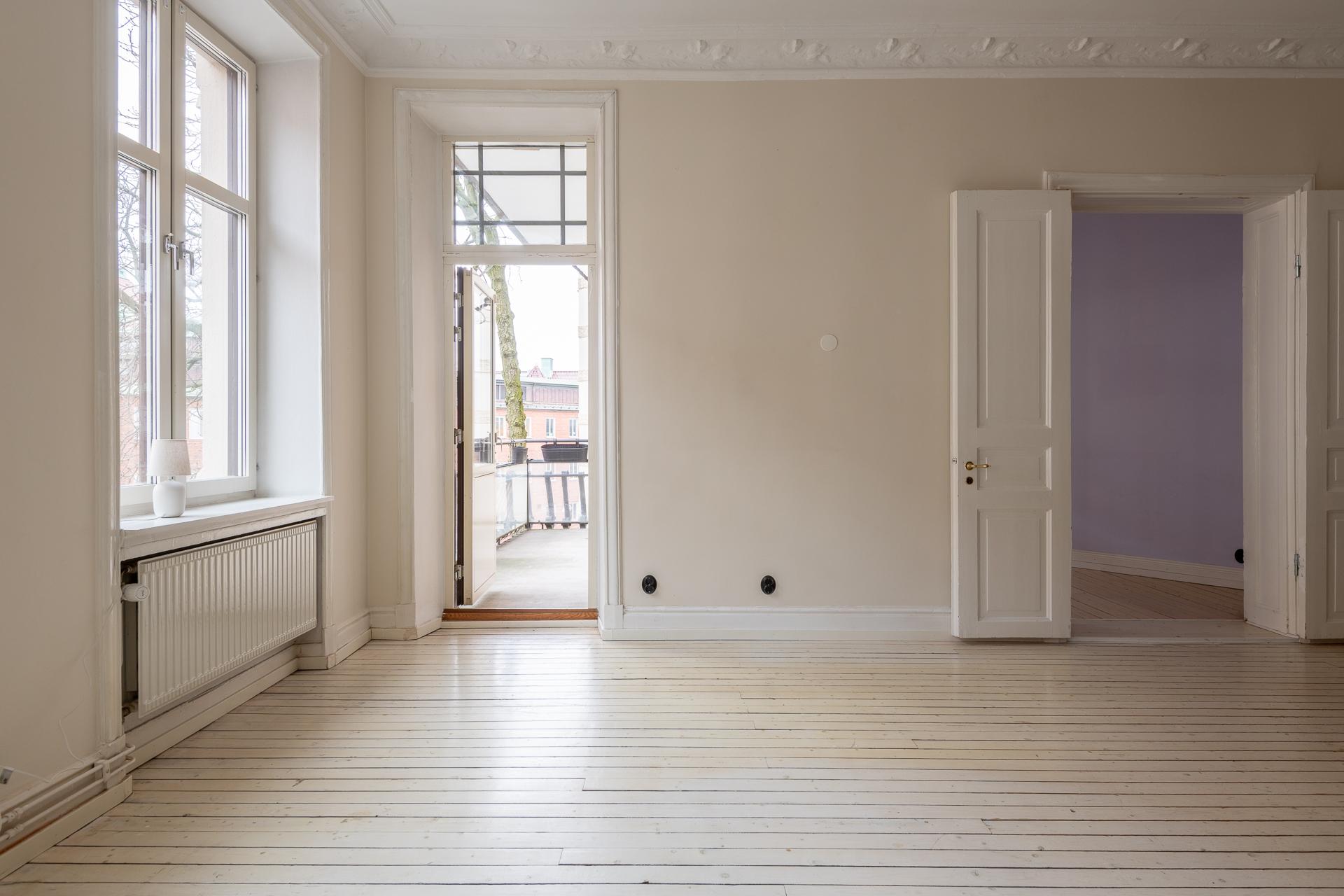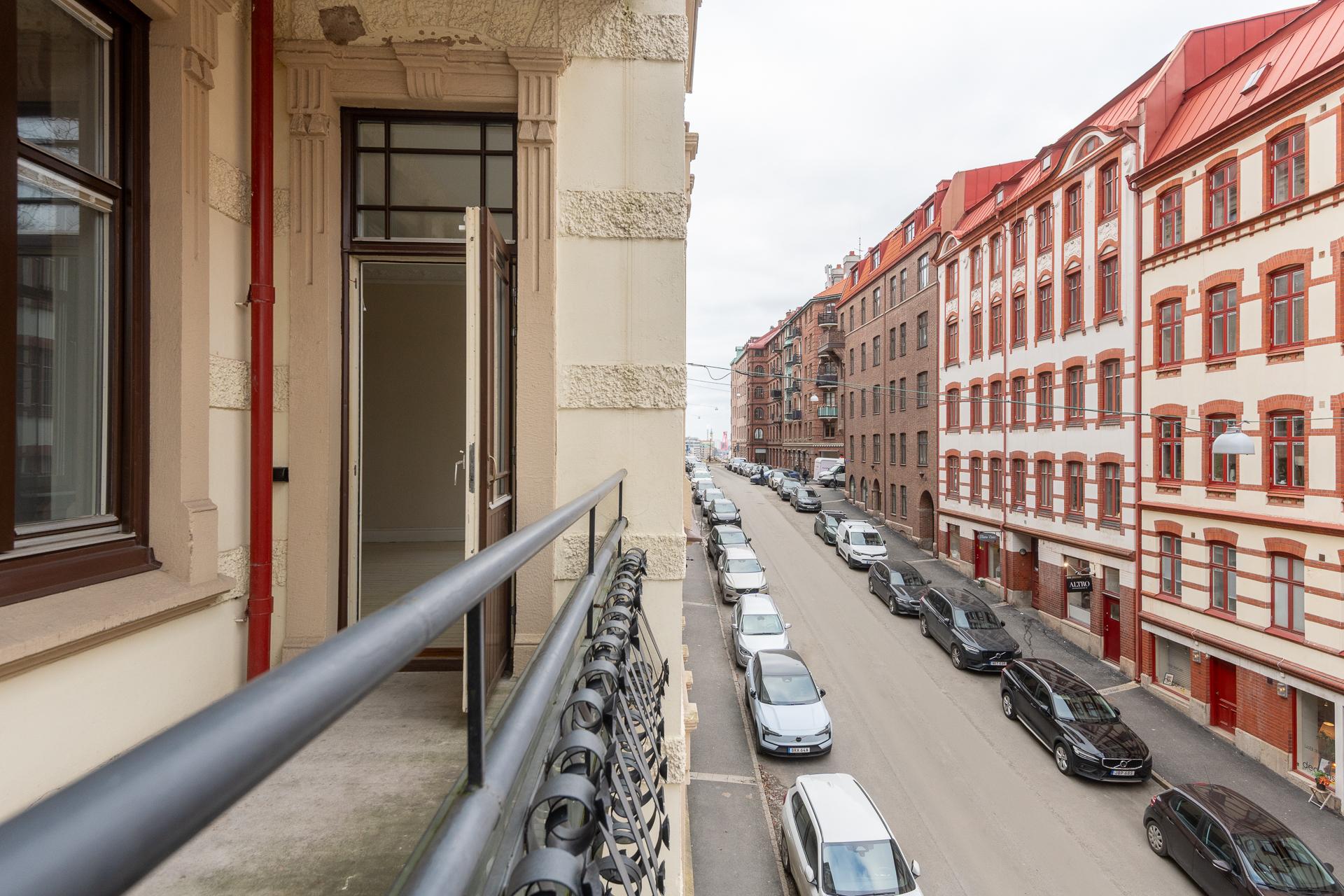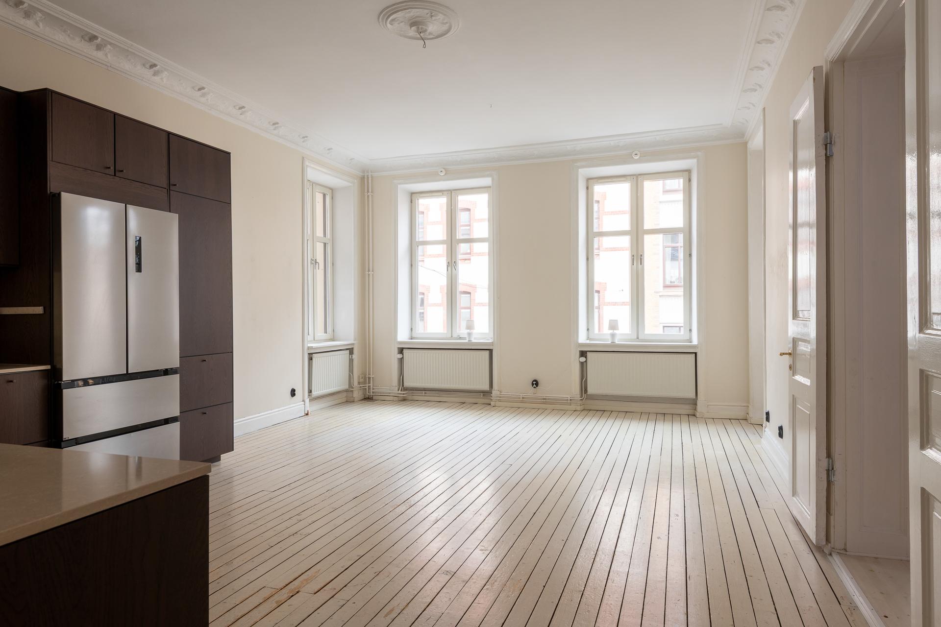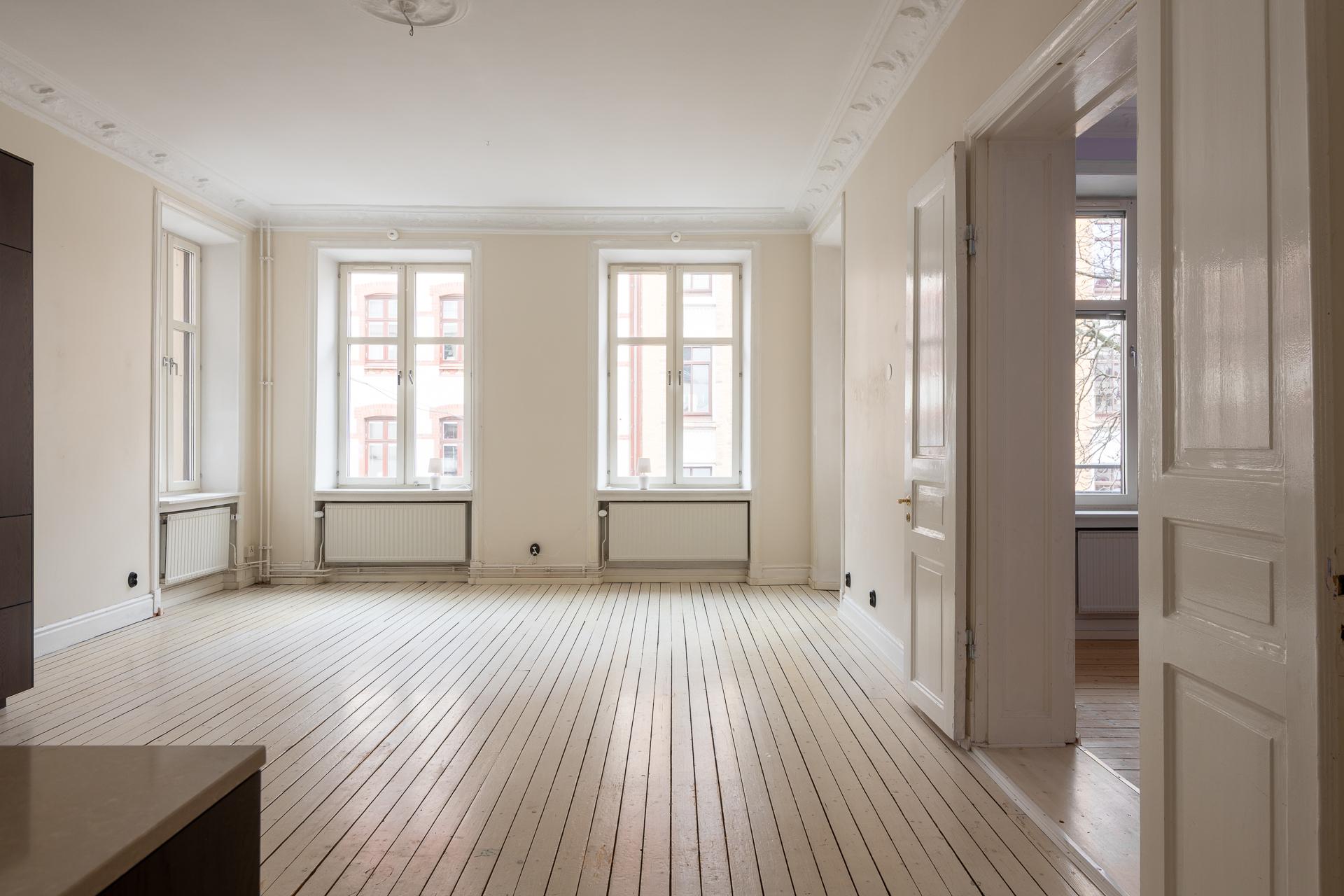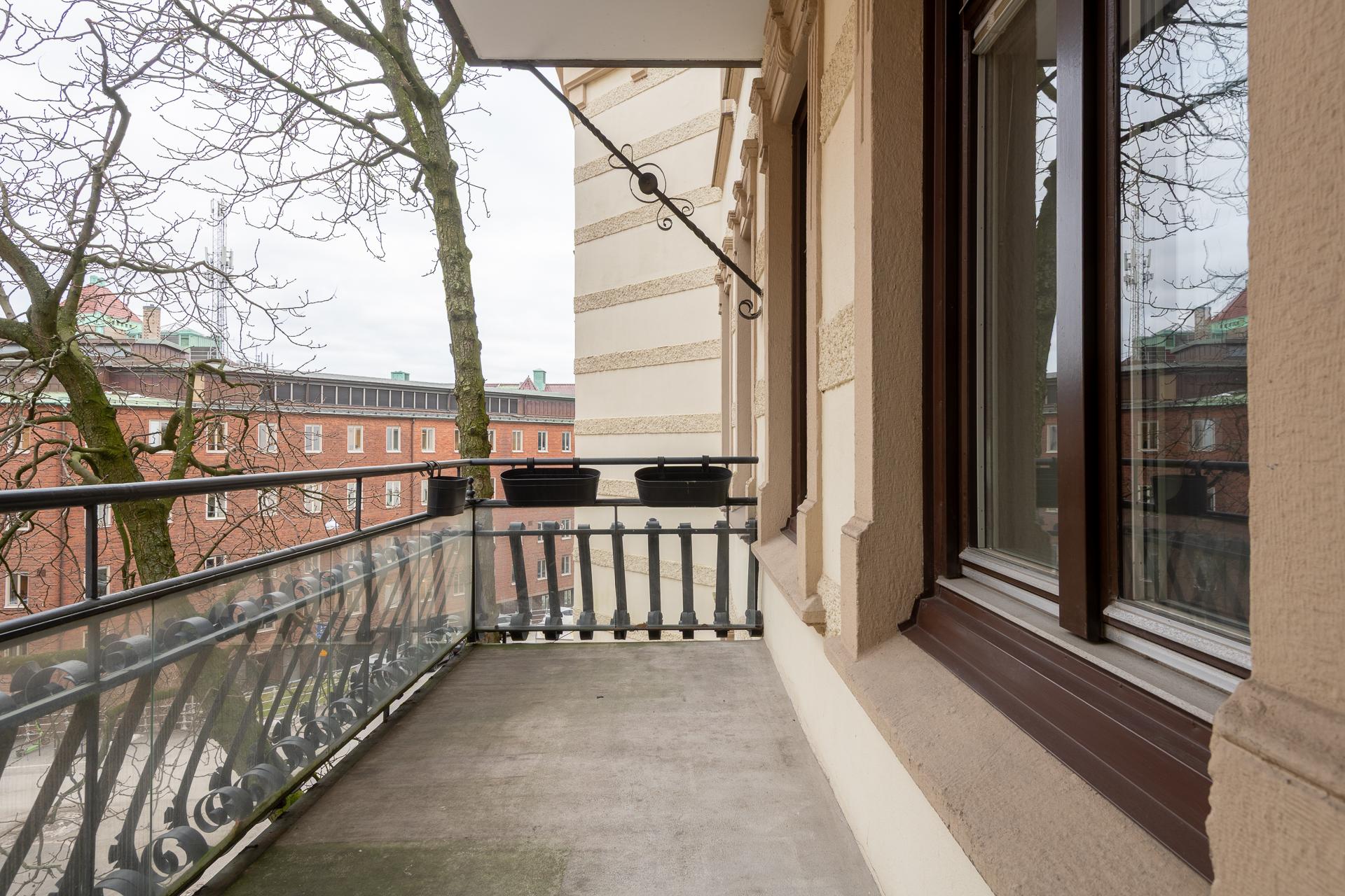 Fint renoverad fyrarummare med öppen planlösning mellan kök och vardagsrum. Stor balkong med utgång från vardagsrummet. Stolta 320 centimeter i takhöjd. Brädgolv, stuckaturer och snickerier vittnar om husets mångåriga historia. Lägenheten är registrerad som 2 rok i SBC;s papper men används som 4 rok.