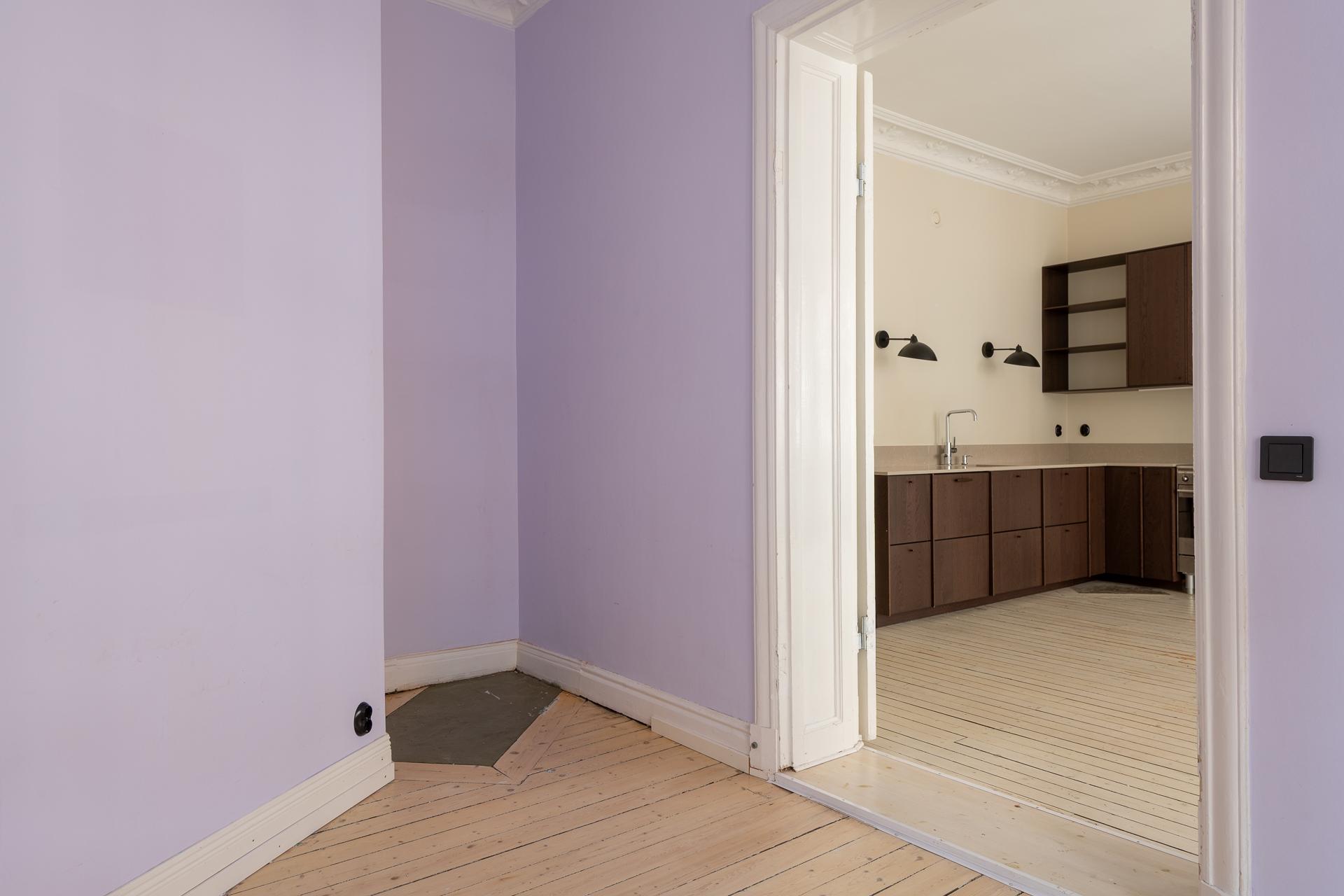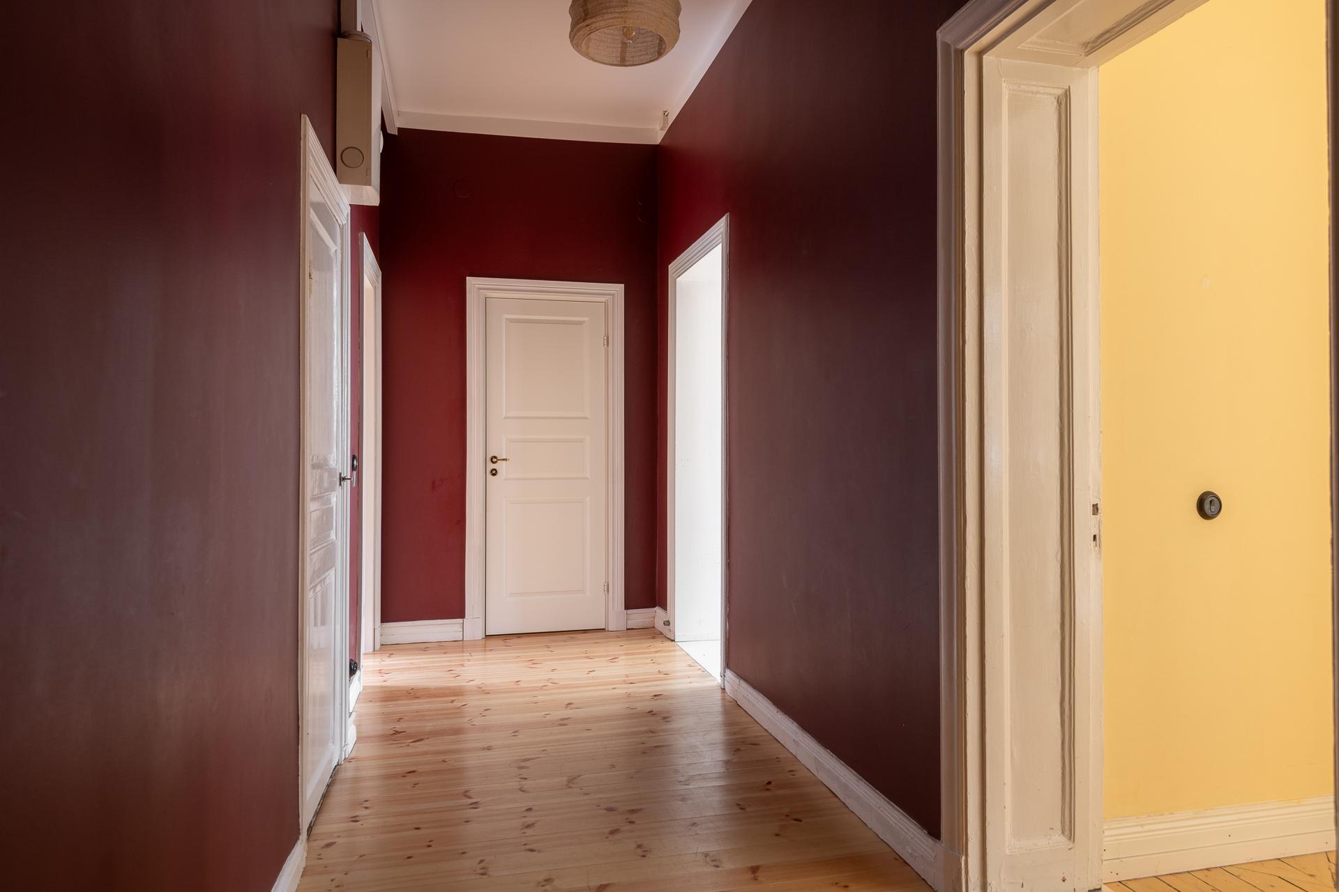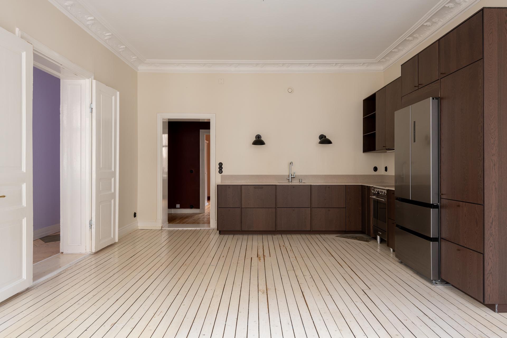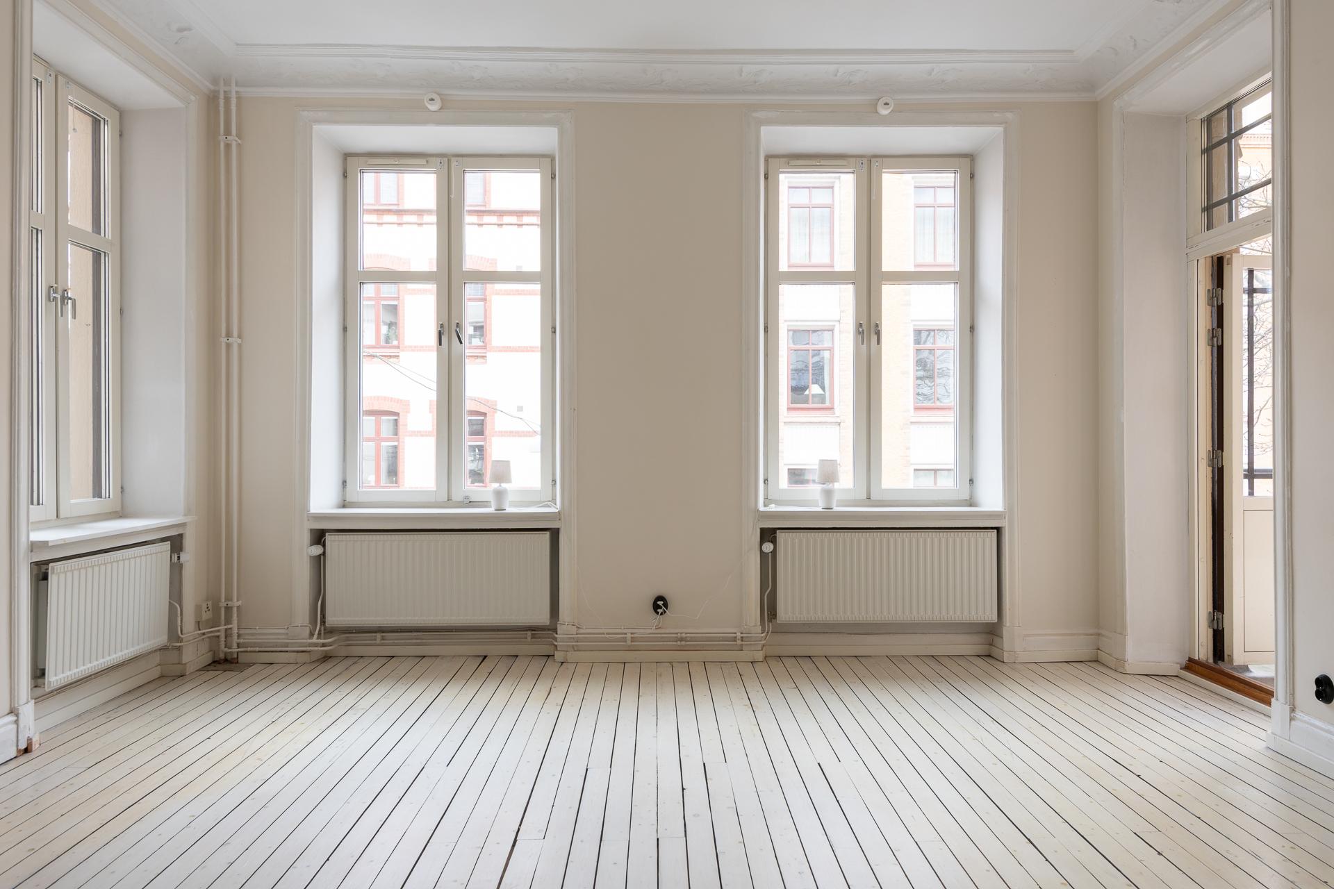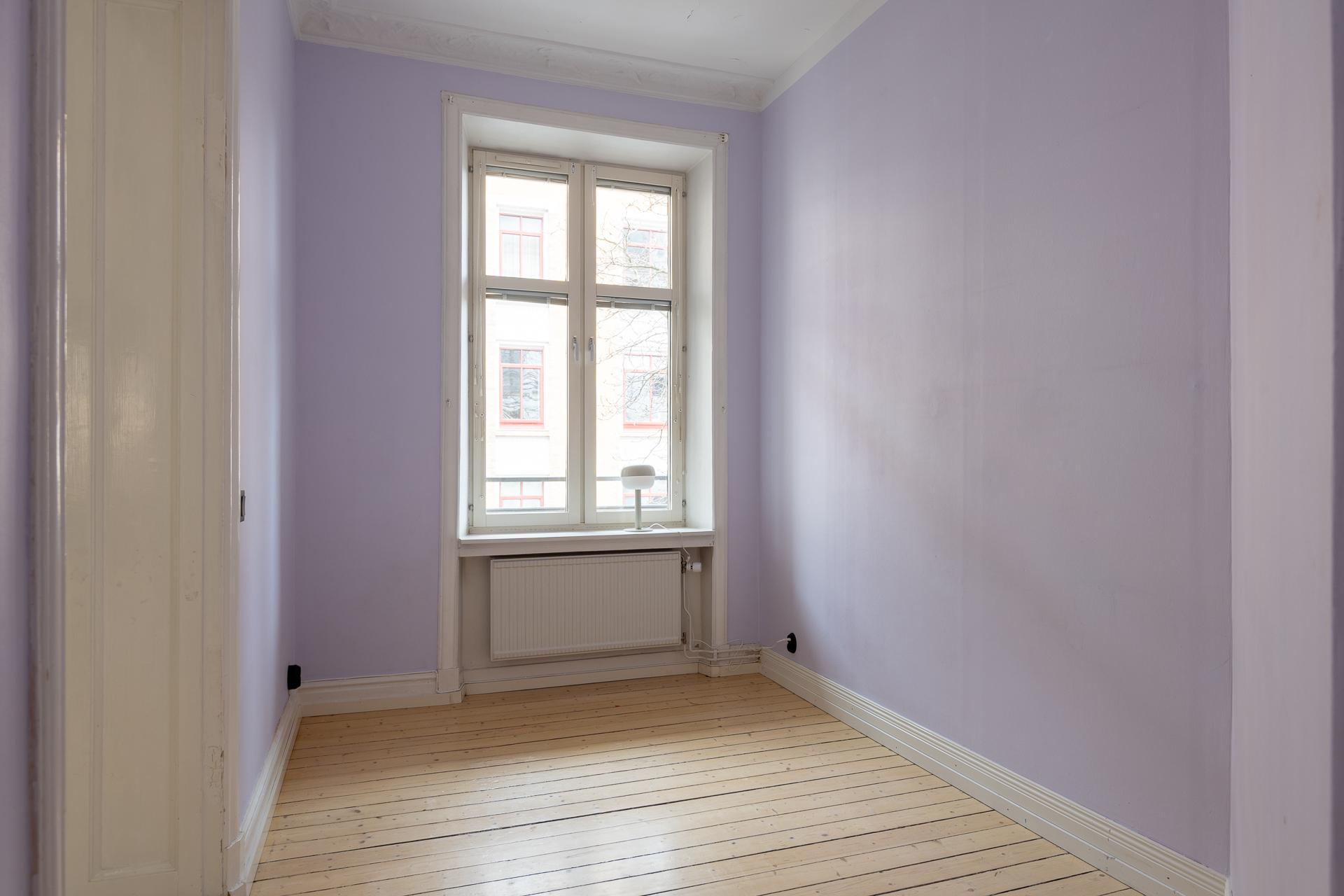 Fint renoverad fyrarummare med öppen planlösning mellan kök och vardagsrum. Stor balkong med utgång från vardagsrummet. Stolta 320 centimeter i takhöjd. Brädgolv, stuckaturer och snickerier vittnar om husets mångåriga historia. Lägenheten är registrerad som 2 rok i SBC;s papper men används som 4 rok.