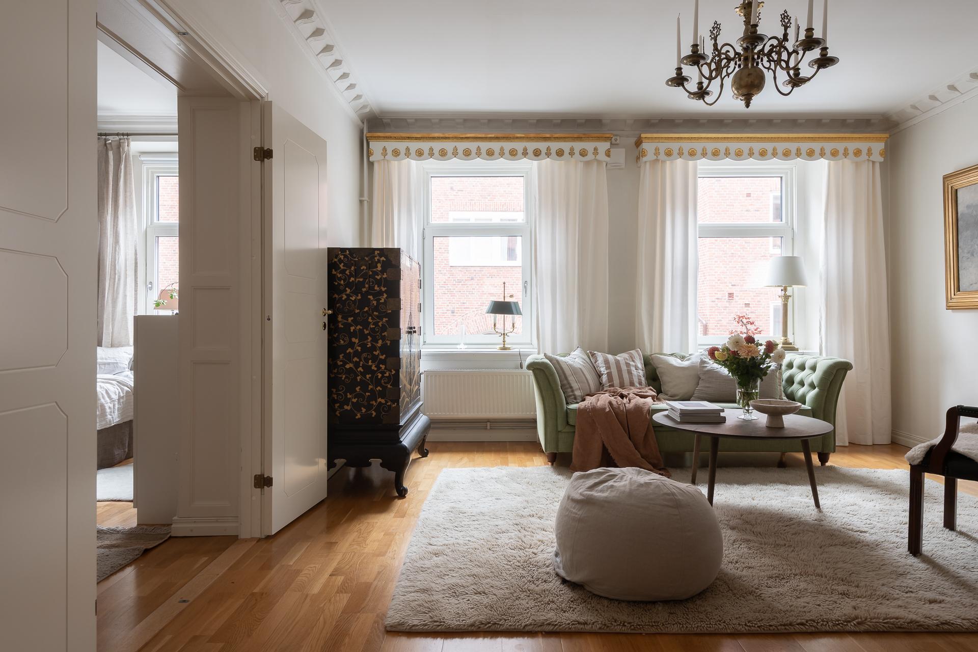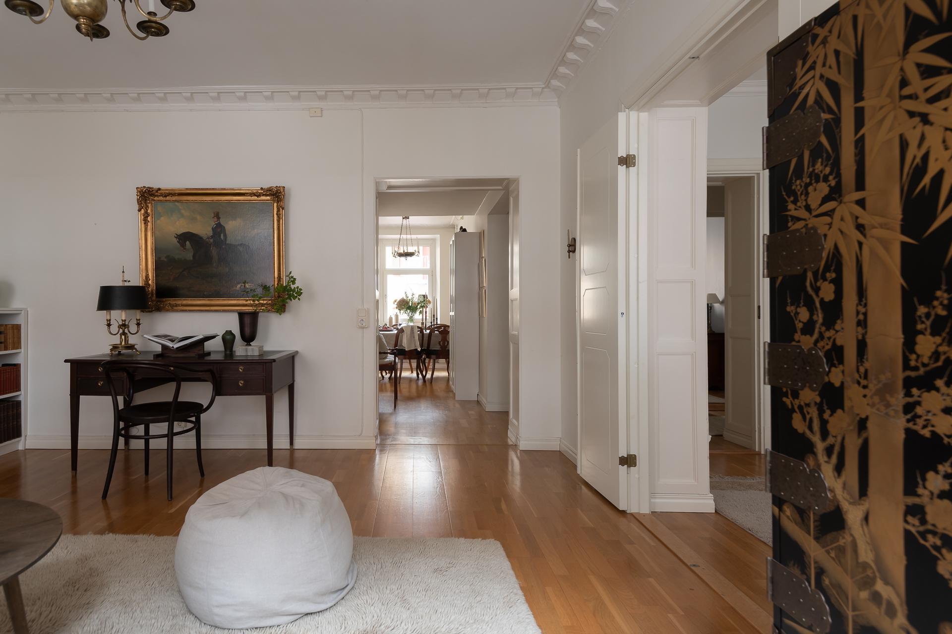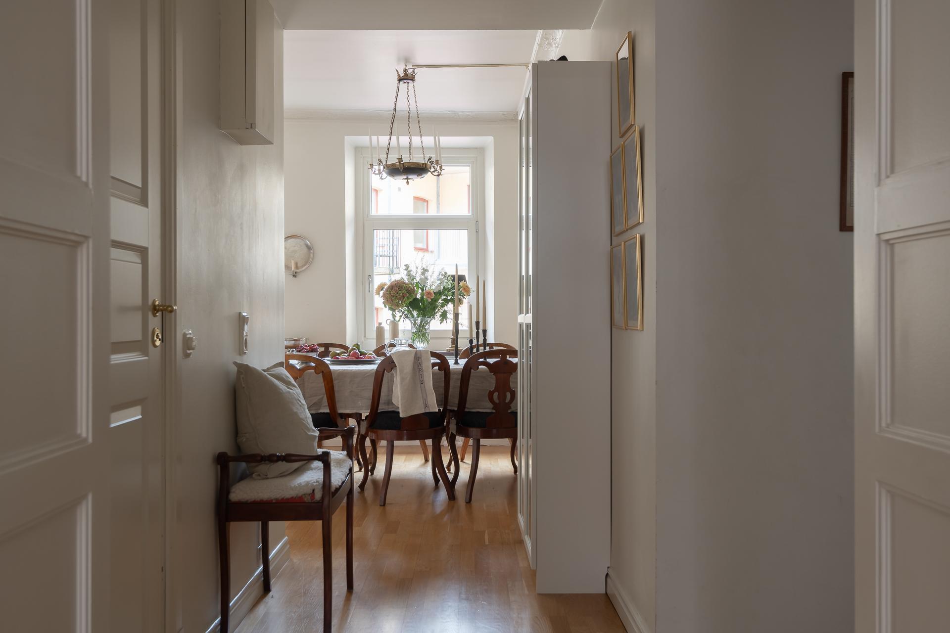 Vardagsrummet vetter åt Ingenjörsgatan där två stora fönster ger fint ljusinsläpp. Under morgon- och förmiddag strålar solljuset in och ger fritt spelrum för solkatterna att ta för sig. Sekelskiftet gör sig påmint med en fin stuckatur och takrosett och takhöjden mäter ca 270 centimeter. Rummets tacksamma storlek och utformning gör att ni enkelt får plats med både soffgrupp, fåtölj och tv-möbel. Önskar man matbord finns det plats även för det. I fil med vardagsrummet ligger ett av de två sovrummen.