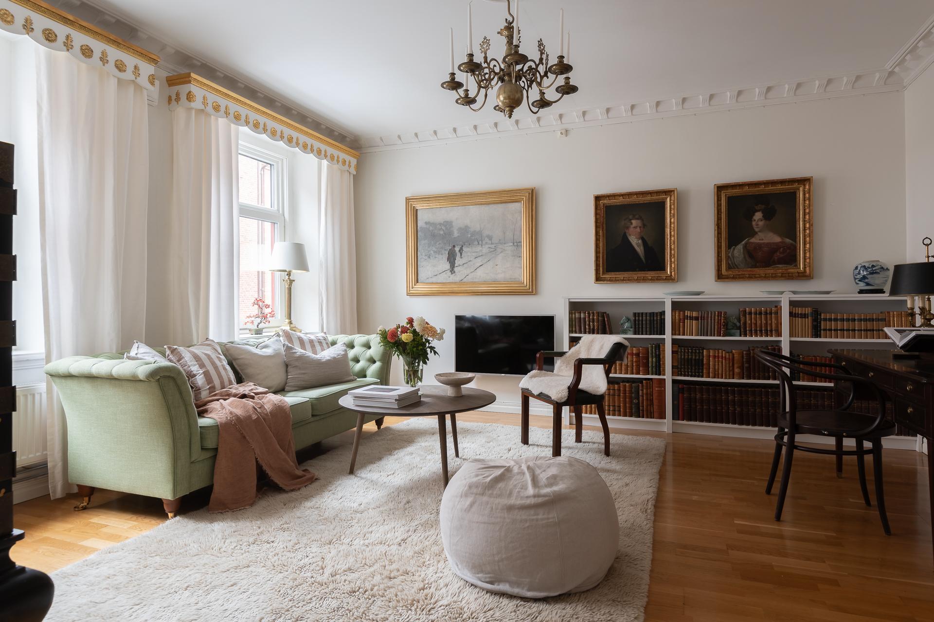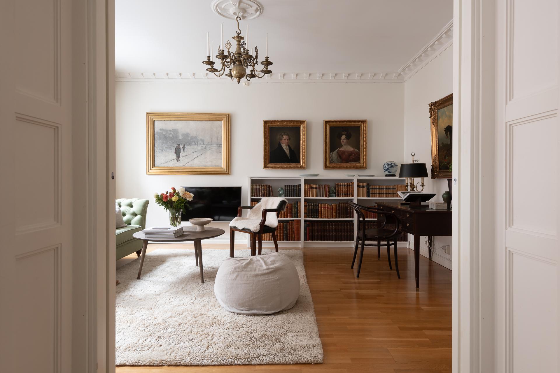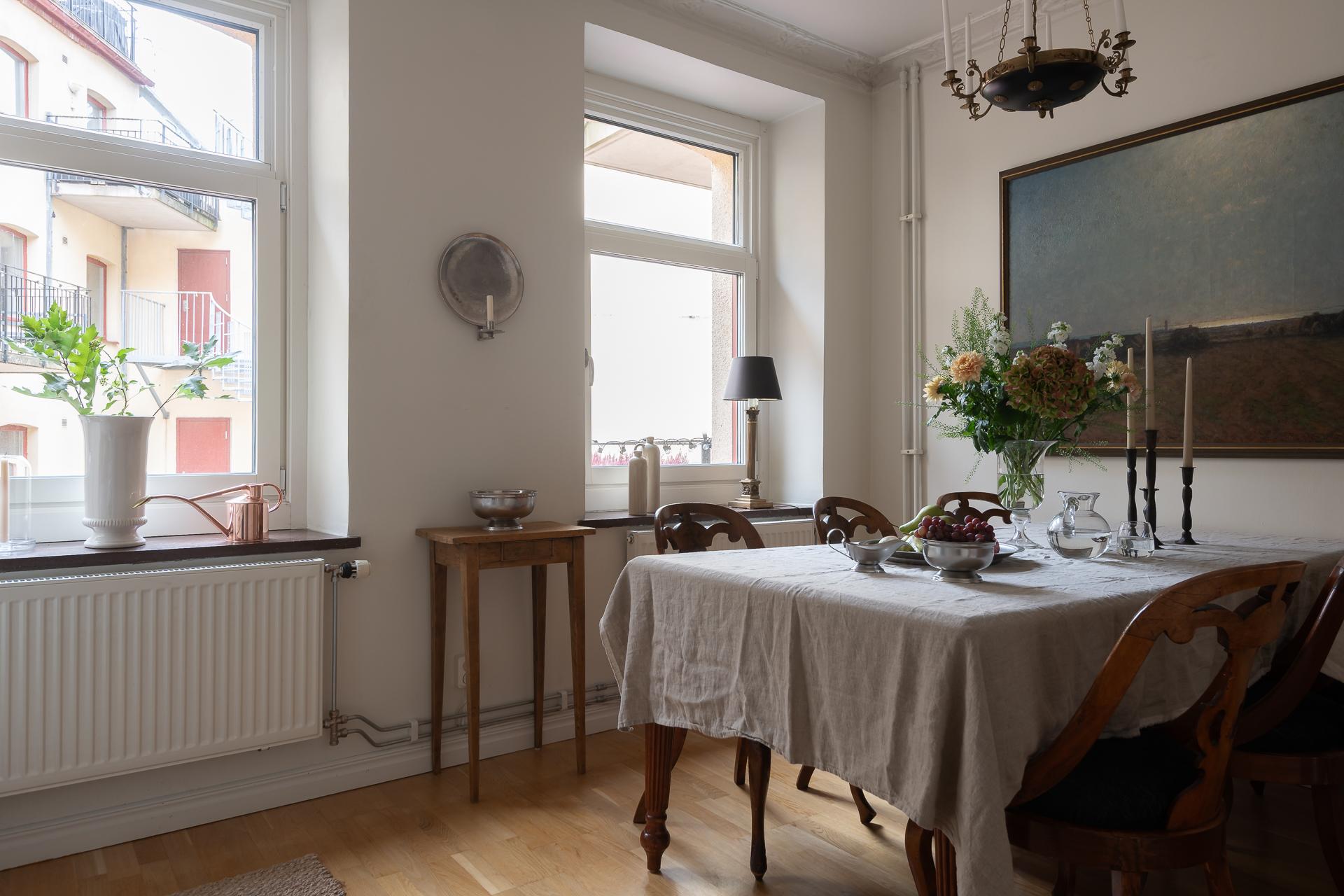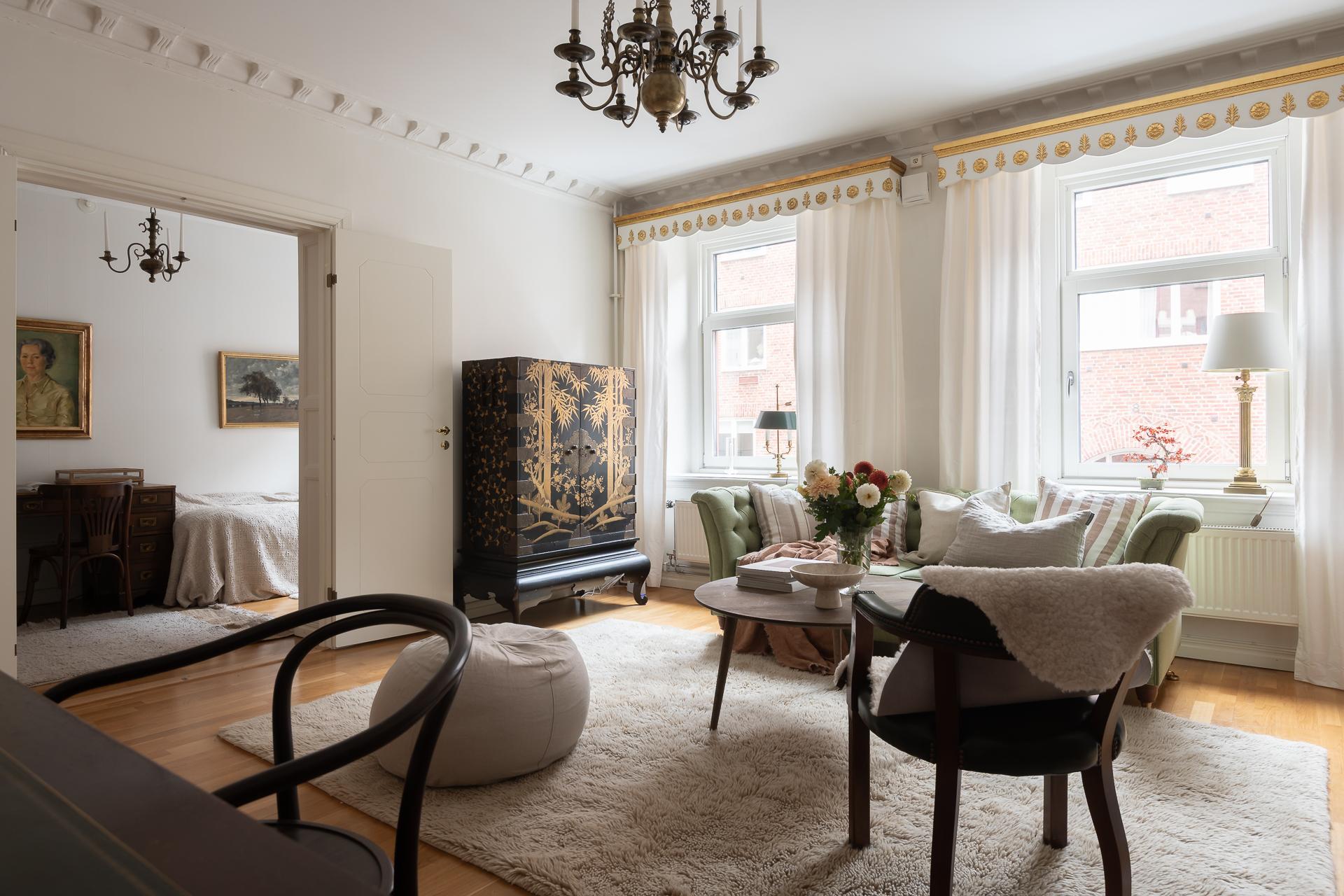 Vardagsrummet vetter åt Ingenjörsgatan där två stora fönster ger fint ljusinsläpp. Under morgon- och förmiddag strålar solljuset in och ger fritt spelrum för solkatterna att ta för sig. Sekelskiftet gör sig påmint med en fin stuckatur och takrosett och takhöjden mäter ca 270 centimeter. Rummets tacksamma storlek och utformning gör att ni enkelt får plats med både soffgrupp, fåtölj och tv-möbel. Önskar man matbord finns det plats även för det. I fil med vardagsrummet ligger ett av de två sovrummen.