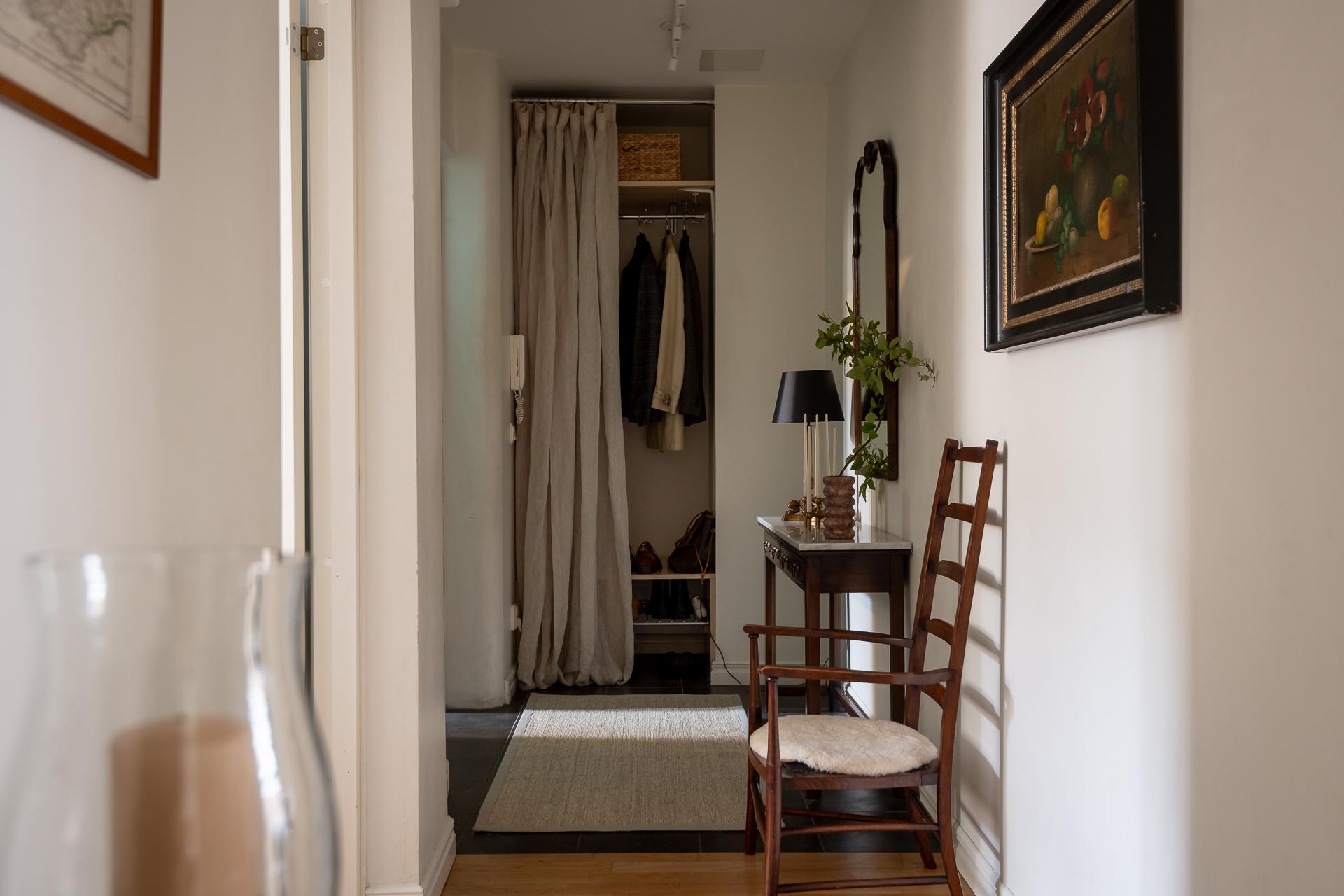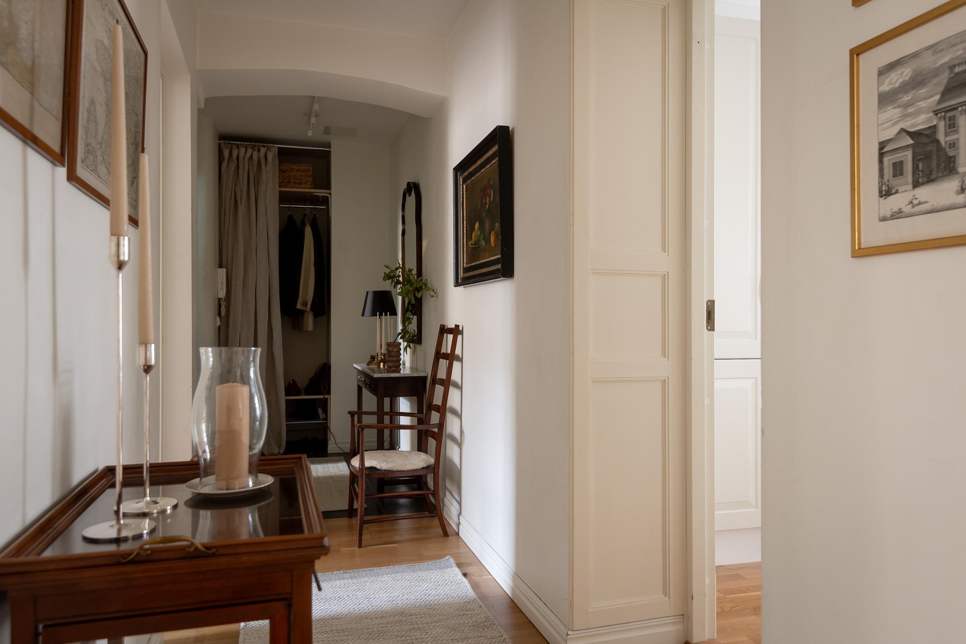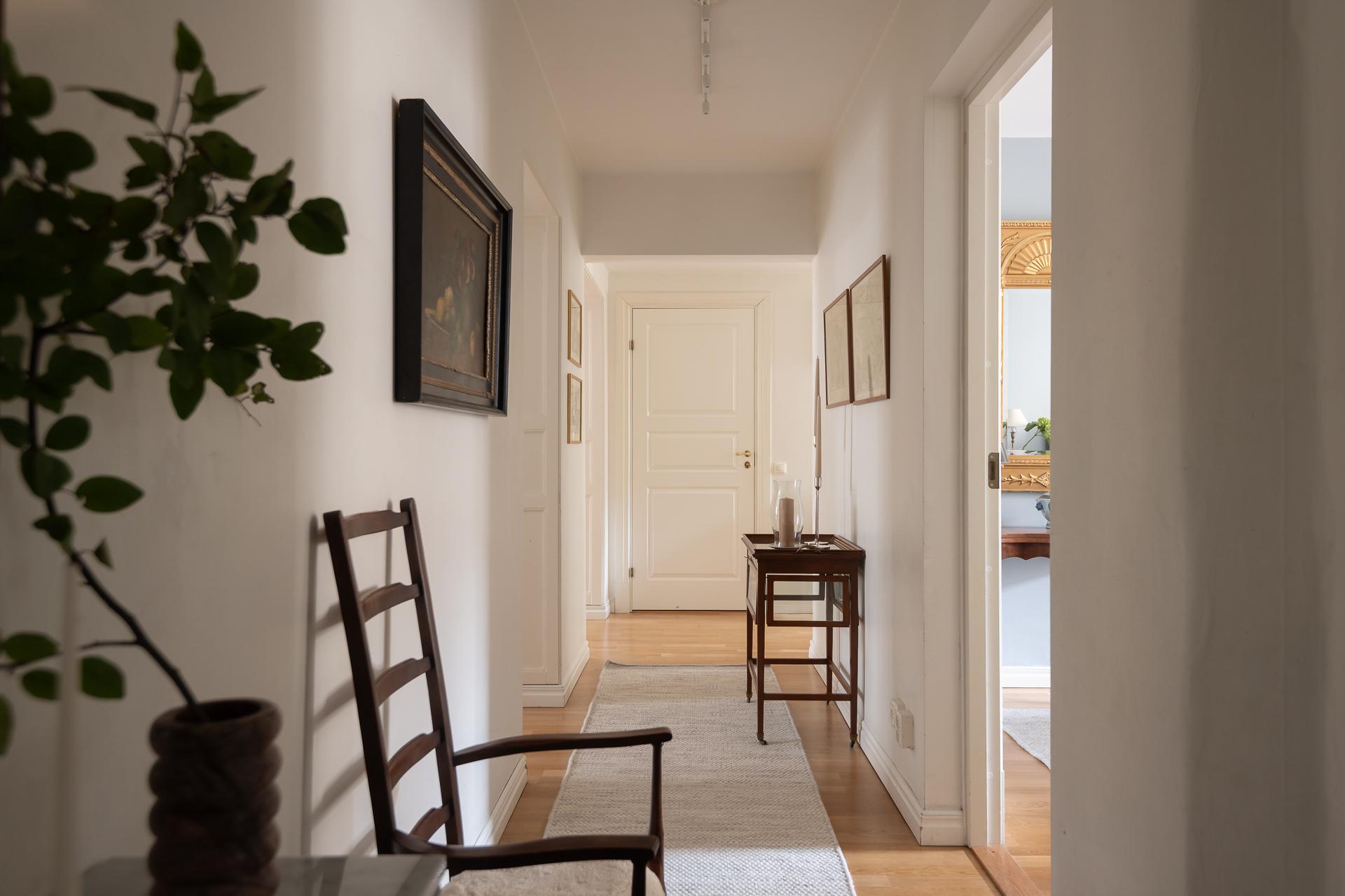 Hallen tar för sig sådär lagom mycket och bjuder på all den funktion man vill ha. Perfekt, dold, förvaring till vänster där hushållets jackor och skor får plats. Finns också plats för kroklister och hatthylla om man vill. Från hallen når ni bostadens samtliga rum.