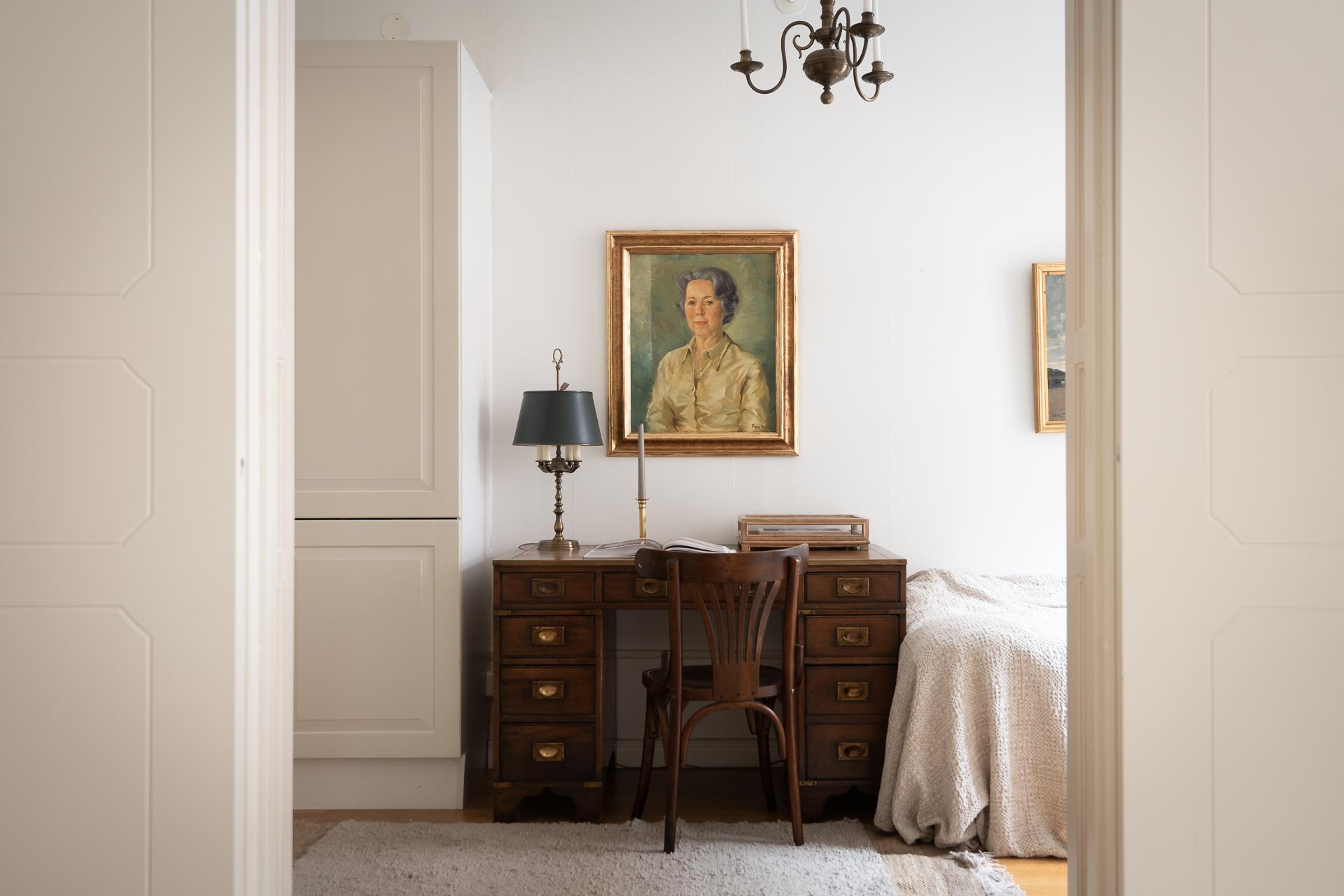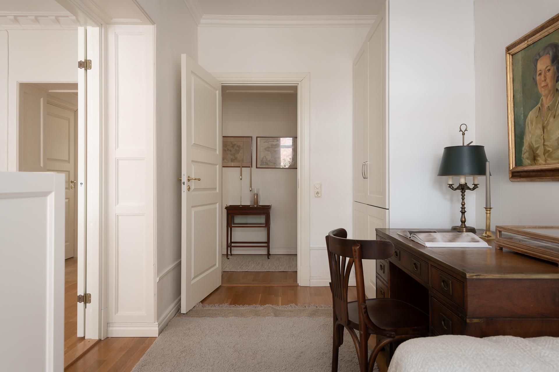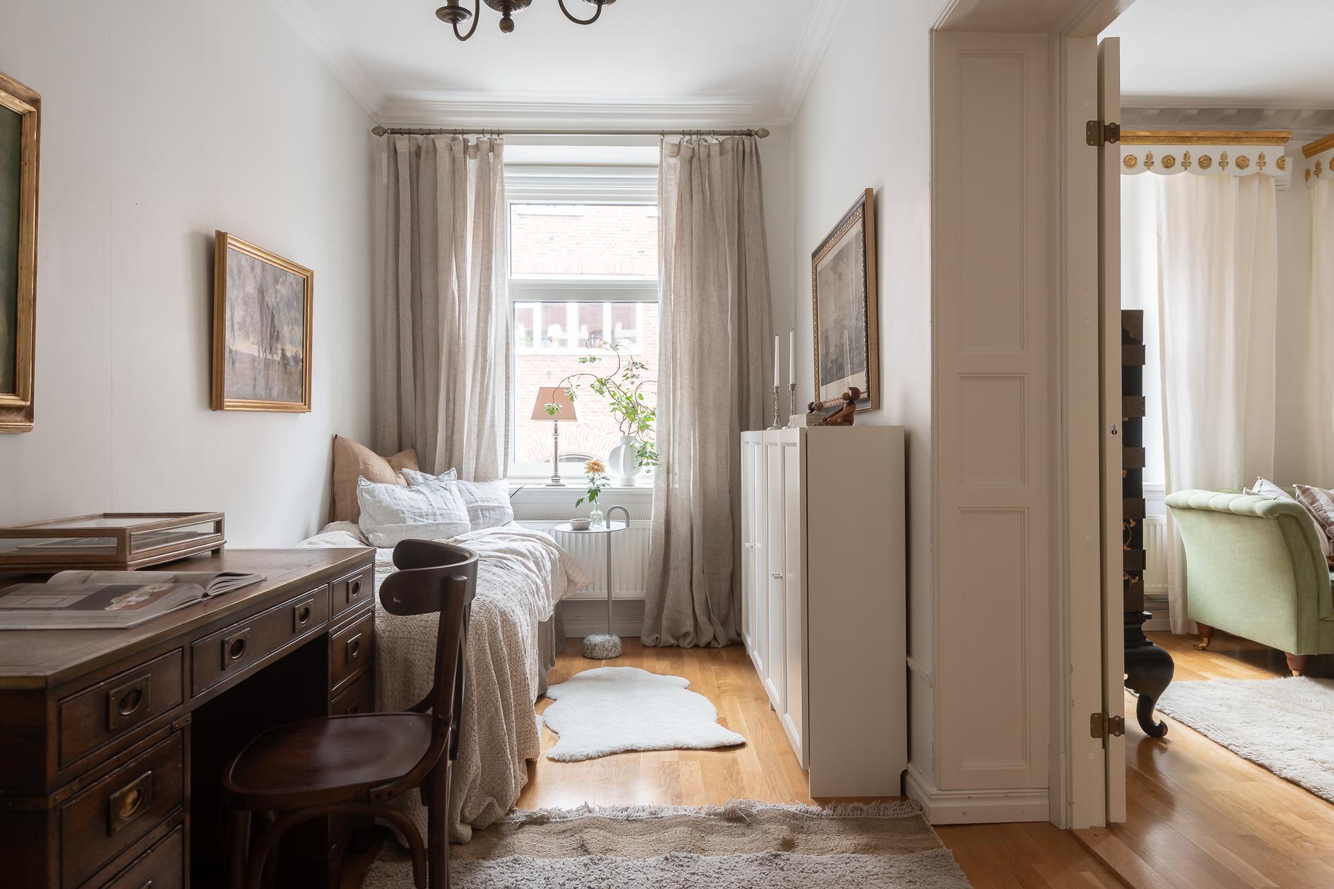 Med ingång både från vardagsrummet och hallen ligger ett av de två sovrummen. Perfekt för er som önskar barnrum, kontor eller gästrum eller en kombination av något av dessa. Rummets layout ger flera bra alternativ. Ni får plats med både skrivbord, säng och förvaring som idag finns med en bra garderob i ena hörnet. Samma fina förmiddagsljus fyller rummet.