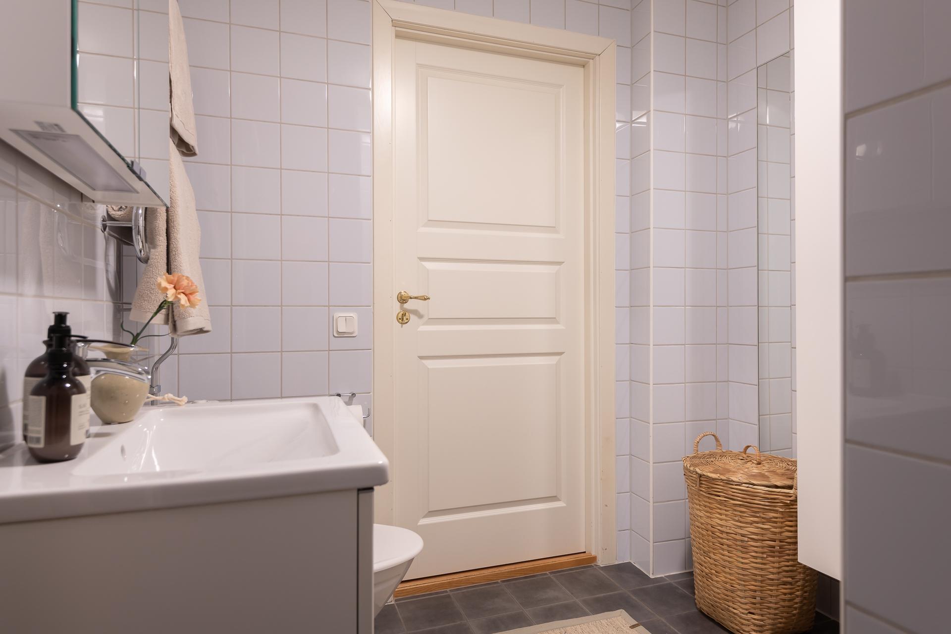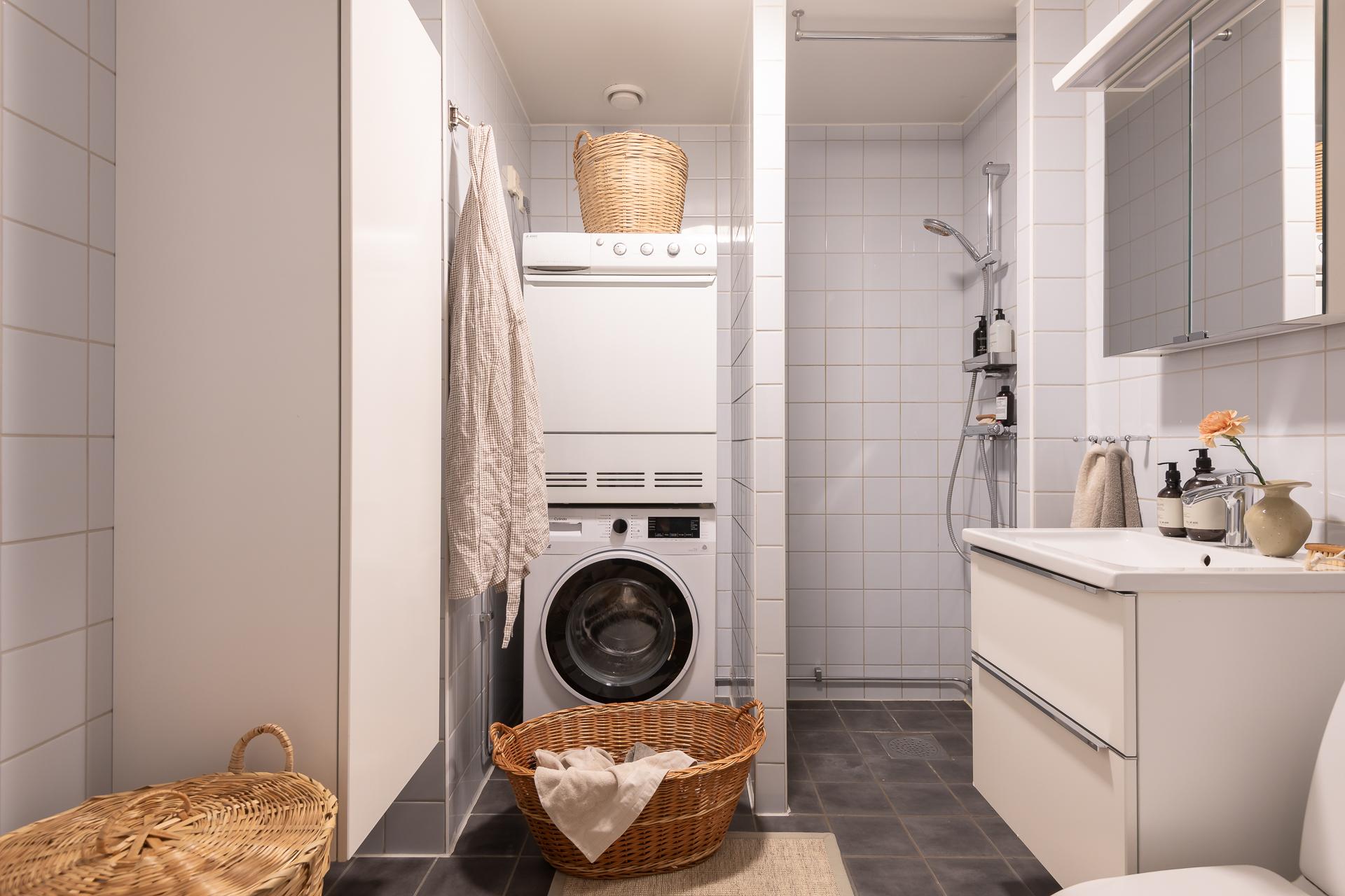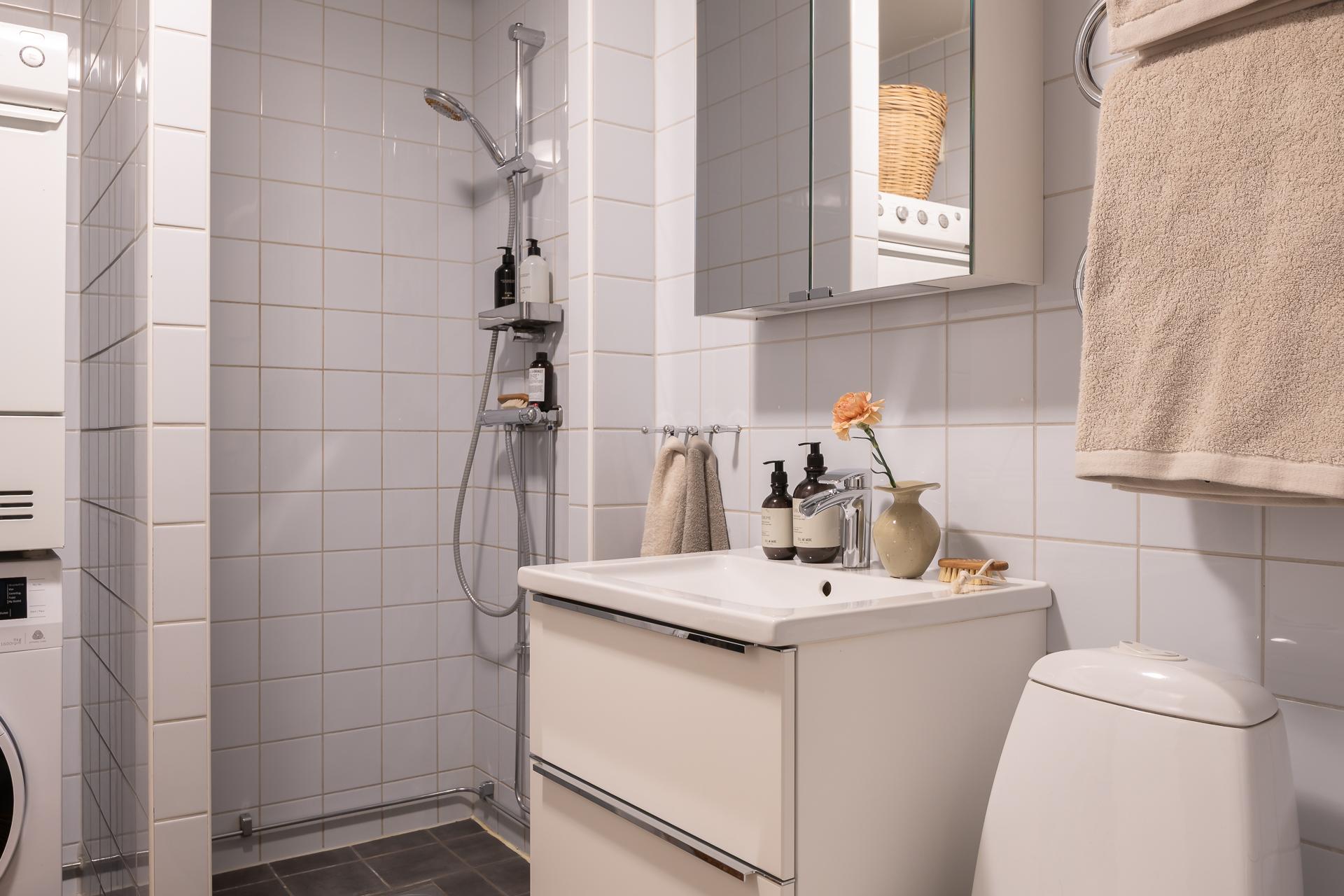 Stilsäkert och fint badrum i klassiska färg- och materialval. En tacksam tvättpelare med både tvättmaskin och torktumlare underlättar i vardagsbestyren. Nu när hösten är kommen är golvvärmen och handdukstorken sköna att ha. Bra förvaring med både kommod och spegelskåp ovan.