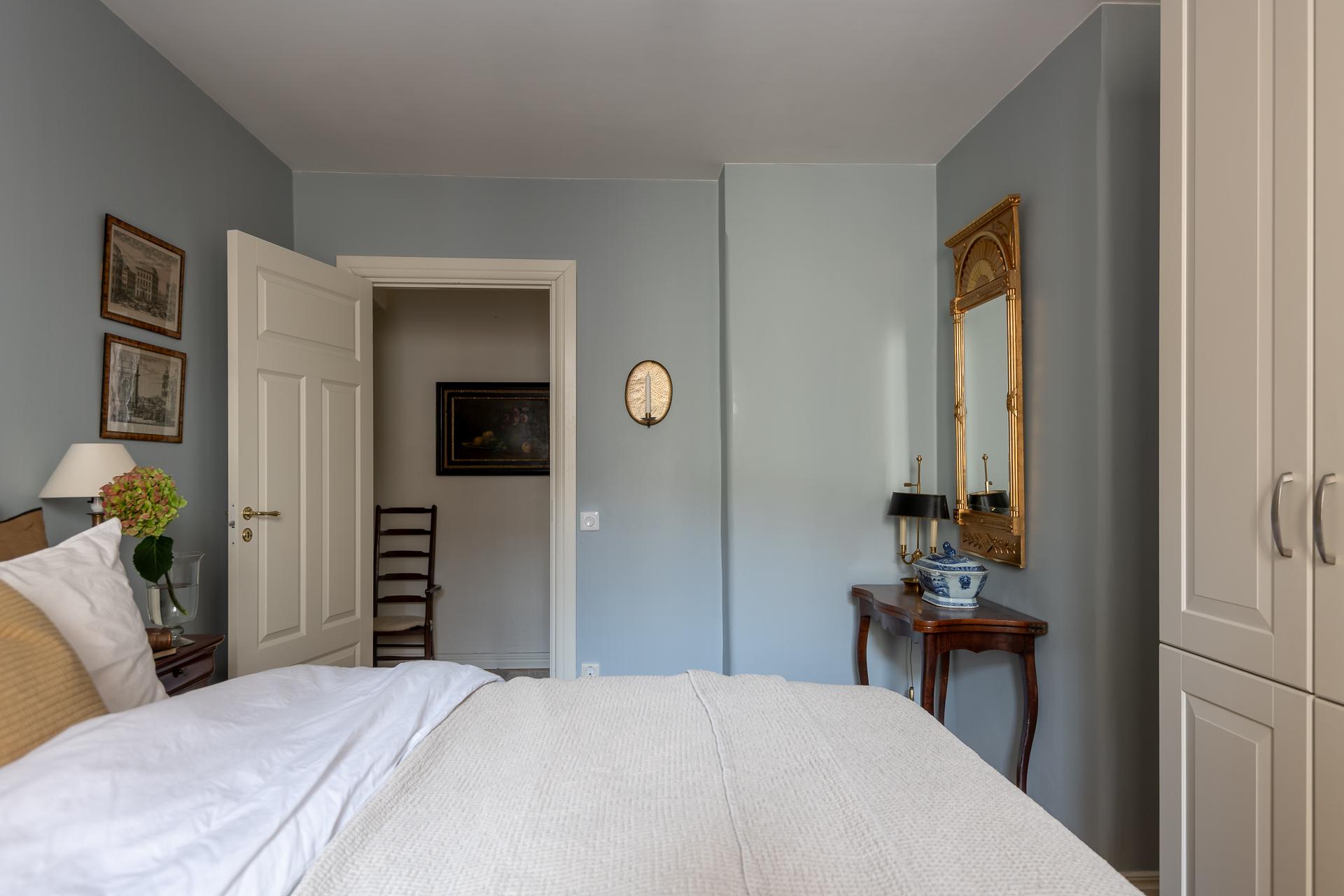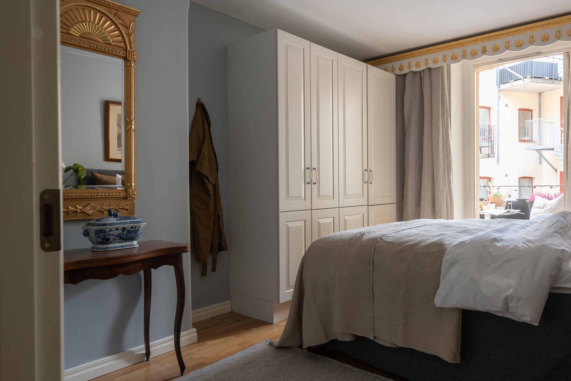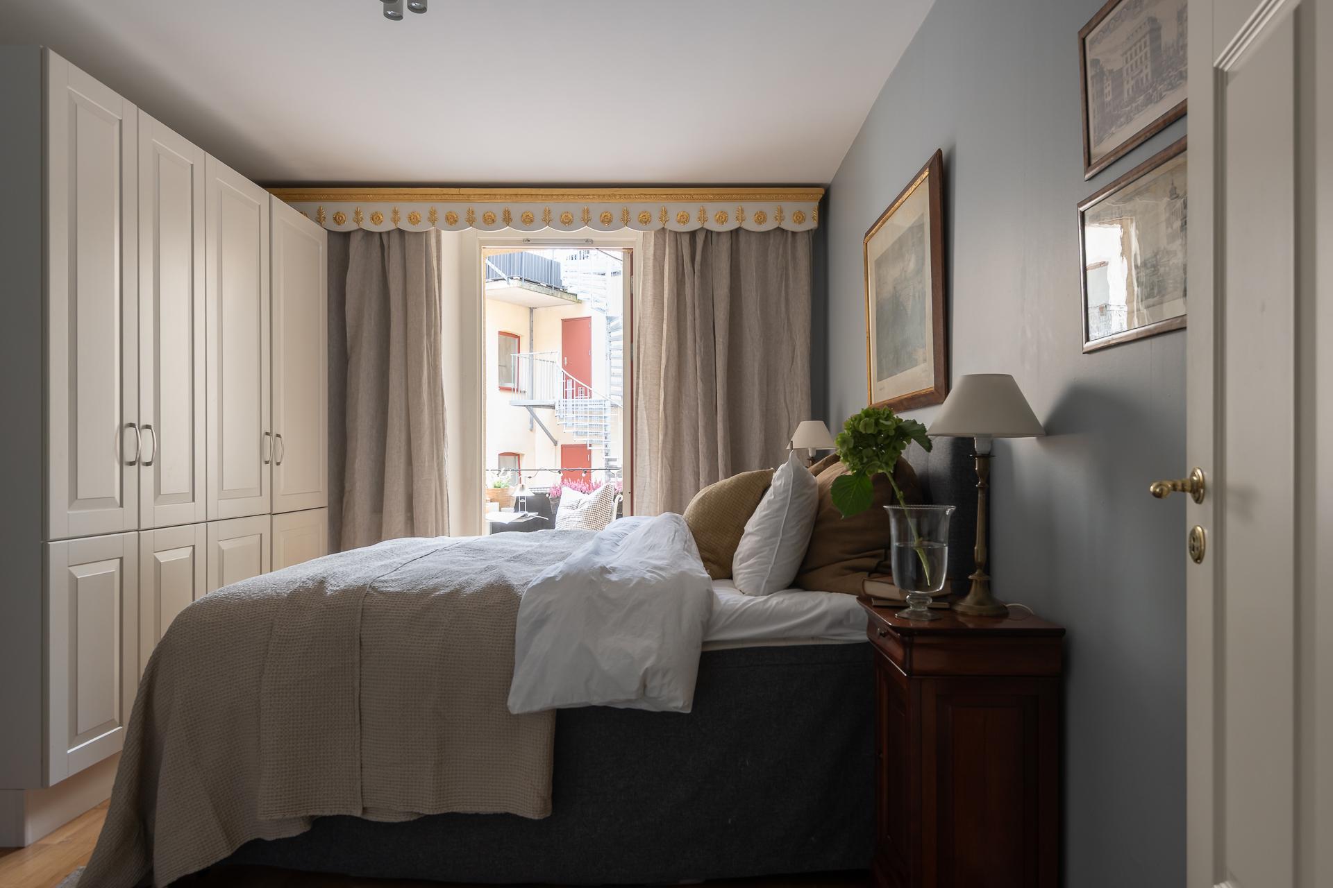Master bedroom ligger placerat mot den lugna och nyligen renoverade innergården. Det tysta läget borgar för en god natts sömn även med balkongdörrarna öppna. Här finns gott om garderober och plats finns för både dubbelsäng och nattduksbord. Härifrån når ni balkongen.