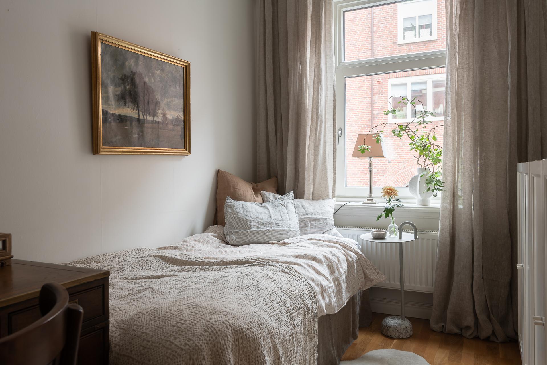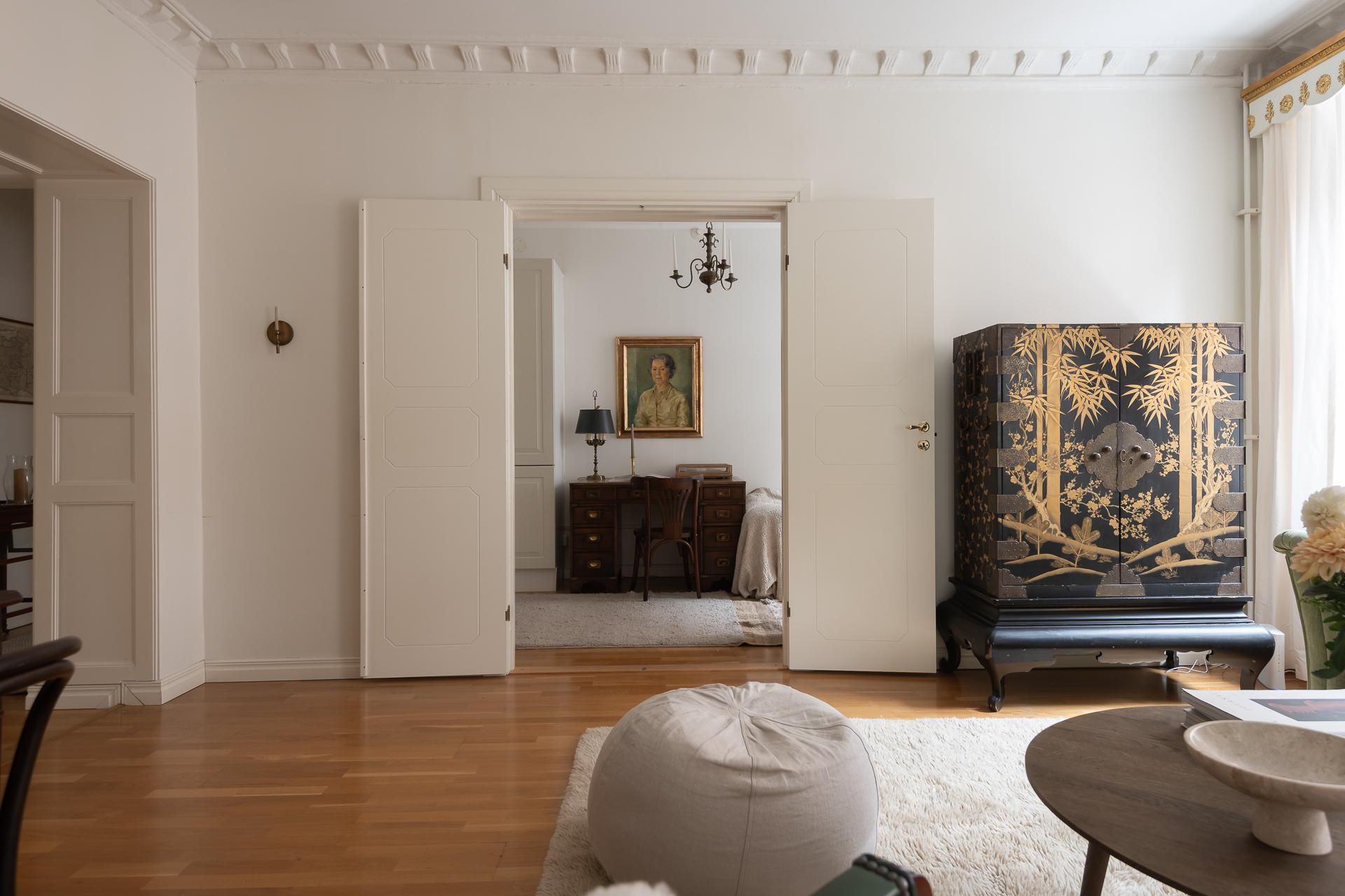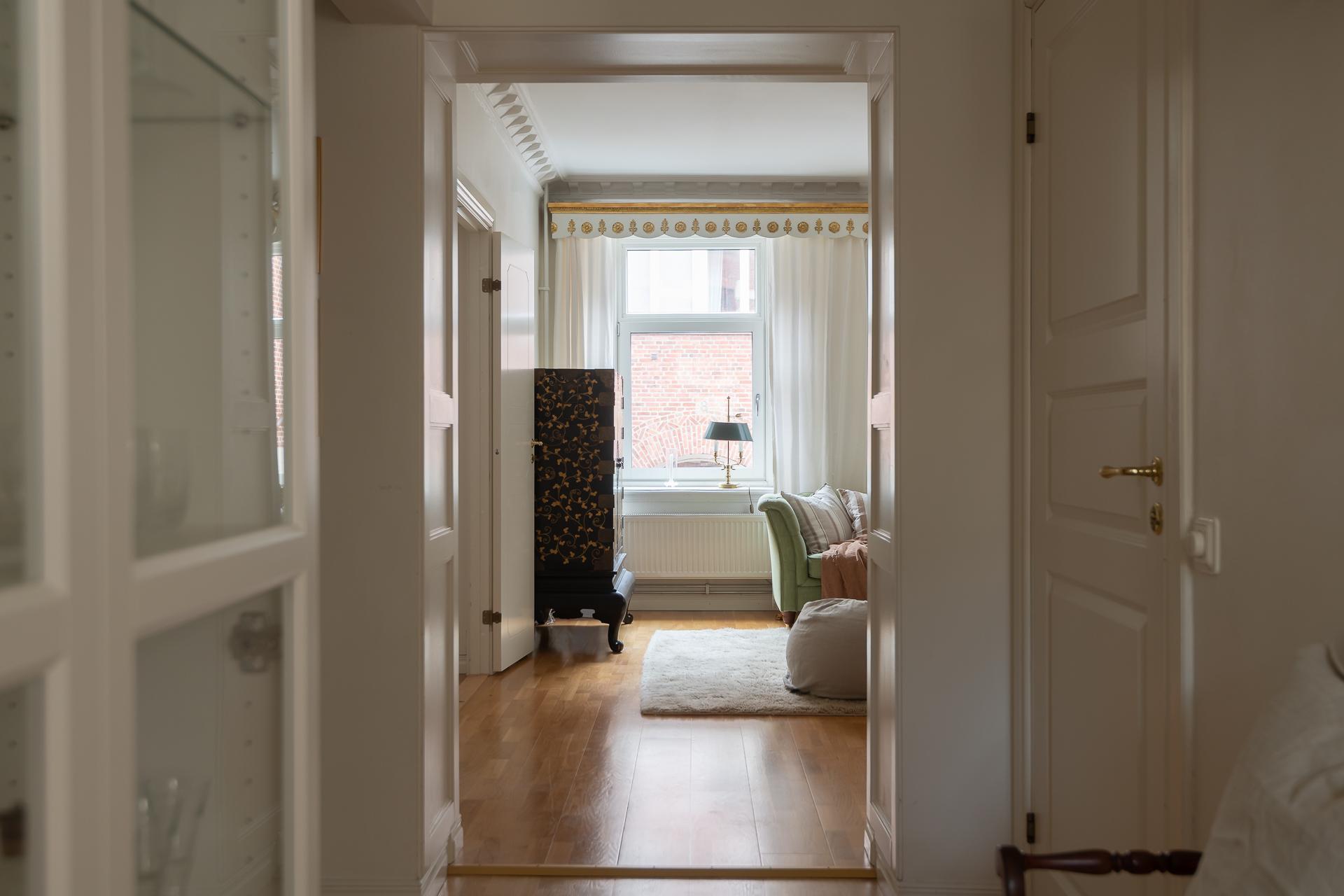 Master bedroom ligger placerat mot den lugna och nyligen renoverade innergården. Det tysta läget borgar för en god natts sömn även med balkongdörrarna öppna. Här finns gott om garderober och plats finns för både dubbelsäng och nattduksbord. Härifrån når ni balkongen.