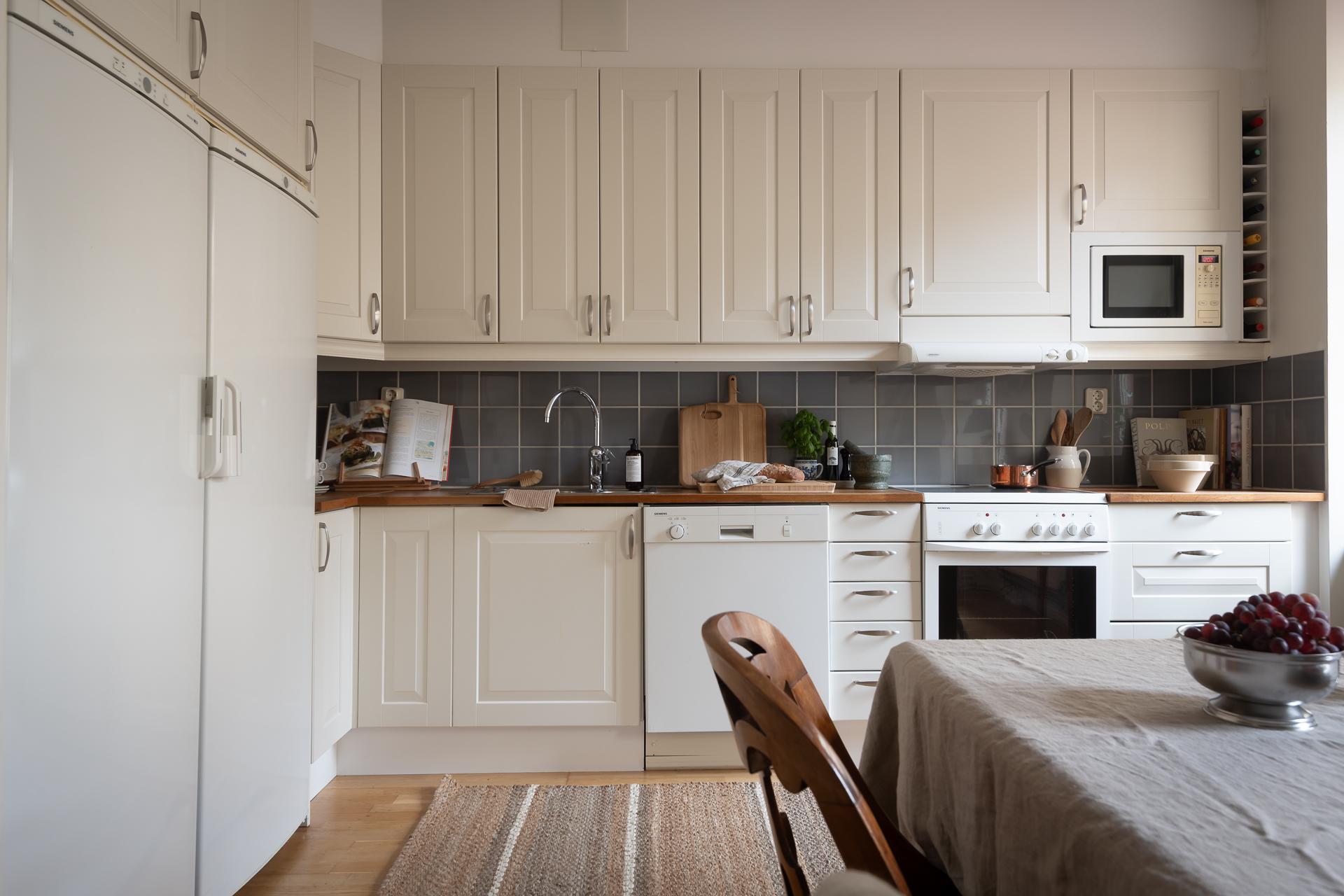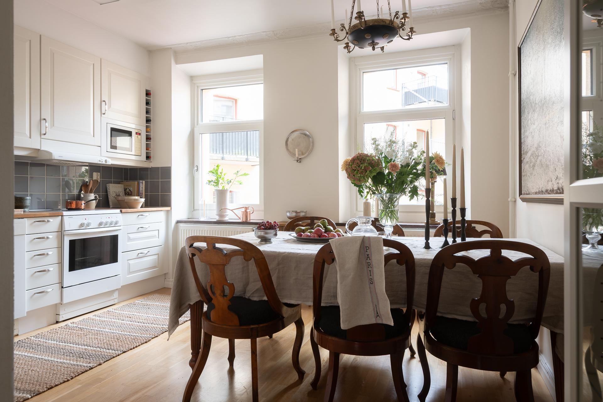 Välplanerat och bra kök mot innergården. Två stora fönster i västerläge ger fint ljus under eftermiddagen. Ett stort matbord får plats vilket gör att många gäster ryms. Här finns gott om skåp och utmärkta arbetsytor. Stor separat kyl och frys är uppskattat och omtyckt om nuvarande ägarna.