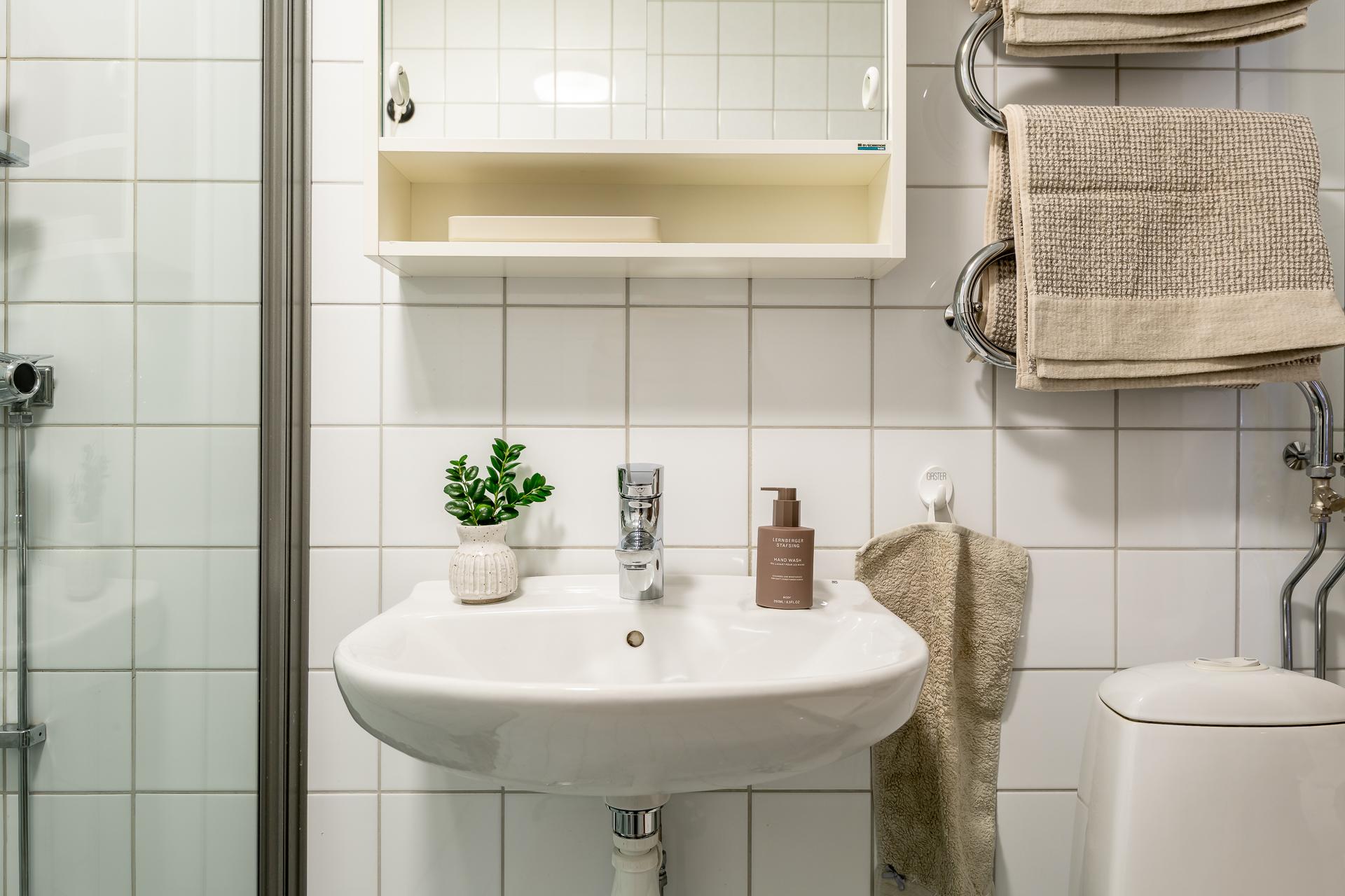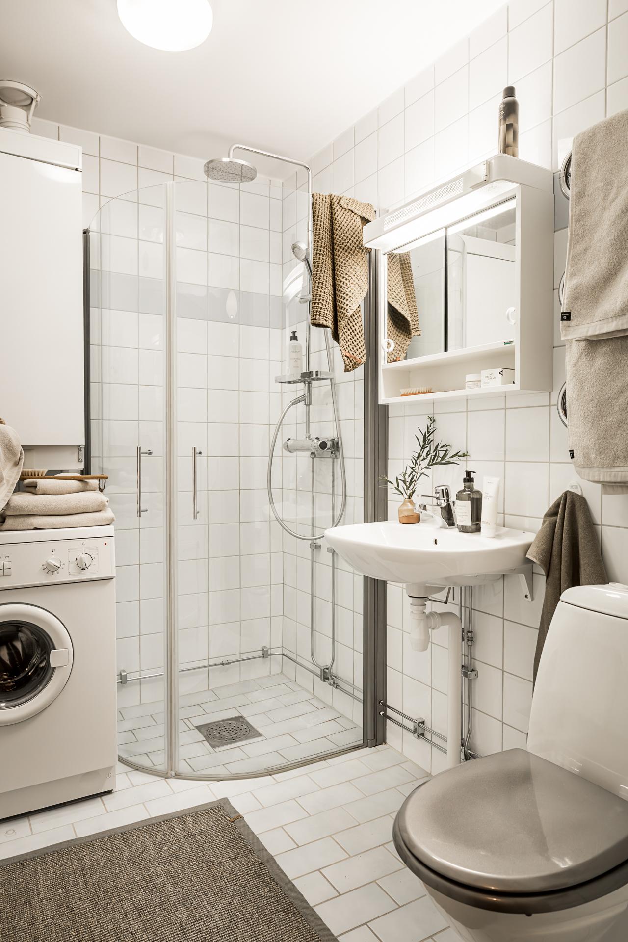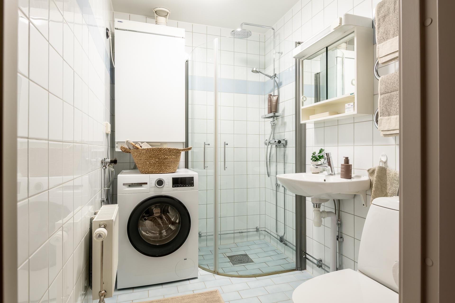 Direkt till höger ligger det helkaklade badrummet. Fullt utrustad med både tvättmaskin och torkskåp som förenklar i vardagen. De vikbara glasväggarna skiljer effektivt av duschhörnan som har både takdusch och handduschmunstycke. Praktiskt spegelskåp som sväljer bra förvaring.