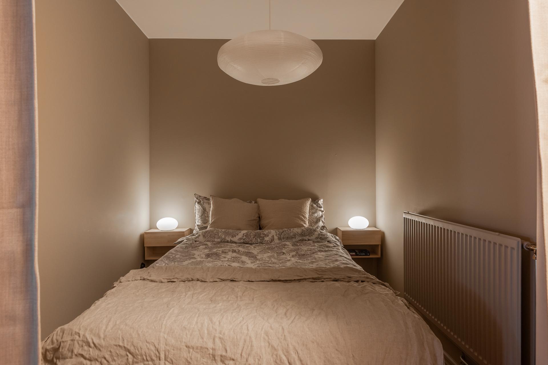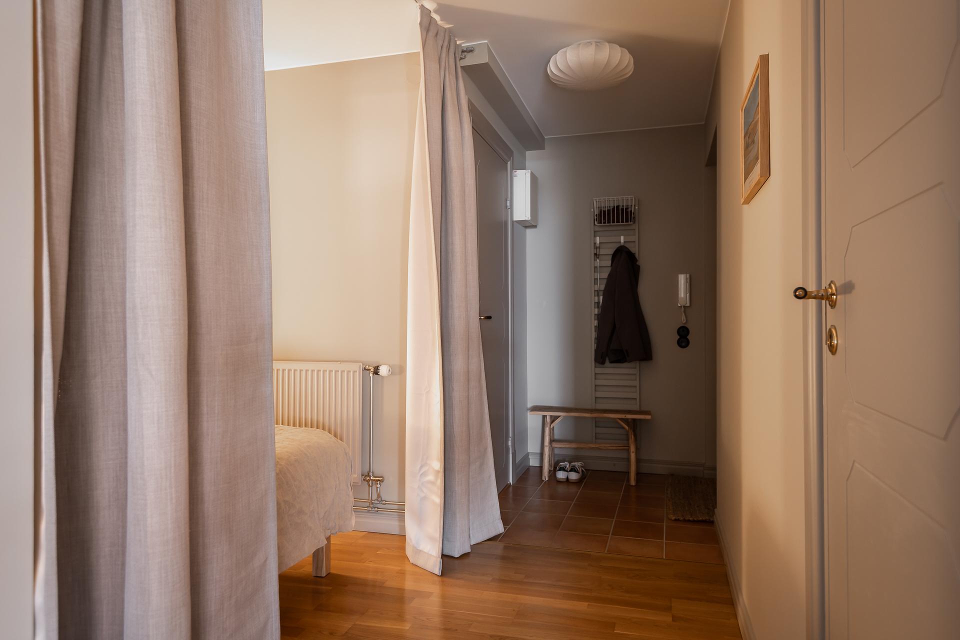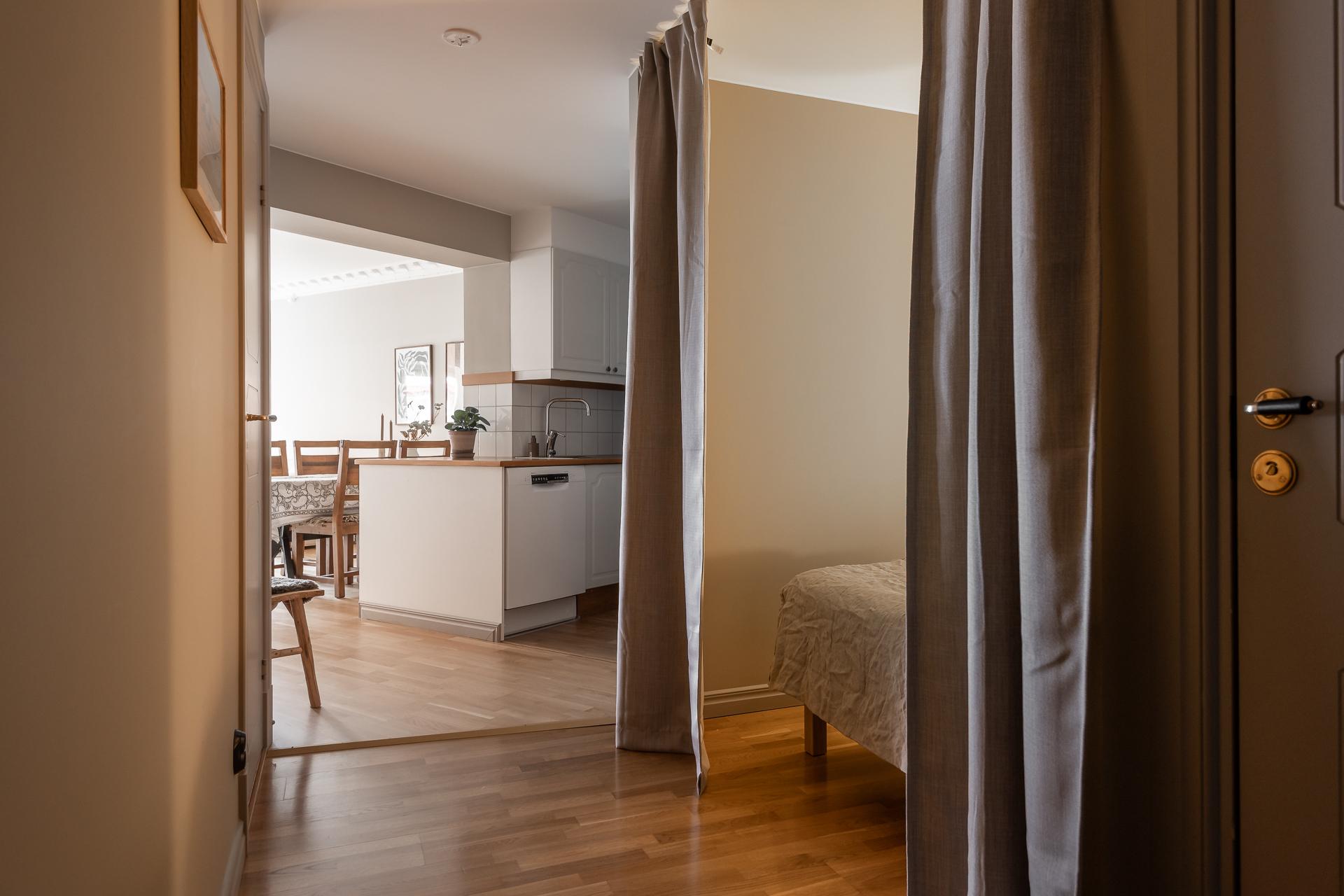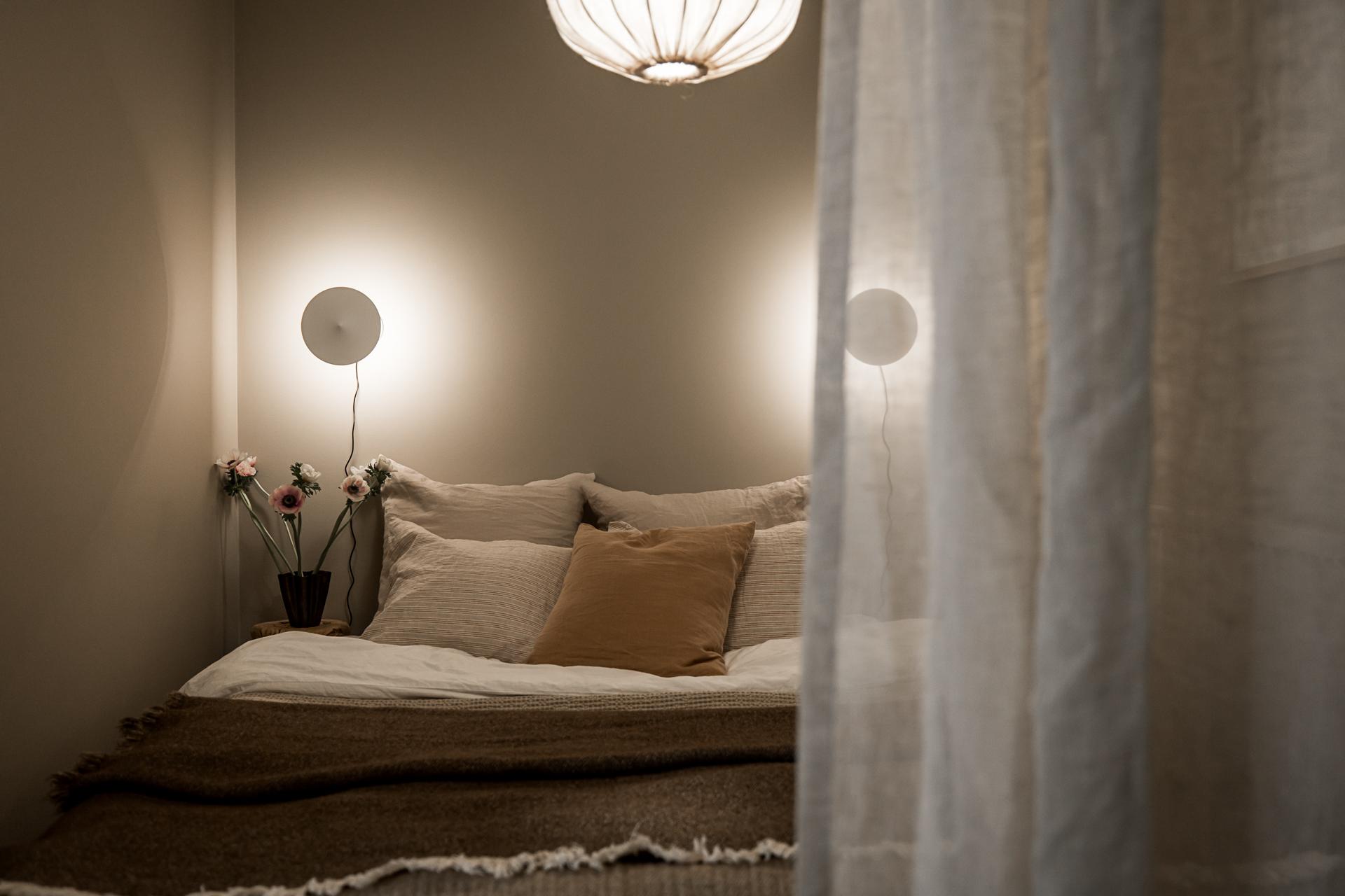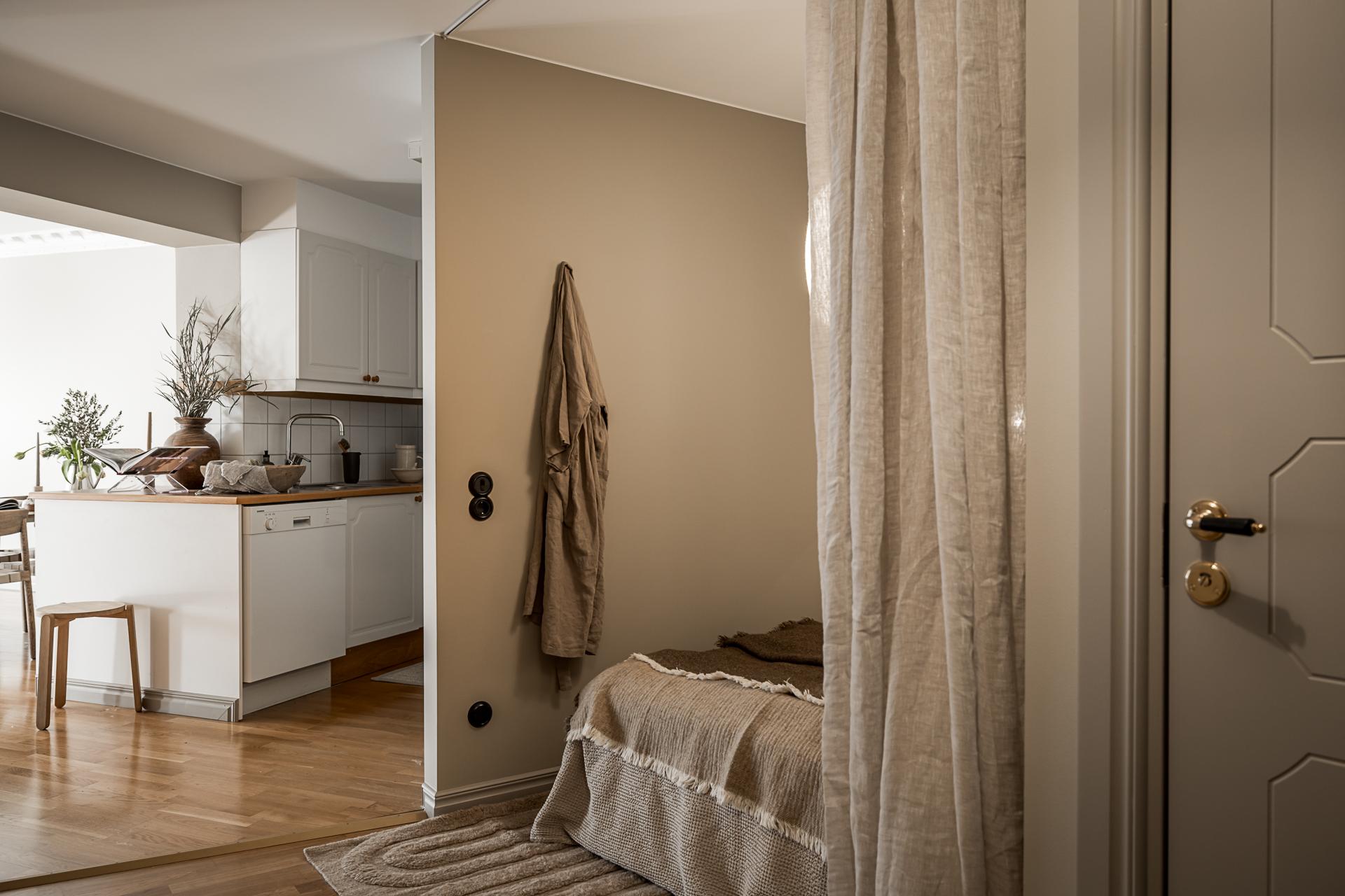 Vidare genom hallen når ni sovalkoven som med enkelhet rymmer en dubbelsäng och nattduksbord. Perfekt avskilt från de sociala ytorna i lägenheten utlovas en god natts sömn. Väggarna är målade i Raw Canvas från Jotun.