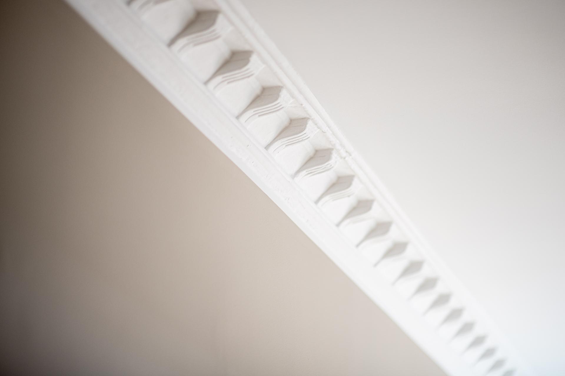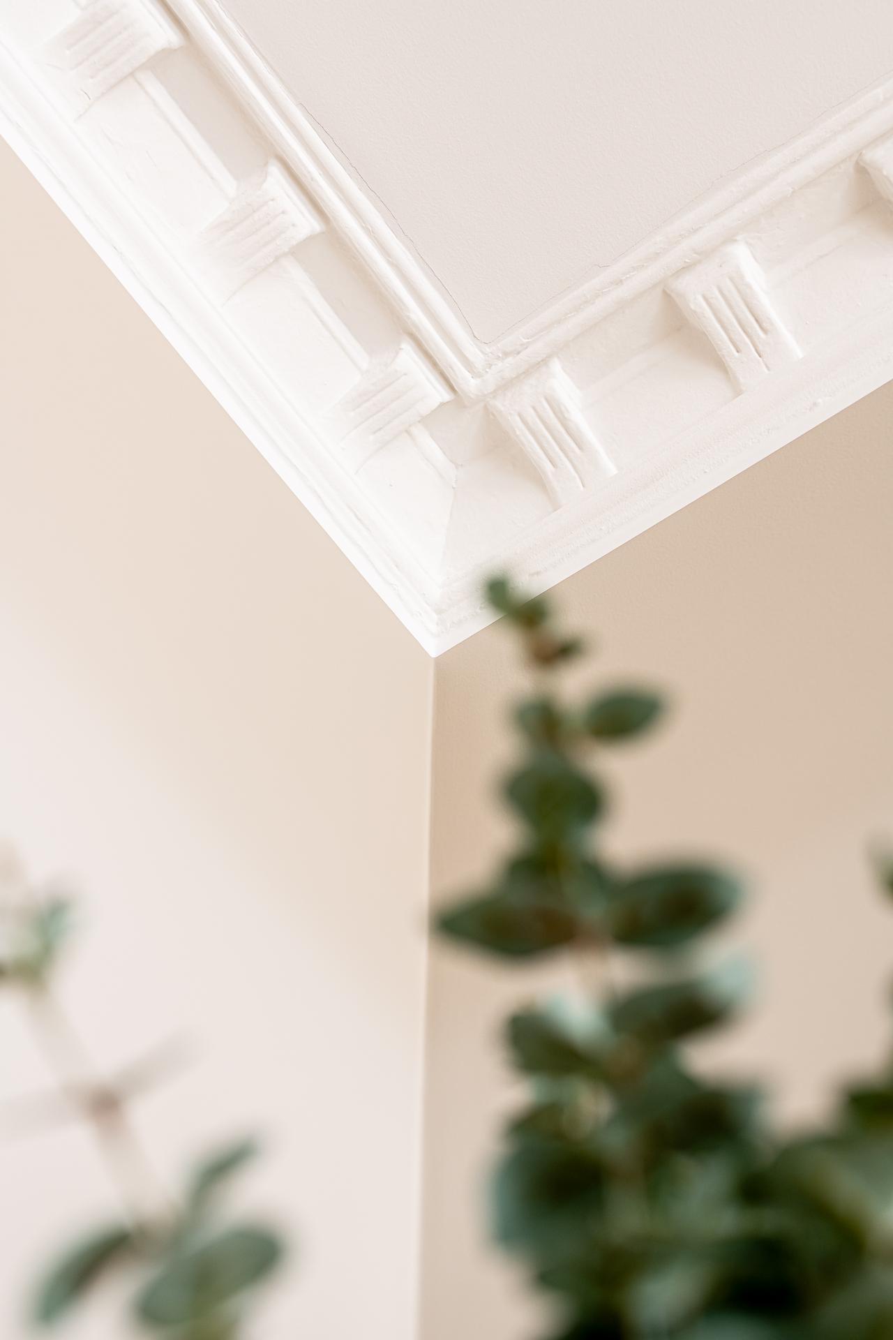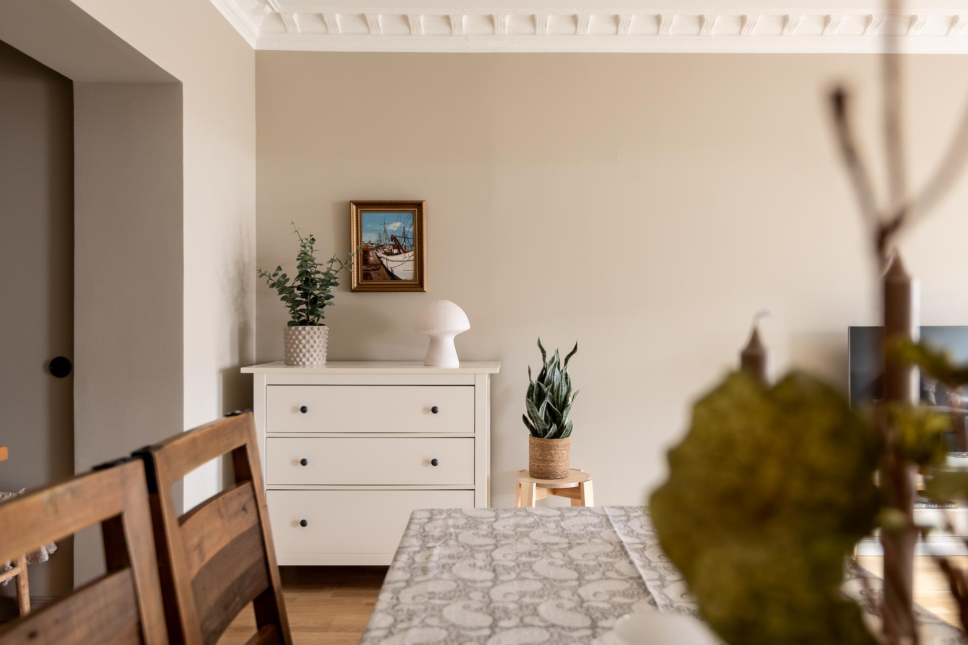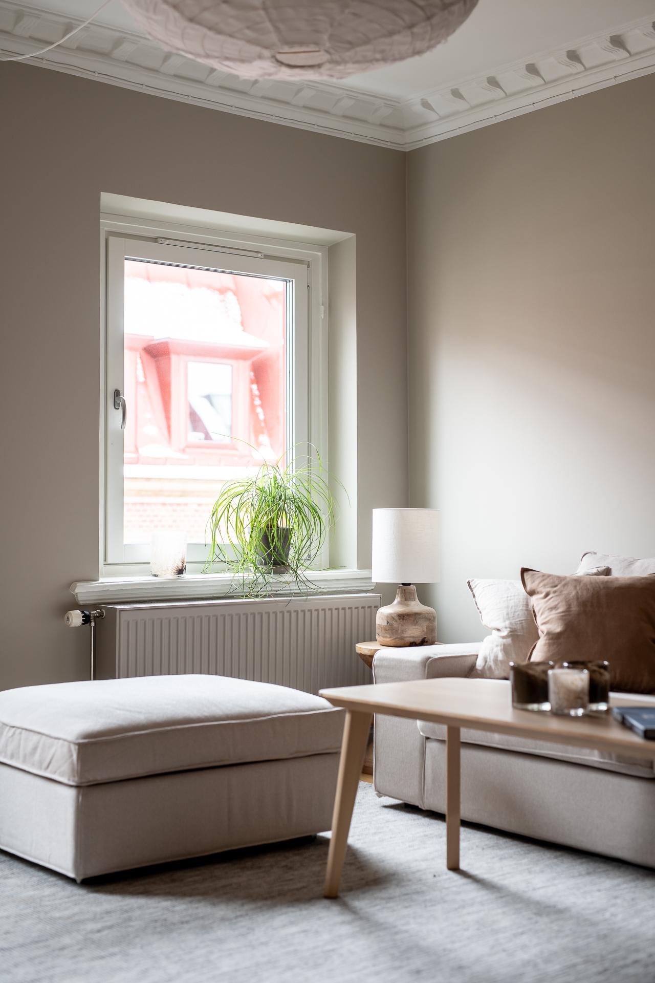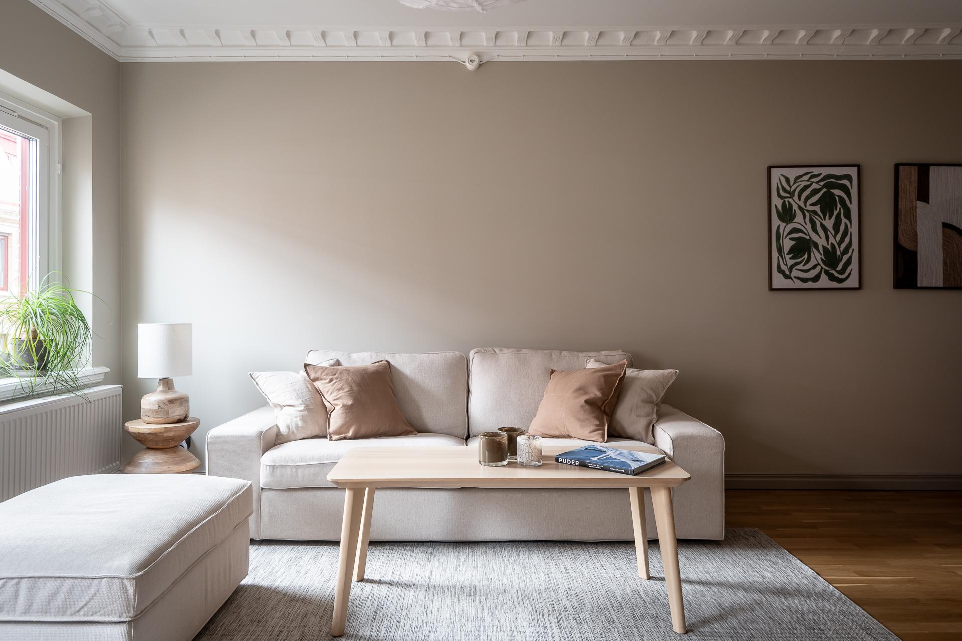 Vidare genom hallen når ni sovalkoven som med enkelhet rymmer en dubbelsäng och nattduksbord. Perfekt avskilt från de sociala ytorna i lägenheten utlovas en god natts sömn. Väggarna är målade i Raw Canvas från Jotun.