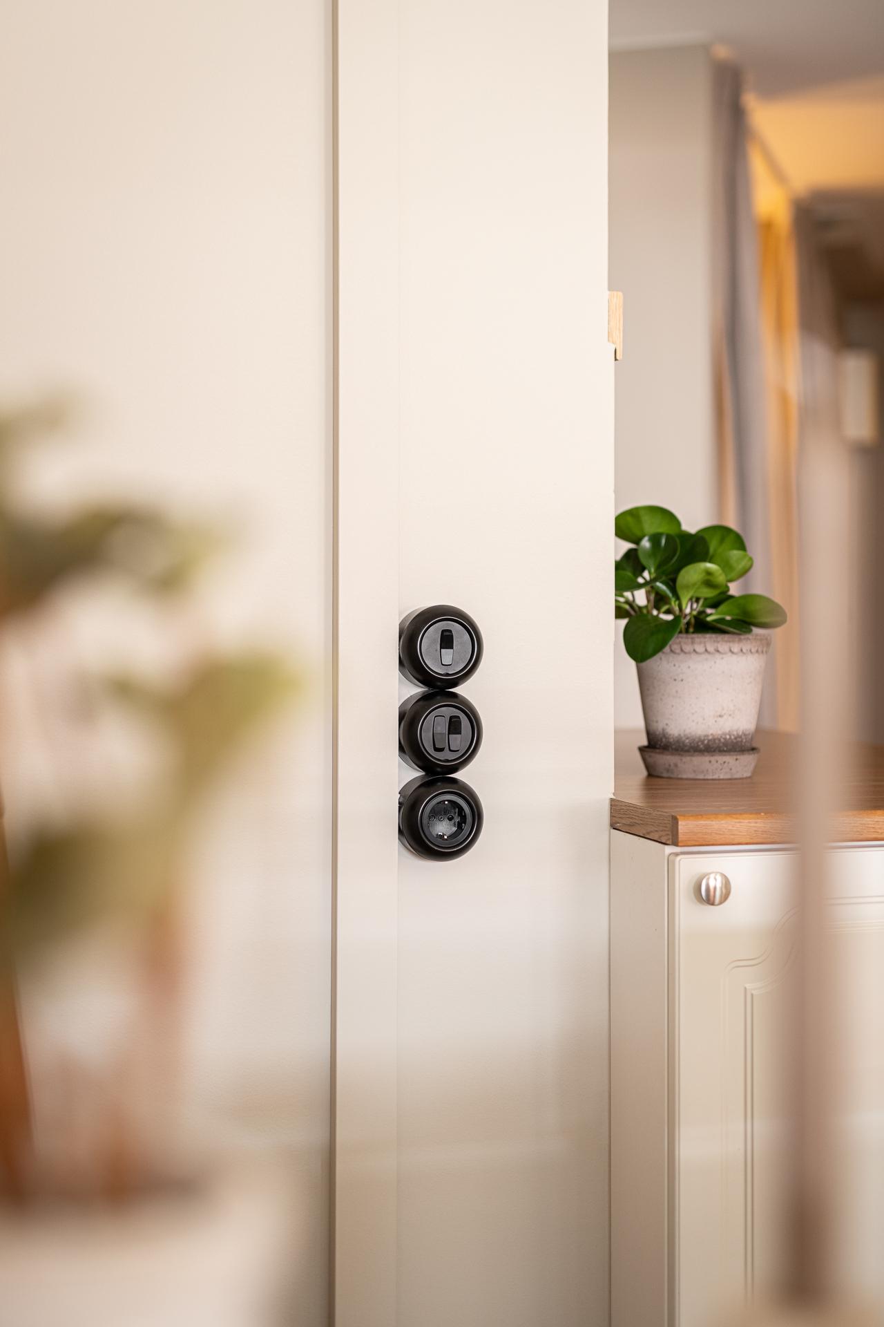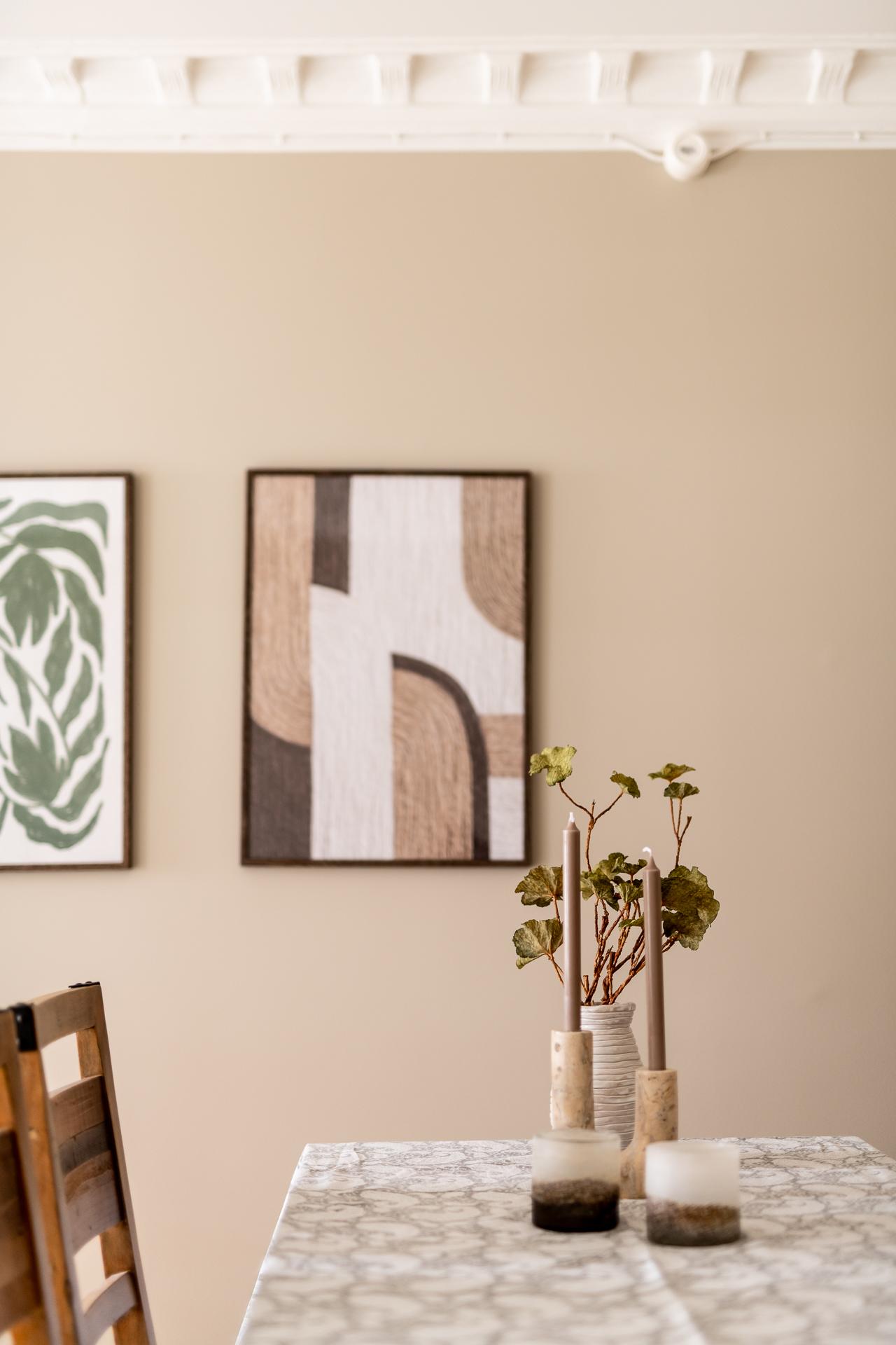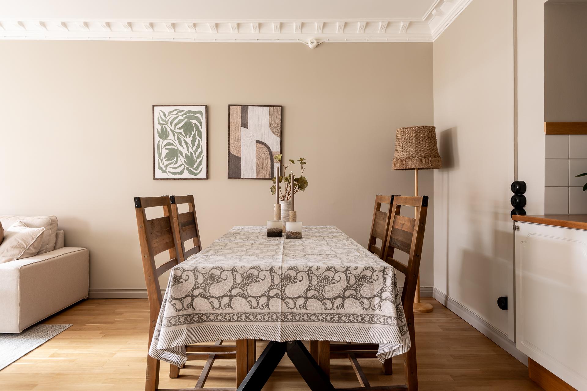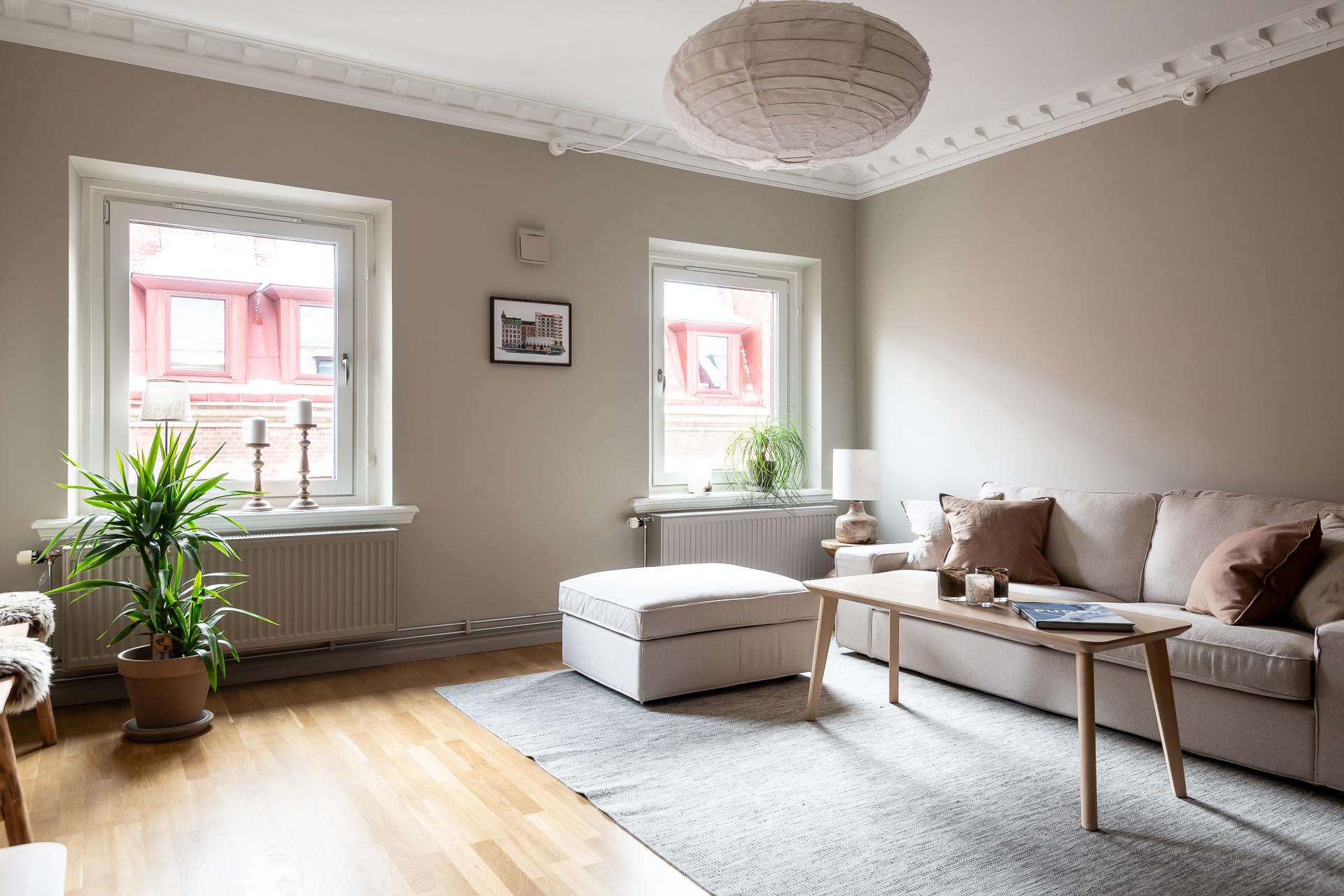 Genom en gedigen träport leds ni in till föreningens fastighet och direkt till vänster ligger 5A. Härifrån kan ni ta hissen upp till fjärde våningen innan ni stiger in i detta varma och ombonade hem. Vidare väntar bra förvaring och spännande vinklar. Direkt till höger finns en naturlig förvaring för jackor och skor. Hall, vardagsrum och kök är målade i Soothing beige från Jotun.