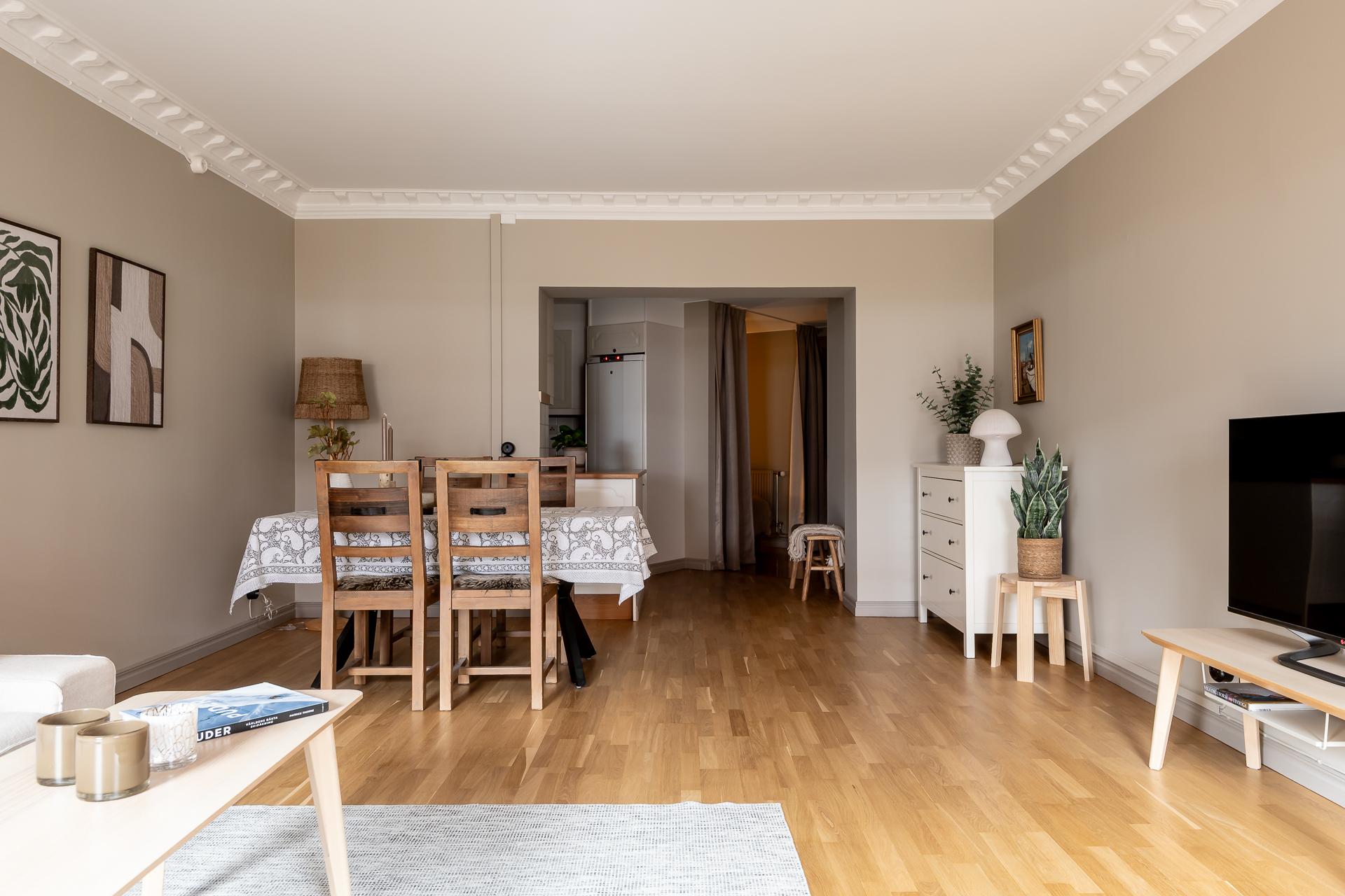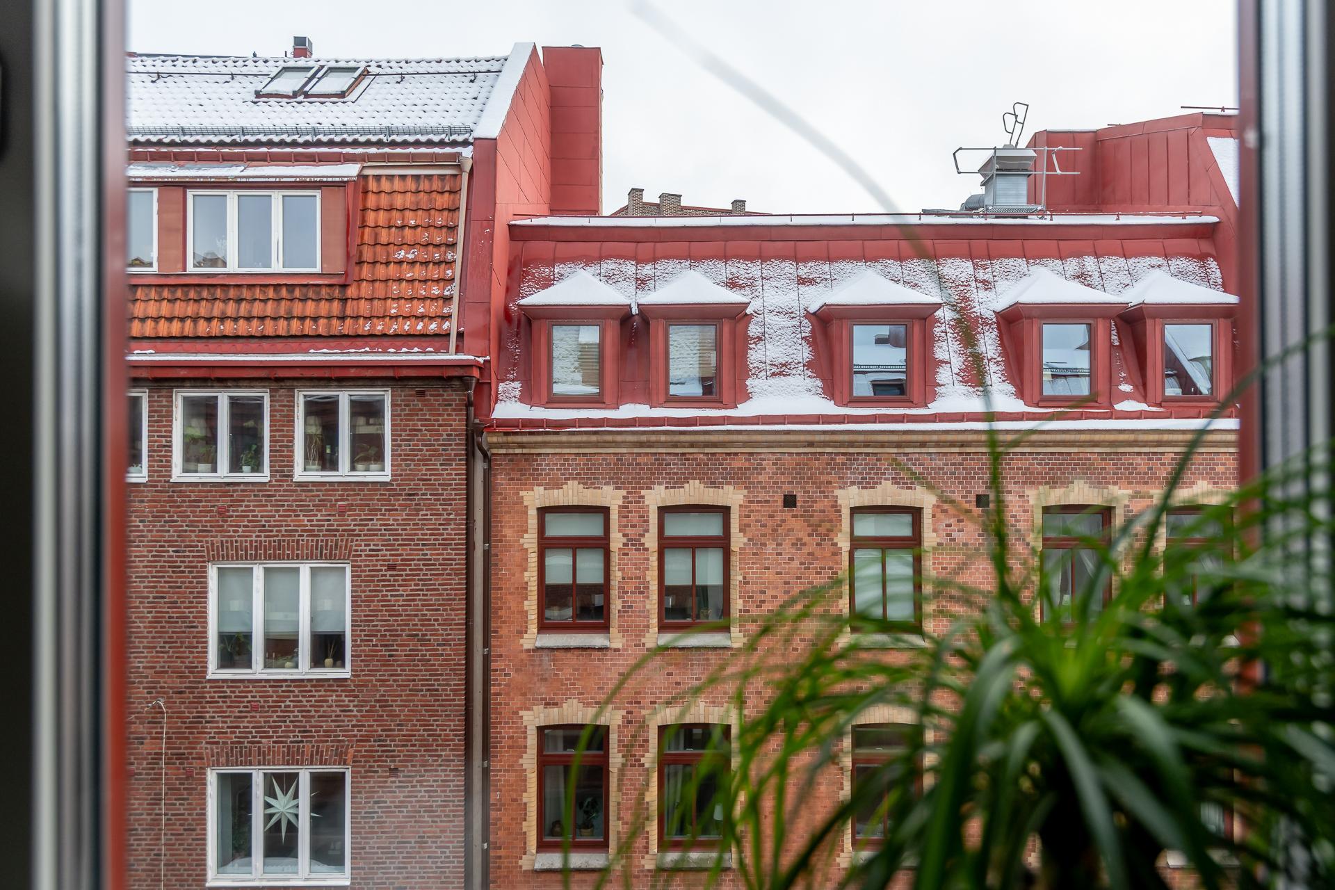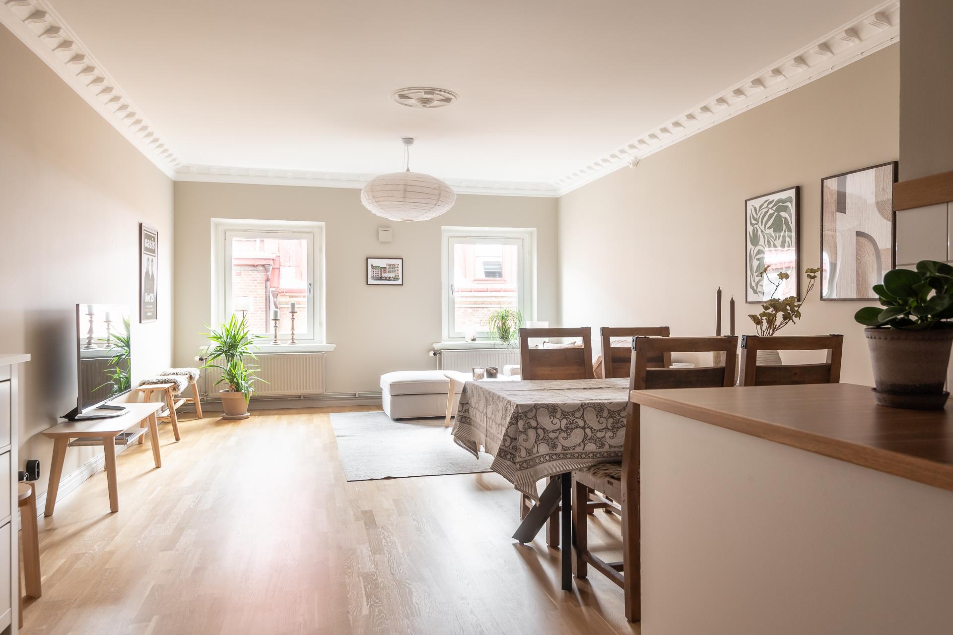 Väl tilltaget vardagsrum som mäter närmare 30 kvadrat vilket gör att ni rymmer både soffgrupp, matsalsbord och tv-hörna liksom skrivbord och extra förvaring för den som önskar. Här är det enkelt att ha både vänner och familj över, här får alla plats. Två fönster mot Ingenjörsgatan släpper in fint med ljus och man har god hjälp av det höga läget i huset. Från gatan är det lugnt och tyst och det är svårt att tro att man befinner sig mitt i centrala Göteborg.