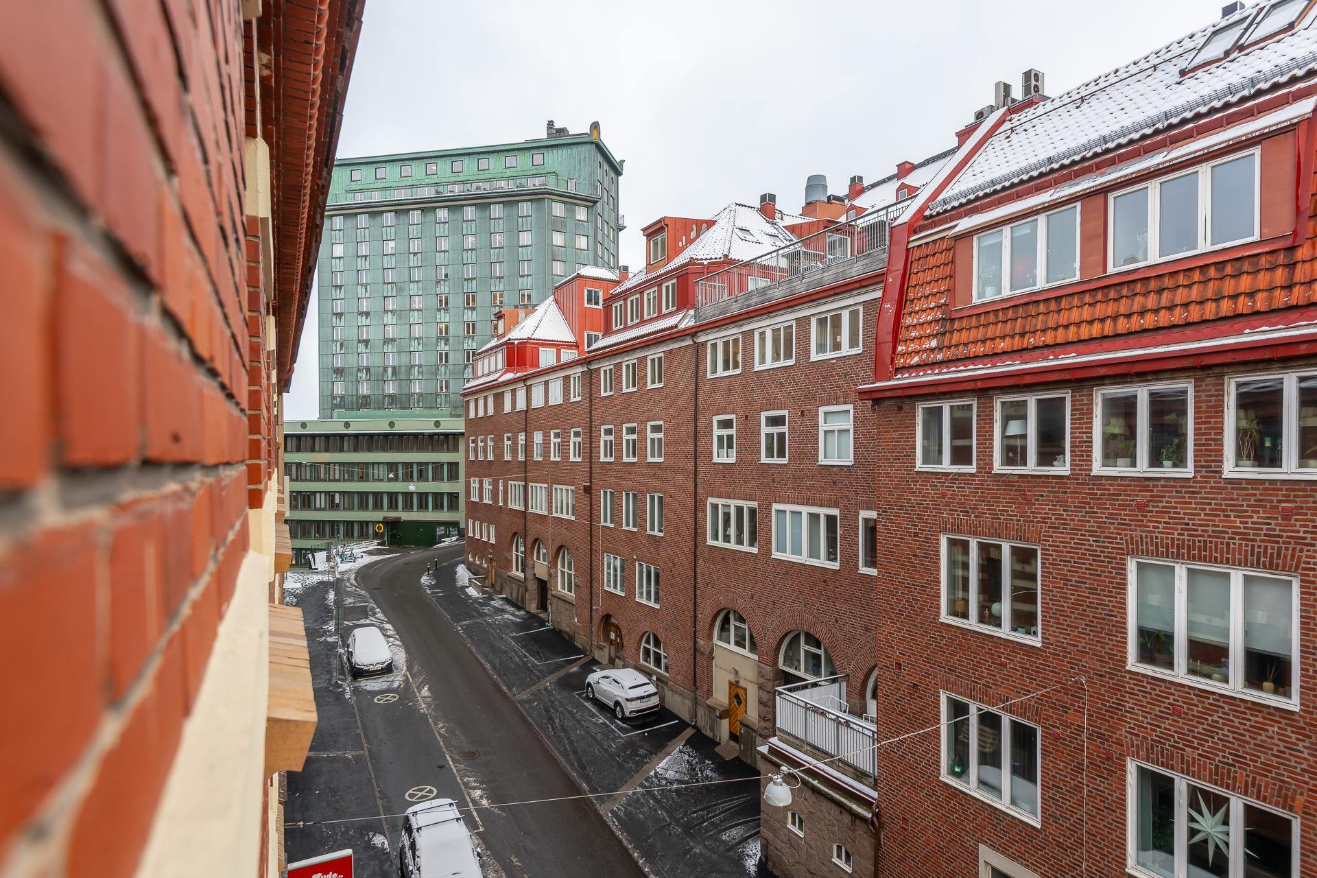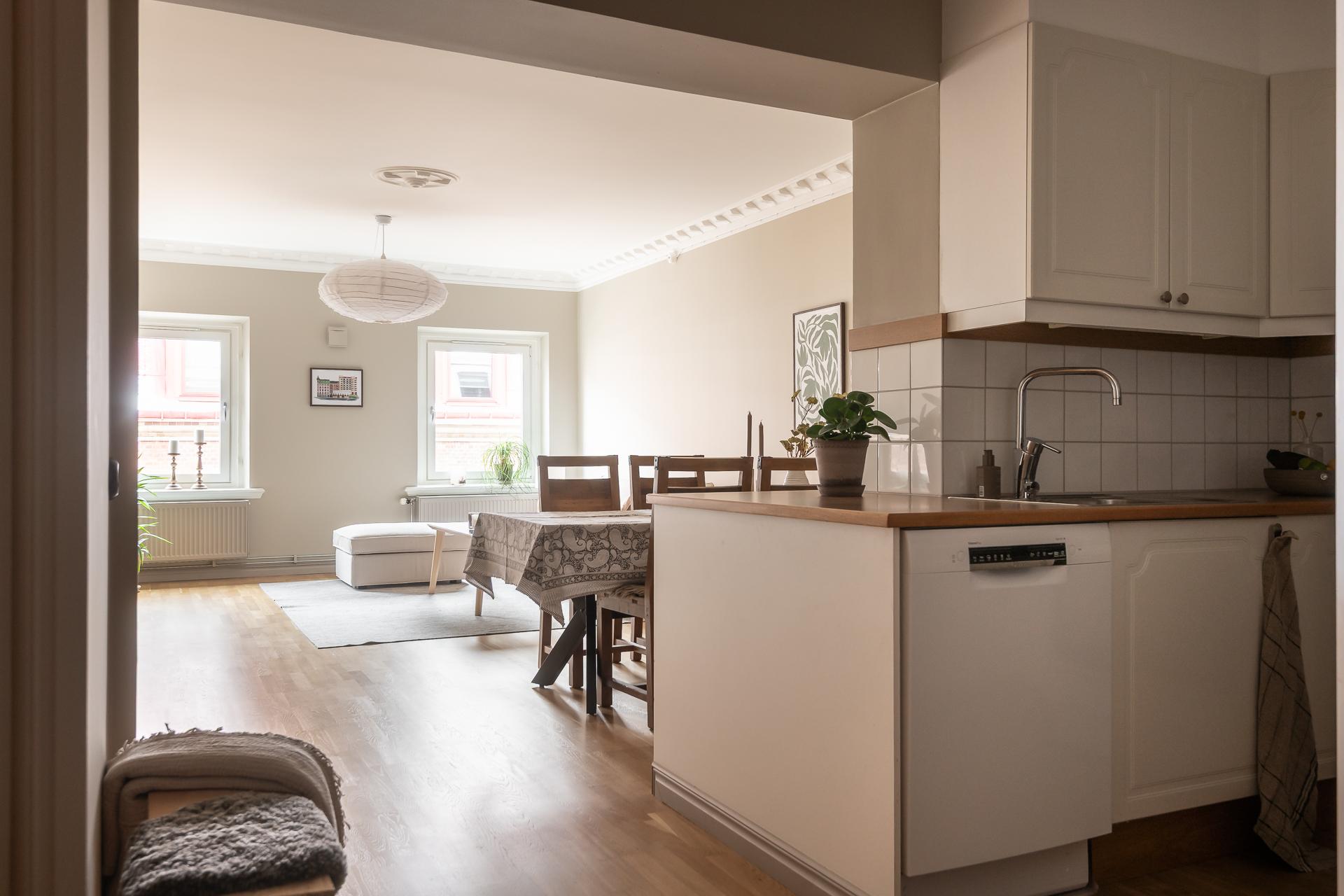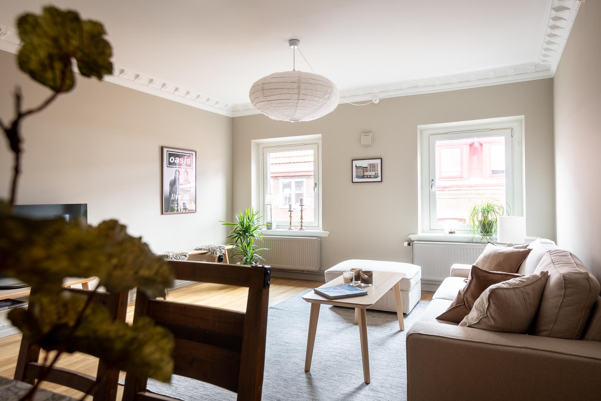 Väl tilltaget vardagsrum som mäter närmare 30 kvadrat vilket gör att ni rymmer både soffgrupp, matsalsbord och tv-hörna liksom skrivbord och extra förvaring för den som önskar. Här är det enkelt att ha både vänner och familj över, här får alla plats. Två fönster mot Ingenjörsgatan släpper in fint med ljus och man har god hjälp av det höga läget i huset. Från gatan är det lugnt och tyst och det är svårt att tro att man befinner sig mitt i centrala Göteborg.