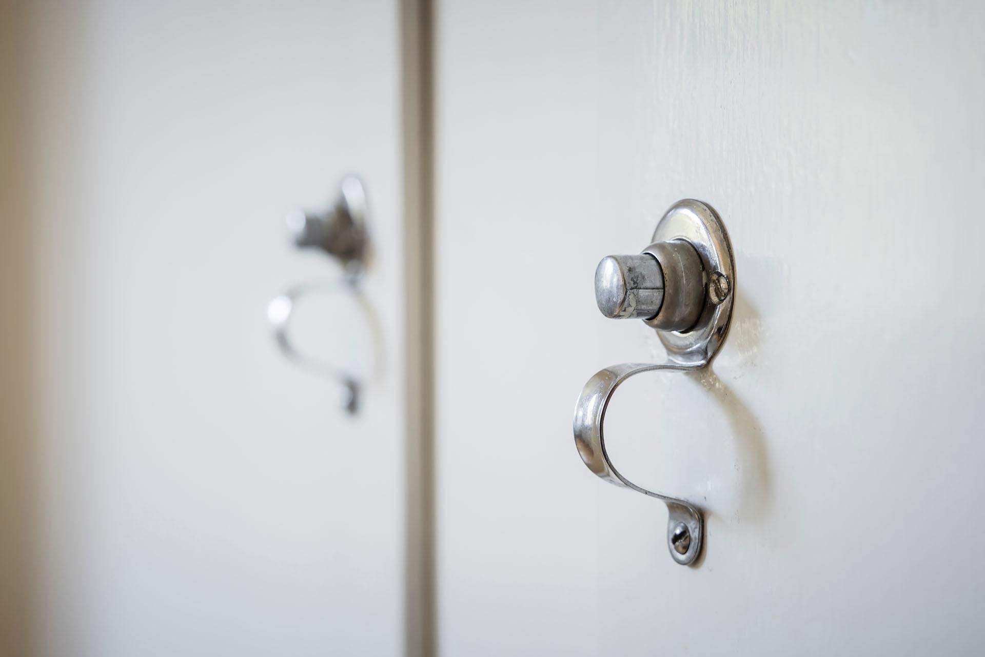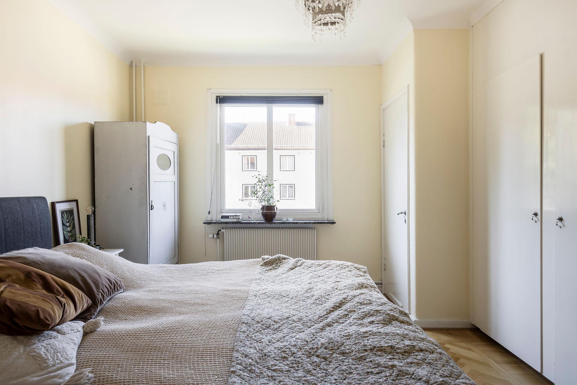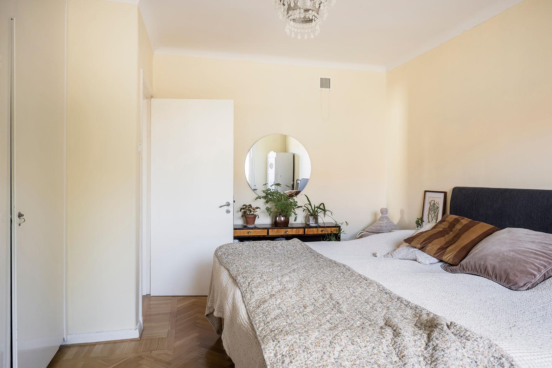 I anslutning till den inre hallen ligger lägenhetens största sovrum. Här ryms en dubbelsäng med nattduksbord lätt och ledigt, och det finns även plats för ett litet skrivbord eller för att komplettera de fyra inbyggda garderoberna med en rejäl byrå. Golvet är belagt med fiskbensparkett och rummets väggar målade i en behaglig ljusgul kulör. Garderoberna har vitmålade dörrar, och de bevarade trycklåsen är verkligen rariteter.