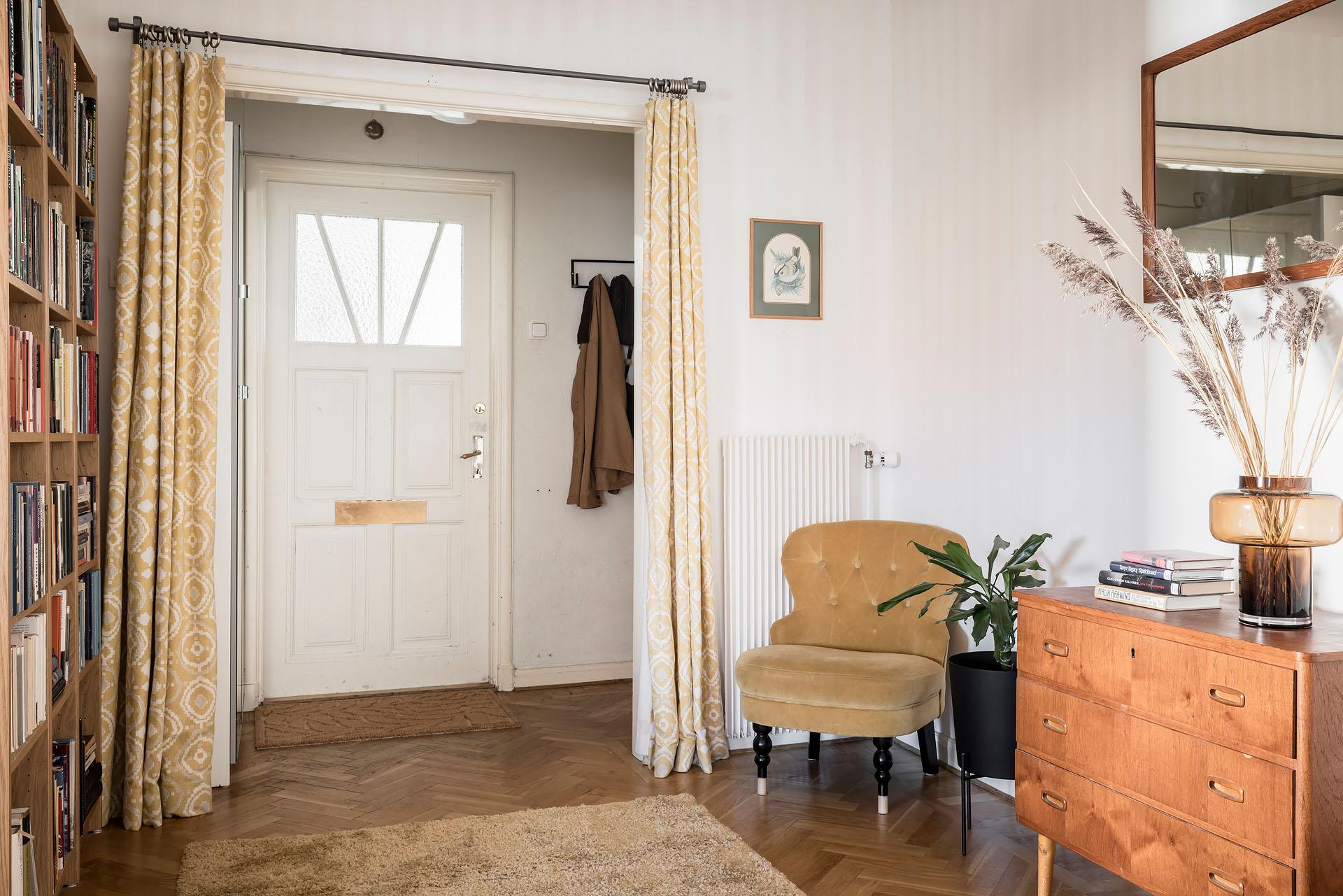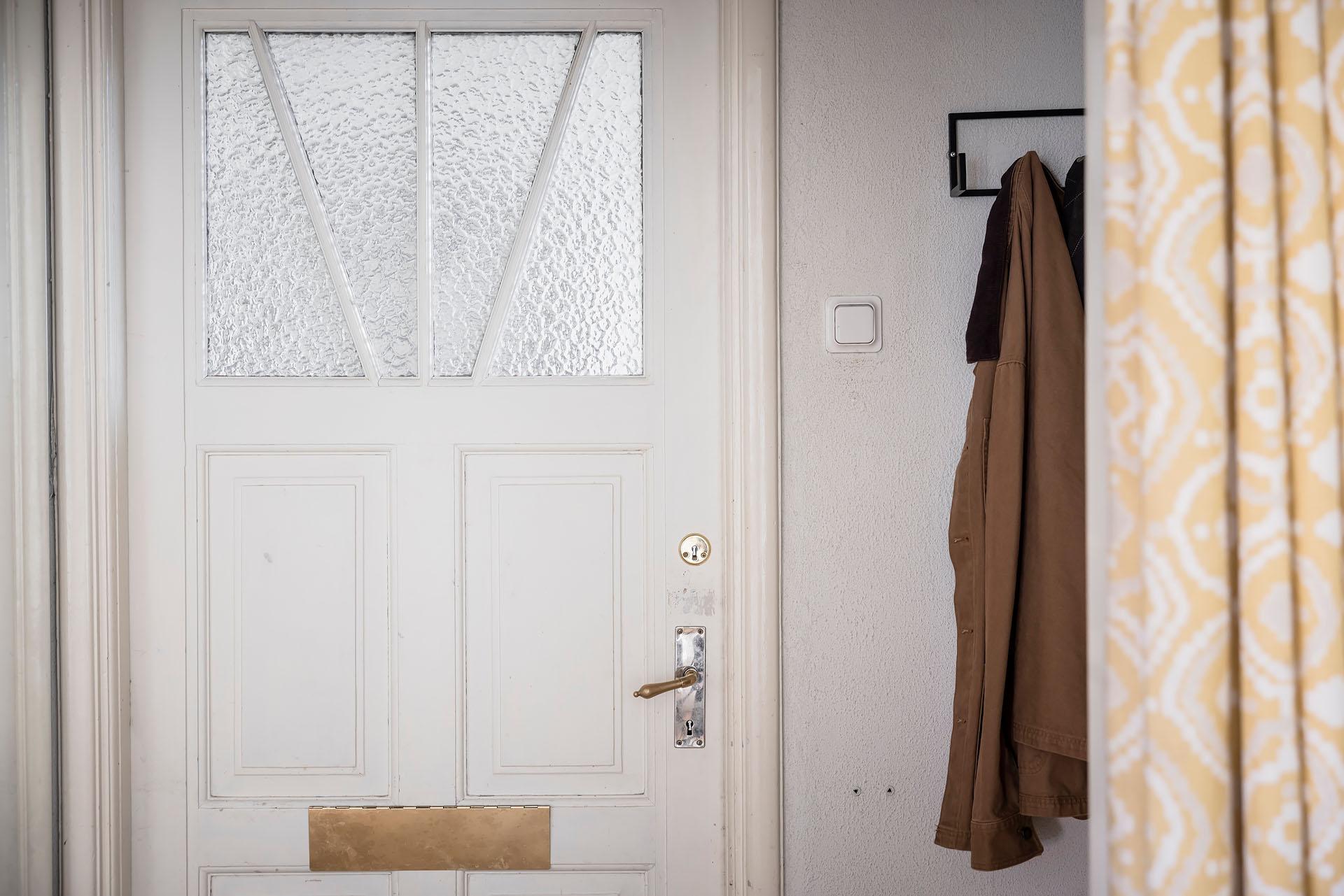 I den välkomnande tamburen hänger man av sig ytterkläderna under en hatthylla till vänster om ytterdörren – en vacker originaldörr med spröjsat fönsterglas som släpper in dagsljus från trapphuset. Till höger finns en rymlig dubbelgarderob. Golvet är belagt med fiskbensparkett och väggarna tapetserade med samma ljusa beige- och vitrandiga tapet som i vardagsrummet och den intilliggande inre hallen.