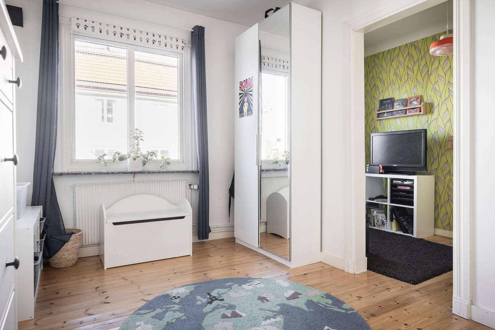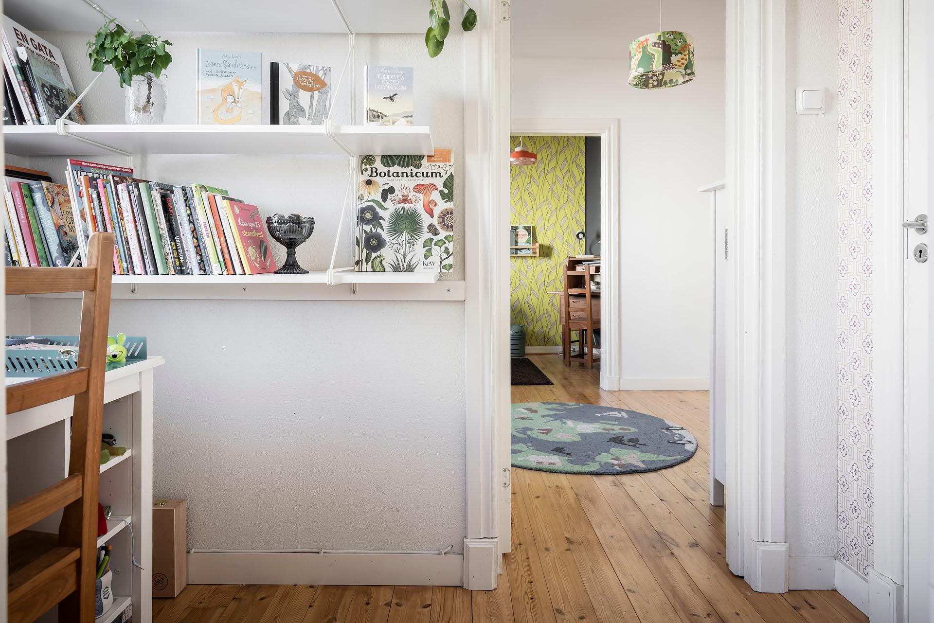 Passagen mellan köket och lägenhetens två innersta rum passar som nämnts bra som lek- och pysselrum för barnen, eller. Här finns även en klädkammare som idag inrymmer en frys. Väggarna är målade i vitt och tapetserade med en ljus mönstrad tapet. Det framtagna brädgolvet är lackat.