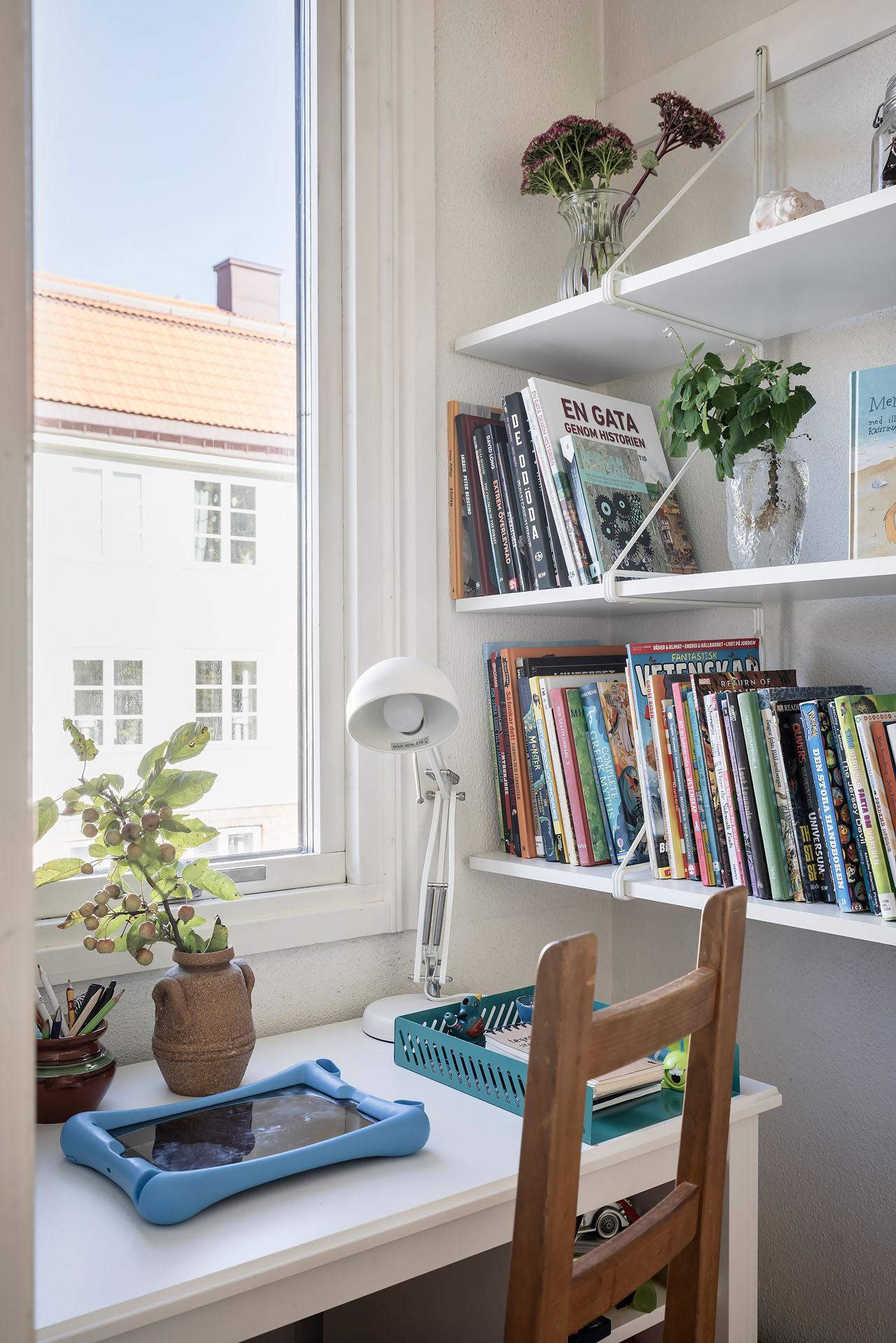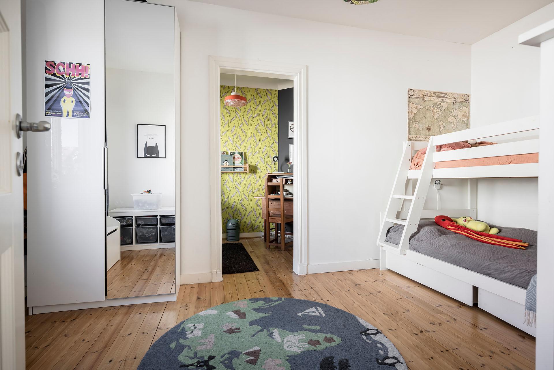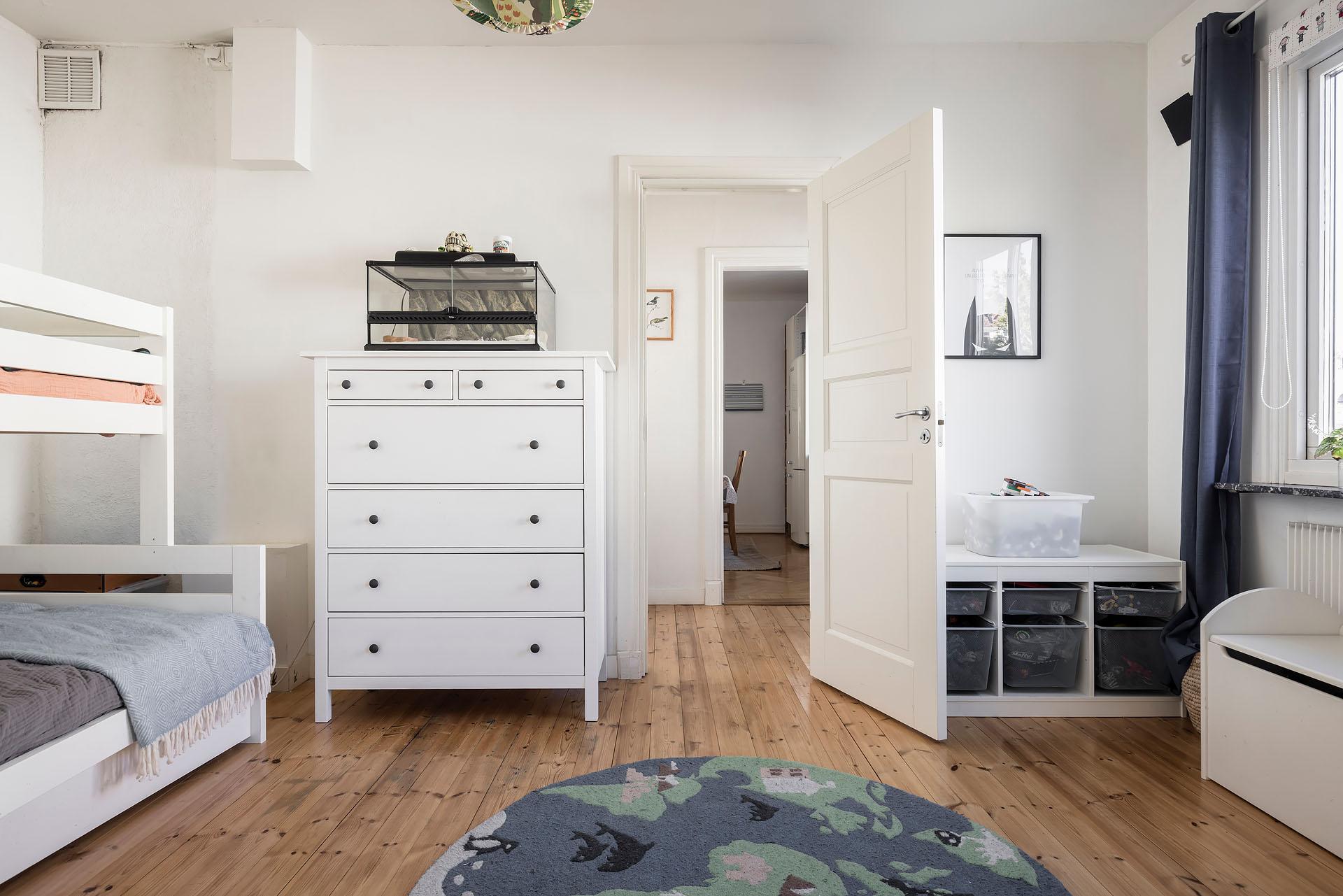 Det nuvarande barnrummet är ett lättmöblerat rum med gott om plats för säng, skrivbord och förvaring. Väggarna är vitmålade och det framtagna brädgolvet lackat.
