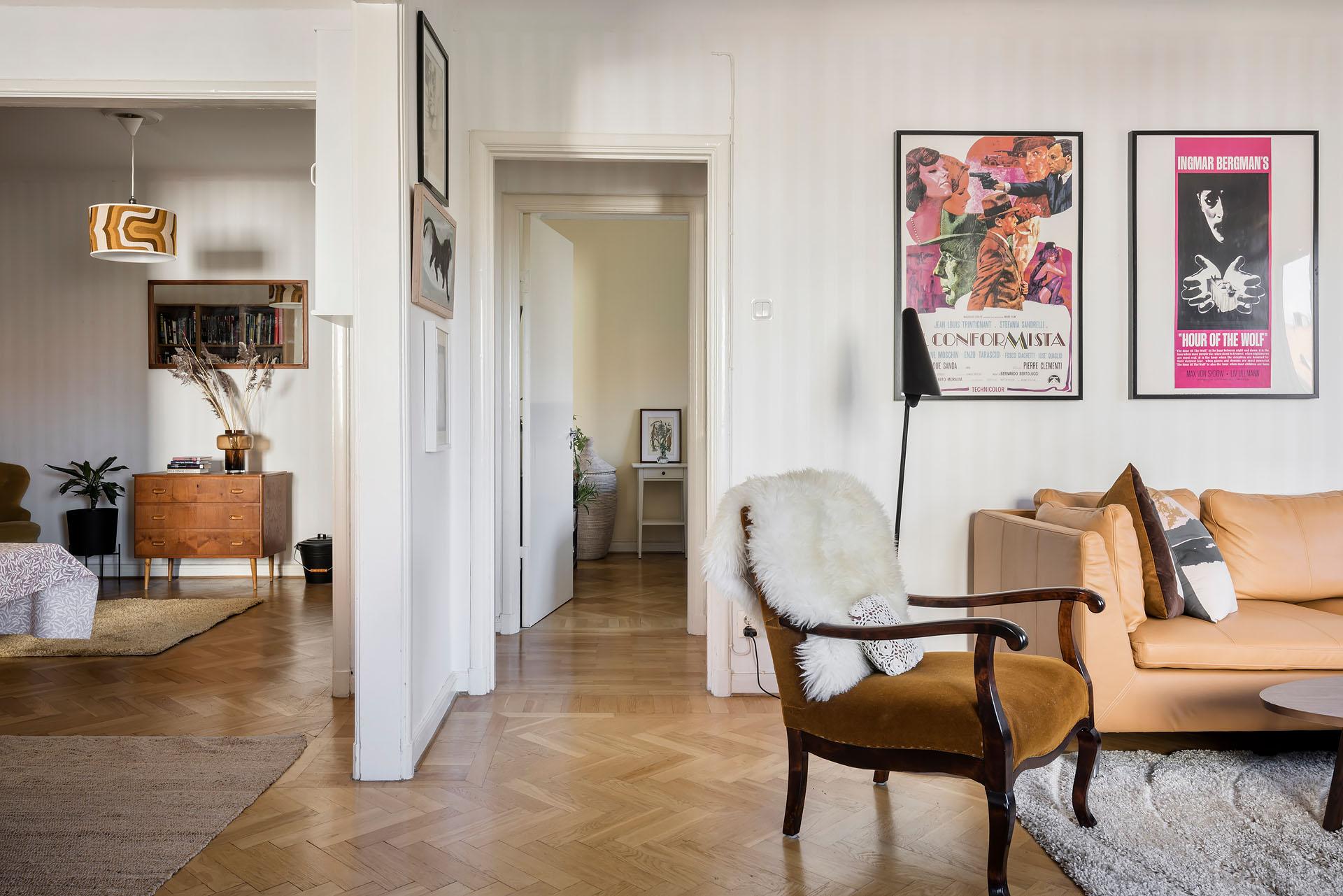 En harmonisk stämning vilar över lägenheten, och det knarrar mysigt när man går över den stiliga originalparketten. Dagsljuset har ett stort spelrum, och den generösa takhöjden ger en härlig känsla av rymd. Planlösningen är lika praktisk som tilltalande, och ypperliga förvaringsmöjligheter erbjuds i form av flera garderober. Den inre hallen kan med fördel inredas som ett hemmabibliotek med skrivbord och bokhyllor, och passagen mellan köket och de två innersta rummen passar bra som ett lek- och pysselrum för barnen, eller kontor.