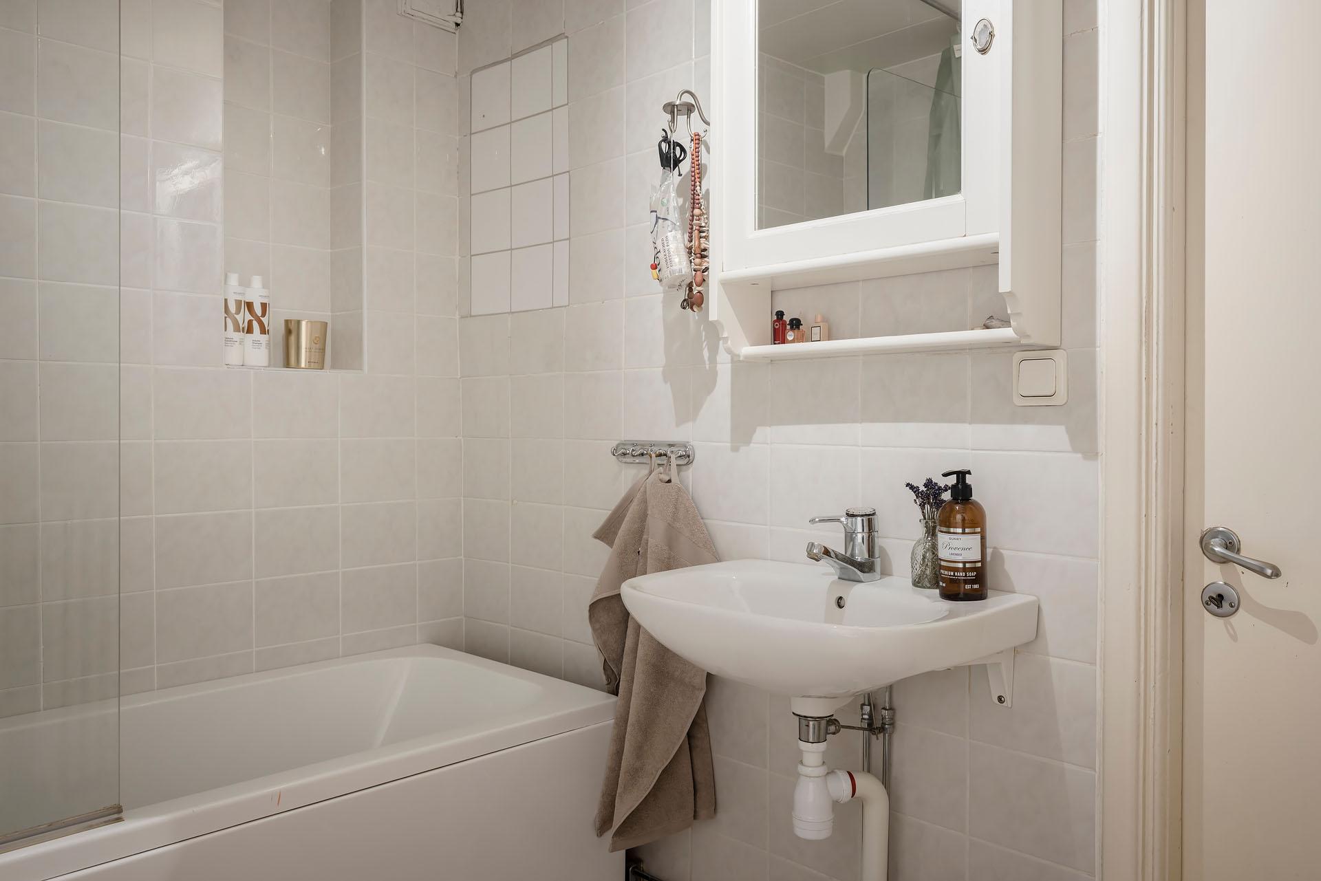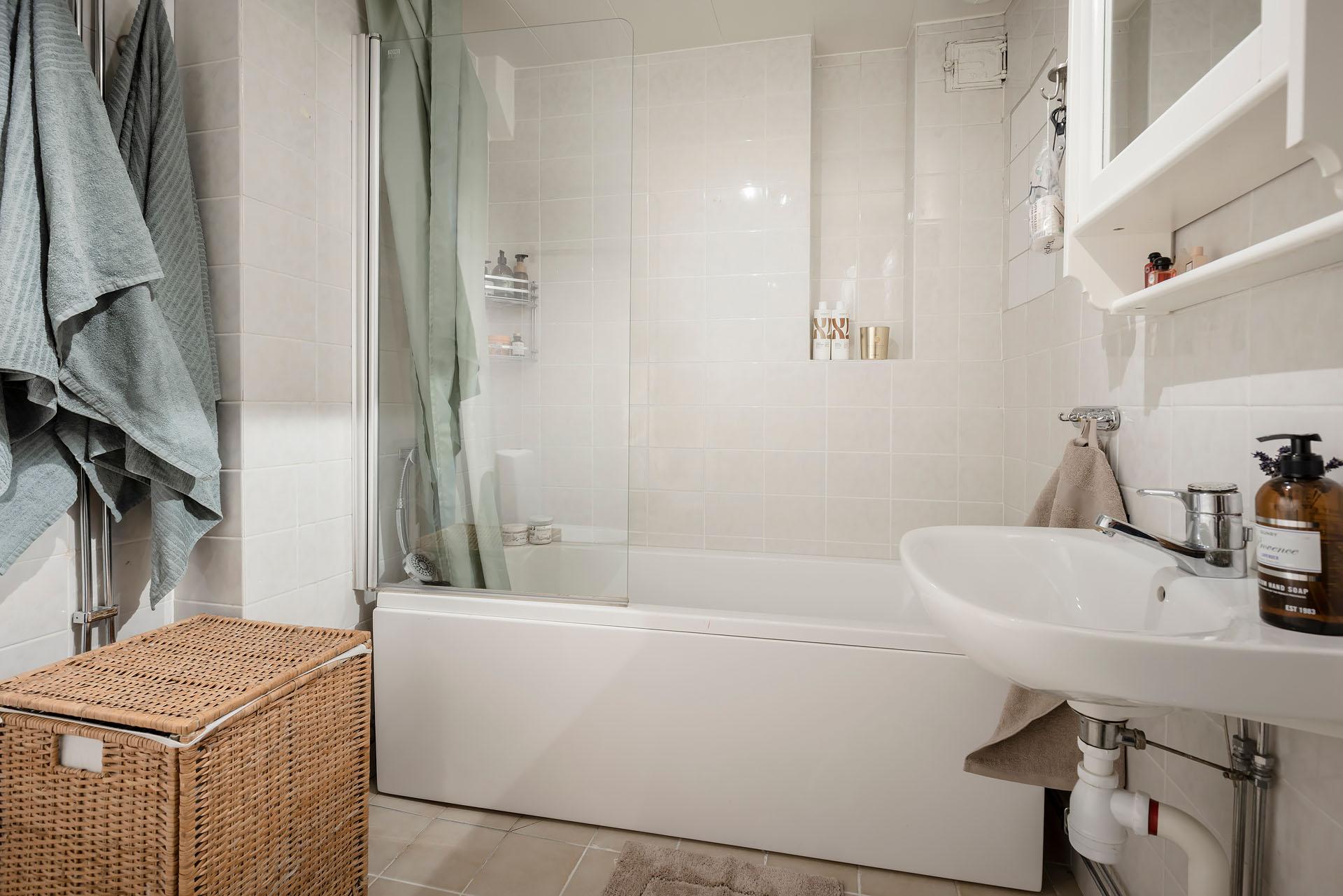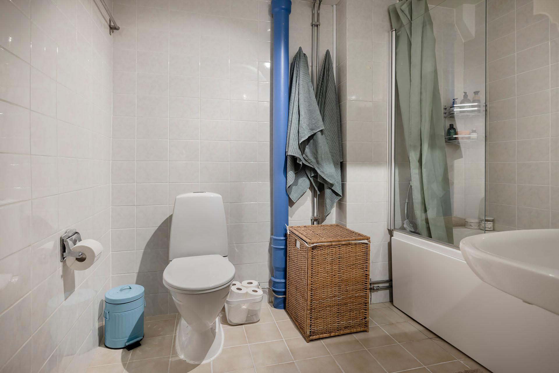 Badrummet, som nås direkt från lägenhetens tambur, inrymmer badkar, handfat, spegelskåp och toalett. Det är även förberett för att sätta in en tvättmaskin. Väggarna är klädda med ljusgrått kakel och golvet belagt med ljus gråbeige klinker.