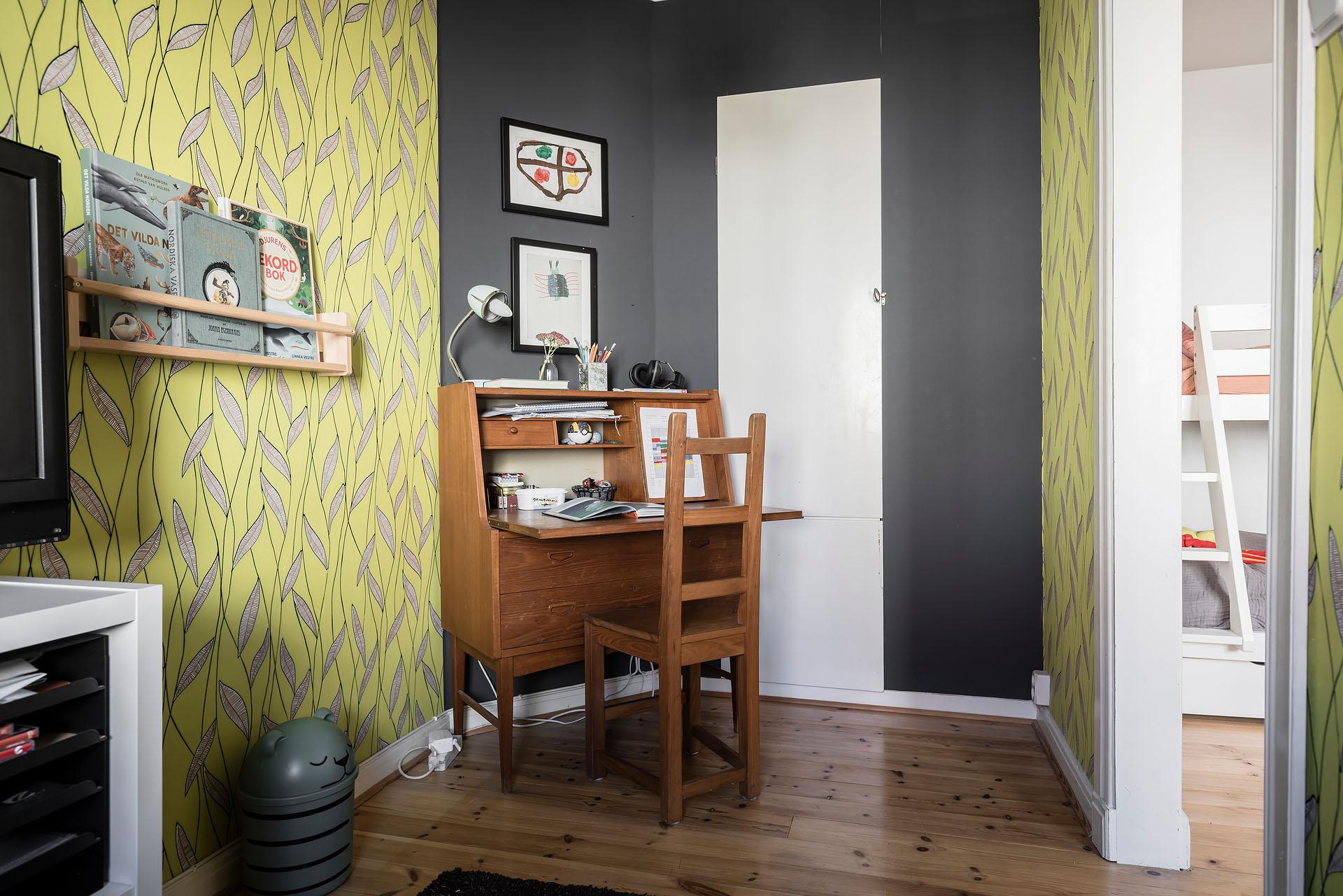 Rummet längst in används idag som studiehörna och gamingrum. Bra förvaringsmöjligheter finns i form av en inbyggd och rymlig garderob. Väggarna är målade i en mörk grågrön kulör och tapetserade med en mönstrad limegul tapet. Det framtagna brädgolvet är lackat.